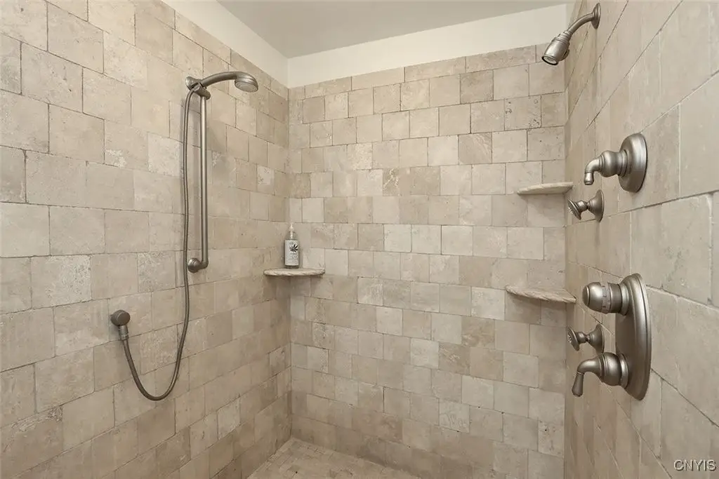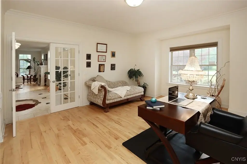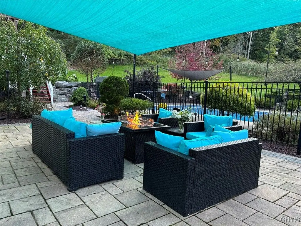 Expect to be impressed with this custom Colonial tucked at the end of a quiet cul-de-sac on 1.8 acres of beautifully landscaped grounds. The striking two-story foyer welcomes you with marble floors, a sweeping staircase and a stunning imported Asfour crystal chandelier. Gleaming hardwood floors, crown molding and bespoke millwork throughout create an atmosphere of refined elegance. A spacious home office with custom built-ins offers the optimal remote work setting. The open living and dining areas are divided by elegant columns, creating an ideal space for hosting. The living room features one of two gas fireplaces with a custom marble mantle, while the formal dining room is enhanced by wainscoting and a tray ceiling. The gourmet kitchen boasts a 10x5 granite island with breakfast bar, solid cherry cabinetry, GE Monogram stainless appliances, double ovens, dual dishwashers, walk-in pantry and casual dining area. The adjacent family room features a second fireplace, built-in media center, vaulted ceiling, slider to the back deck and a secondary staircase. Two powder rooms and a mudroom complete this level. Upstairs are four bedrooms, including the expansive primary suite with a generous walk-in closet and spa-like ensuite. Two bedrooms share a Jack-and-Jill bath and the fourth has a private bath. A convenient laundry center rounds out this floor. The finished walkout lower level adds 900 sq ft (included in total) and offers a full wet bar with wine rack, granite counters, fridge, dishwasher and ice makerC/B?B=perfect for entertaining. A custom home theater with built-ins sets the stage for movie nights and a bonus room plus full bath add even more versatility. Outside, enjoy a backyard oasis with an inground saltwater pool, expansive patio and a stone-faced outdoor kitchenC/B?B=fitting for summer gatherings. An upper deck overlooks the landscaped, tree-lined yard. Additional features include a whole-house security system, indoor/outdoor surround sound, lighted water feature and a large shed. Just minutes to Manlius Village, schools, shops and highways, this distinctive property showcases a refined blend of luxury, comfort and thoughtful design. Award-winning FM Schools!