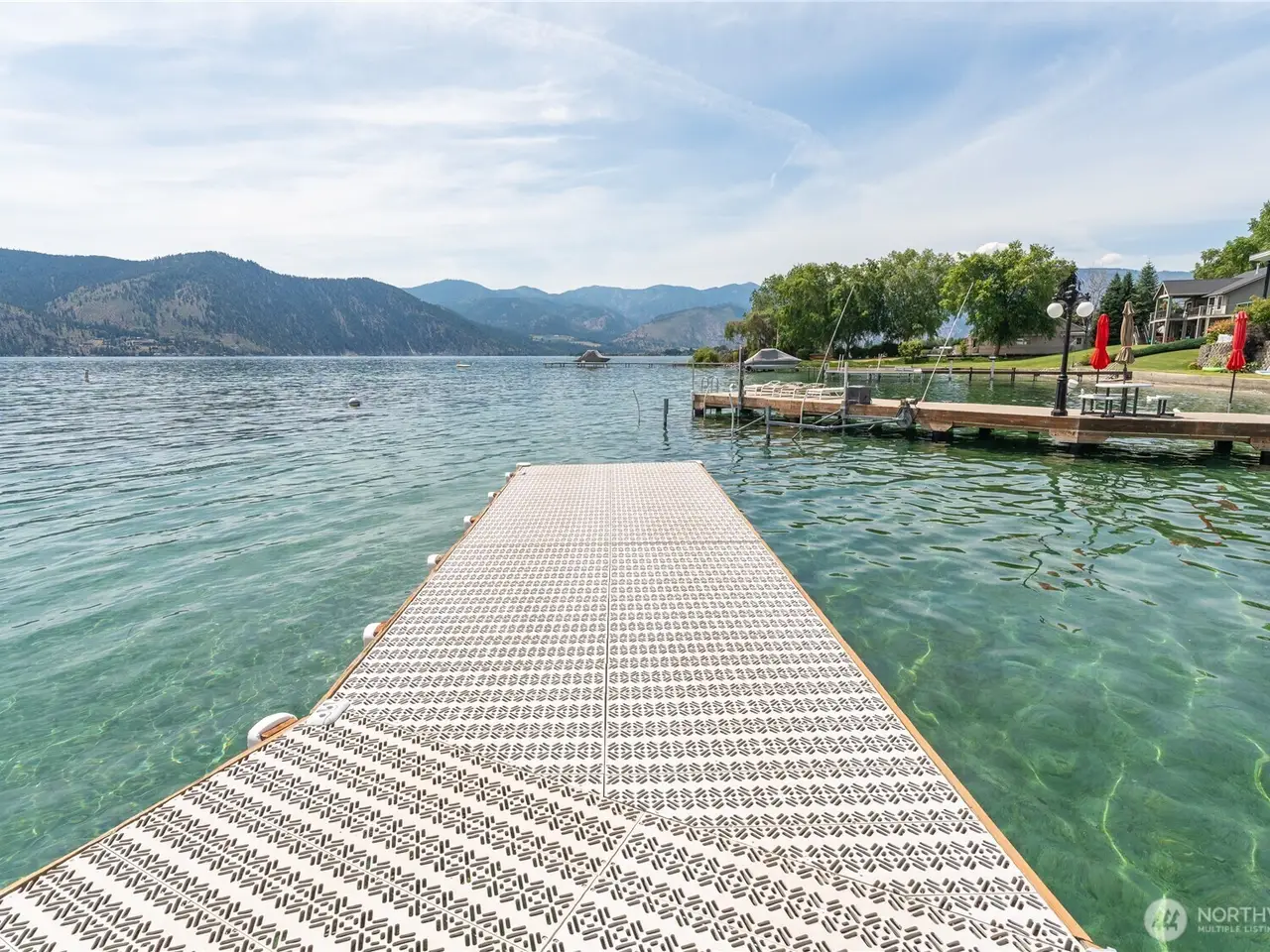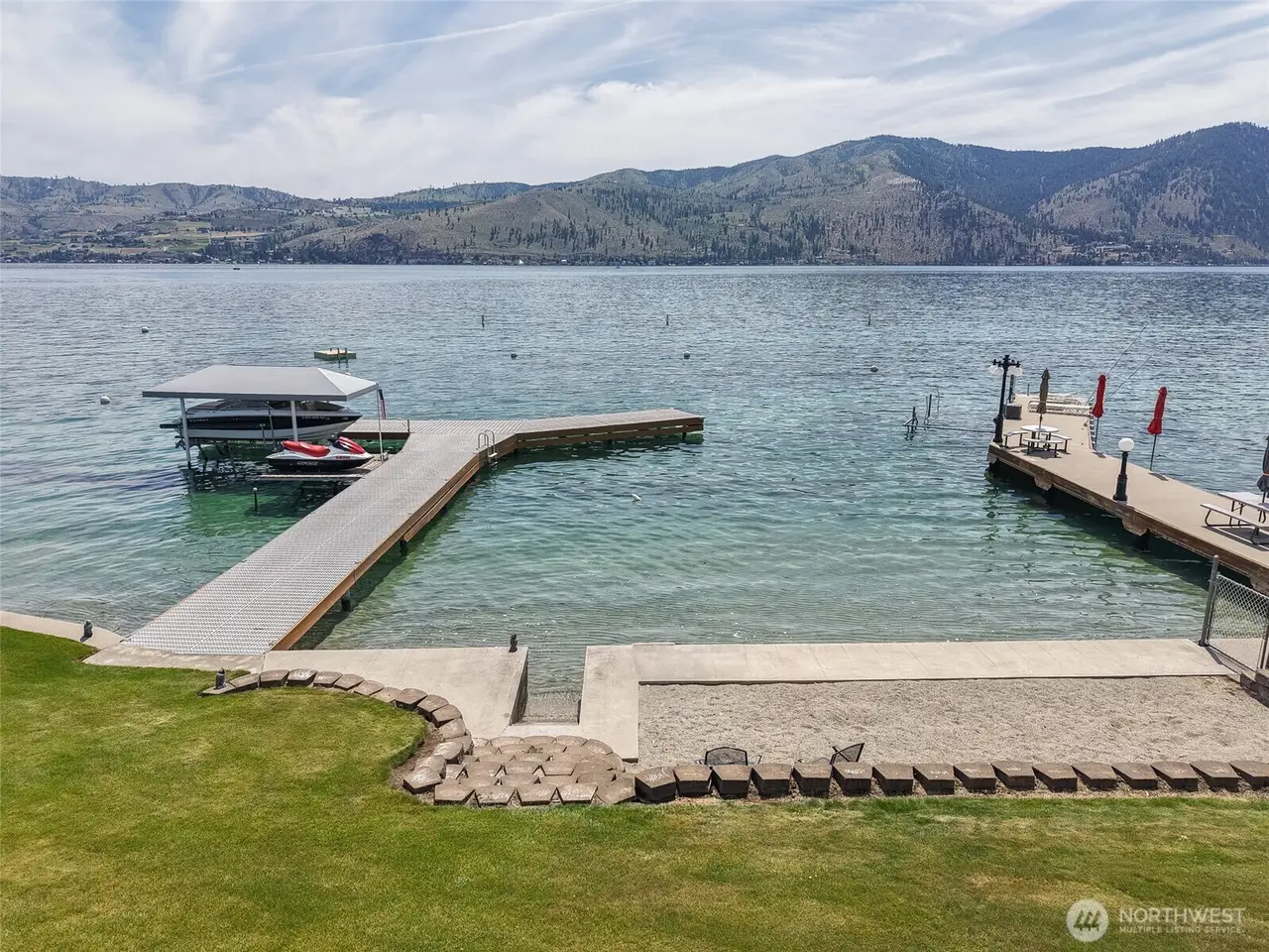 Welcome to 34 Leisure Lane! This rare .9-acre property boasts 56 feet of low bank waterfront with a concrete bulkhead and stairs to a sandy beach. Enjoy a resurfaced shared dock and a stunning, newer lake-facing deck off a charming three bed, two bath, 1,300 square foot home. Two lots (front and back) offer exceptional flexibility and space, including a three-bay shop, four RV hookups, and tons of parking. Mostly flat with a gentle slope - perfect for outdoor living and future development/building. Prime location with easy, level access off a paved road. On sewer, with LCRD domestic water and irrigation. One of the nicest stretches of real estate on Lake Chelan & amongst some incredible new homes and remodels. House plans by Complete Design can be included!
