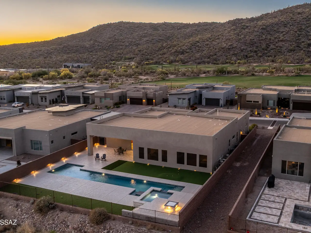 WOW best describes this stunning, relaxing, luxury-living-in-the-desert exquisite home at Fairfield's Boulder Bridge Pass. Owner has spared nothing to make this home the most inviting residence in the neighborhood. One of a kind 60ft heated lap pool let's you swim real laps- real exercise! Plus other casual entertainment: your own putting green & bocce ball court! Elevated spa & modern crushed glass firepit hosts beautiful mountain views. All at your own relaxing resort style home. No homes behind-natural desert buffer then the golf course beyond. Sunrise & sunset skies will mesmerize you at different times of the year. Panoramic mountain views throughout backyard. Deep & spacious under porch area + private (and rare for the subdivision) front courtyard. Great for private relaxation. + This Sycamore model has been modified to become a full 4 bedroom all w/private ensuite bathrooms - & of course an extra powder room. Grand open great room concept living. Spacious kitchen island bar, grand dining area, and additional private den or bonus room. Drop station as you enter the home through garage (which is an oversized 3 car garage w/tankless water heater. Expansive laundry room w/utility sink and mini mud room/hallway. Darkening room tight window shades in all bedrooms. Kitchen is state of the art w/LG stainless appliances. NO carpet in home! Stylish and modern 12'x8ft high corner meet Multi-Slide door in great room/dining. Clean, crisp & new. Home barely lived in. Still has new home feel! Lovely custom front landscape design just installed May 2025. This is a spectacular home - new and absolutely beautiful with basically nothing left to do but move in and enjoy your oasis resort style living in the desert!