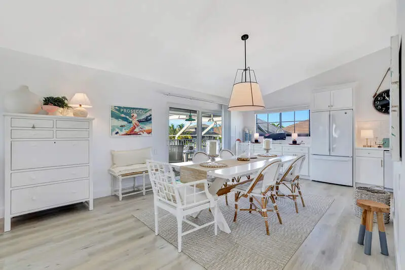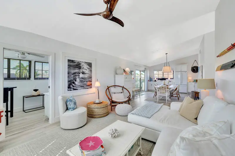 Enjoy waterfront living in this beautifully updated 2-bedroom plus den, 2-bath home on Marco Island. Located on an indirect Gulf-access canal with 100' on the water, the property features a private dock with boat lift, perfect for boating and fishing. Relax by the screened-in pool or take in the water views from the upper-level lanai. The light and airy interior offers an open floor plan with coastal-inspired finishes. The updated kitchen includes shaker cabinetry, solid surface counters, tile backsplash, farmhouse sink, and modern appliances. The den provides flexible space for a home office or guest room, while the primary suite offers comfort and style. Designed for the Florida lifestyle, this home offers multiple outdoor living spaces, impact windows, and a beautifully landscaped yard. Ideally located near Marco Island's beaches, shopping, and dining.