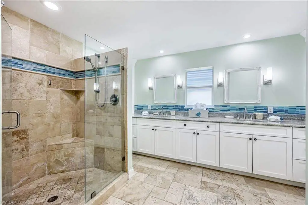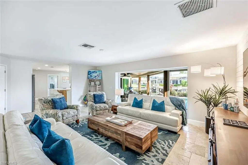 Steps from Tigertail Beach lies this coastal retreat that captures the essence of island living with effortless style and comfort. Completely reimagined from top to bottom with over $300,000 in thoughtful updates, this 3 bedroom, 3 bath home is move-in ready and built to impress. Behind its charming nautical exterior lies a light-filled open layout featuring a comfortable living area, dining space, and inviting family room with volume ceilings accented by a striking stone fireplace and warm cedar ceiling details. The gourmet kitchen showcases crisp white shaker cabinetry, quartz counters, stainless-steel appliances, and a large island perfect for entertaining. The primary suite has dual closets, and a stunning spa-inspired bath with a walk-in glass and tile shower, and granite countertops. Step outside to the expansive lanai with cedar ceiling trim, a saltwater pool, and a paver deck framed by a panoramic screen enclosure. Boating enthusiasts will appreciate two docks with a 12,000-lb lift, reinforced seawall, and an elevated sun deck ideal for relaxing by the water. Modern upgrades include stone flooring throughout, impact windows and sliders, a new roof in 2022, updated electrical and plumbing systems, and a newer A/C. With no storm damage, complete storm protection, and a premier location within walking distance to Tigertail Beach and north of Collier Boulevard, this property is not only an ideal full-time residence but also a top choice for rental income.