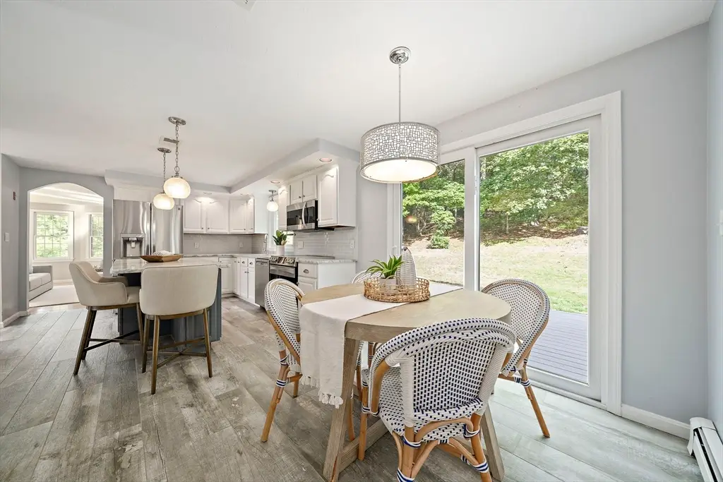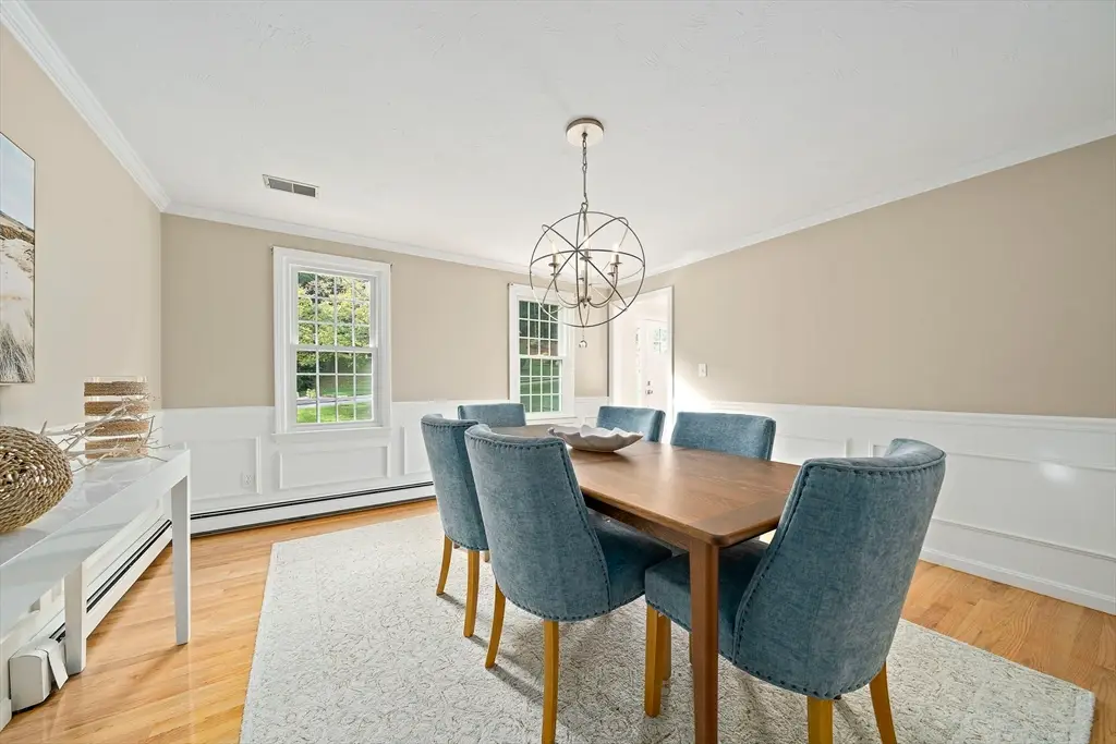 Gorgeous center-entrance Colonial in one of North Marshfield's most desirable neighborhoods! This classic yet inviting home offers a front-to-back living room and a spacious dining room, both with gleaming hardwood floors. The bright eat-in kitchen, featuring stainless steel appliances and an island, opens seamlessly to a private backyard retreat with a Trex deck and stone patioùperfect for entertaining or simply relaxing in total privacy. Upstairs, enjoy versatile living with four bedrooms, or configure as three plus a home office or great room to fit your lifestyle. The finished lower level, complete with a bar, sets the stage for fun gatherings. Recent updates include refinished first-floor hardwoods, a newer roof, newer heating system, new central air, and a beautifully remodeled primary bath. Blending timeless design with modern upgrades, this home truly has it all - space, style, and location.