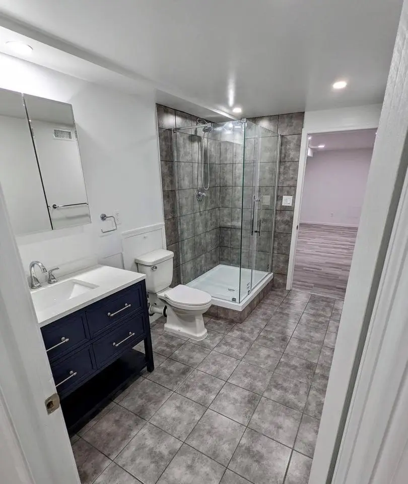 Spa-like bath with dual vanities, glass-enclosed shower, and soaking tub
