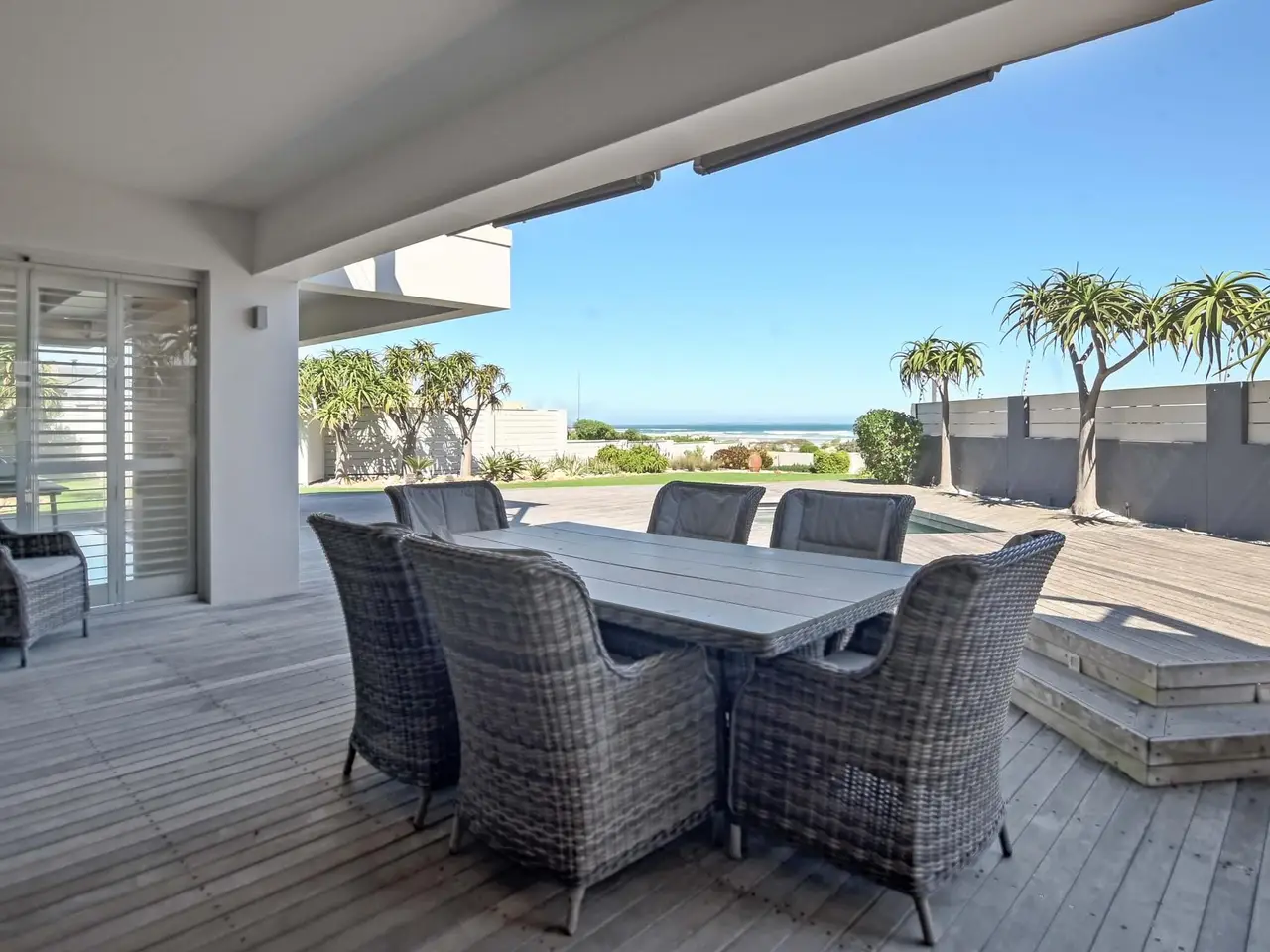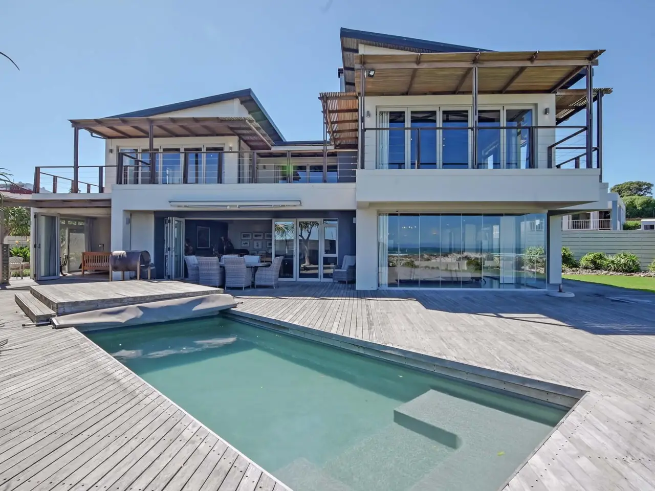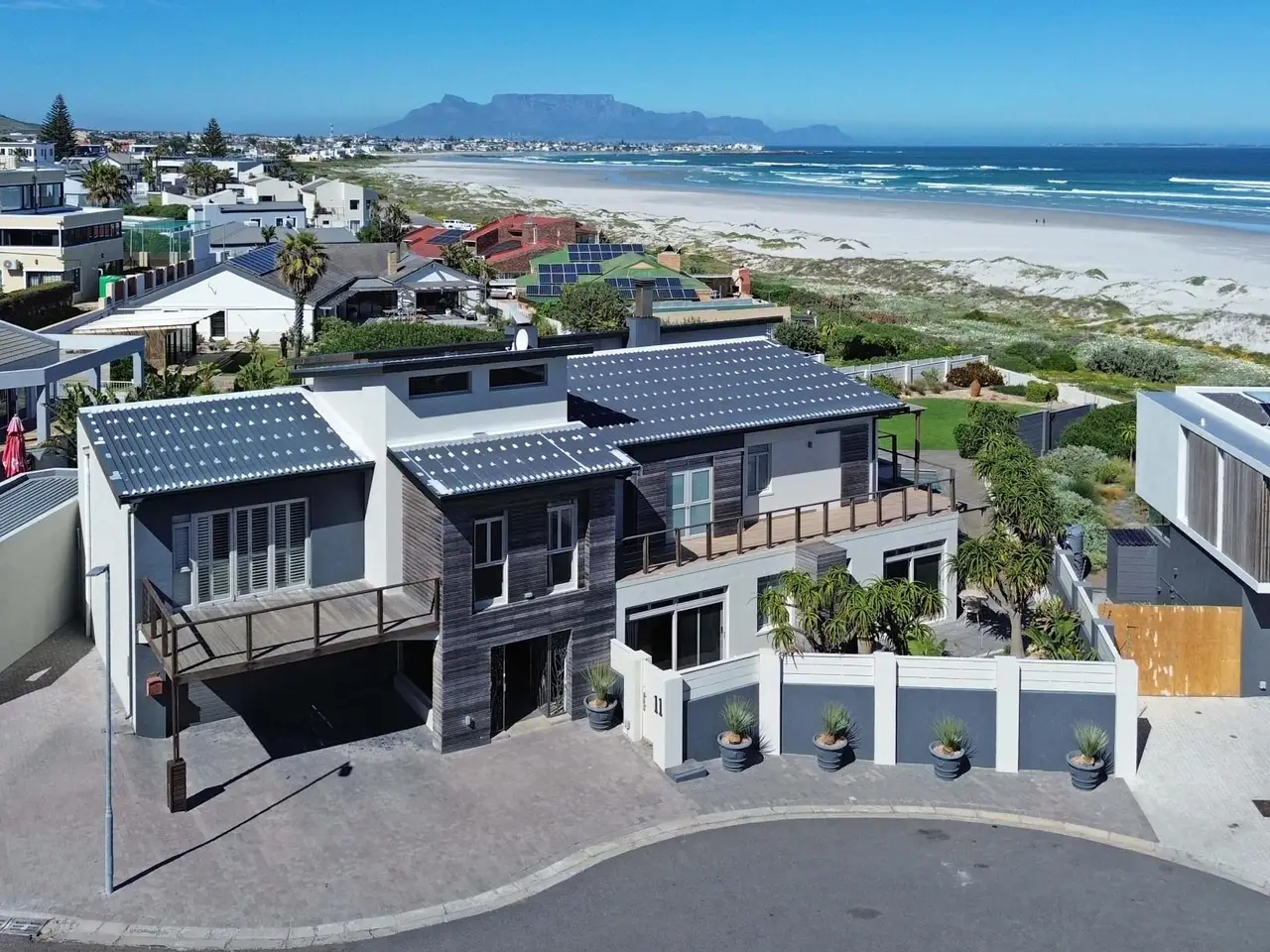 A Coastal Masterpiece in Melkbos Positioned directly on the beachfront, this double-storey villa captures uninterrupted views of the Atlantic Ocean with Table Mountain as its backdrop. Nestled in an exclusive cul-de-sac, it offers both privacy and prestige in one of Melkbosstrand's most sought-after locations. Sophisticated Living Floor-to-ceiling glass defines the architecture, seamlessly drawing the ocean and mountain into the home from every angle. Natural light floods the open-plan interiors, while expansive lounges and a formal dining area flow effortlessly into an indoor braai. Whether entertaining or relaxing, every moment is framed by sweeping views. Private Accommodation Six en-suite bedrooms provide comfort and seclusion. On the ground floor, two generous suites open directly to the garden, ideal for guests or multi-generational living. Upstairs, the master suite captivates with panoramic views and a must-see walk-in closet, while the remaining bedrooms share a stylish lounge and large balcony overlooking the ocean. Outdoor Elegance Stacking glass doors dissolve the boundary between indoors and out, opening onto a landscaped garden, sparkling pool, and an expansive Balau deck set directly against the beach. Here, uninterrupted sunsets and the rhythm of the waves define a lifestyle of year-round coastal living. Key Features Six en-suite bedrooms Pool with Balau deck directly against the beach Double garage plus secure additional parking Indoor braai Gourmet kitchen with walk-in pantry, scullery, and utility areas Well-point water system & three-phase power Exclusive beachfront position in a private cul-de-sac This residence is more than a home - it is one of Melkbosstrand's most exceptional beachfront properties, a true signature of prestige and a legacy to be treasured for generations.