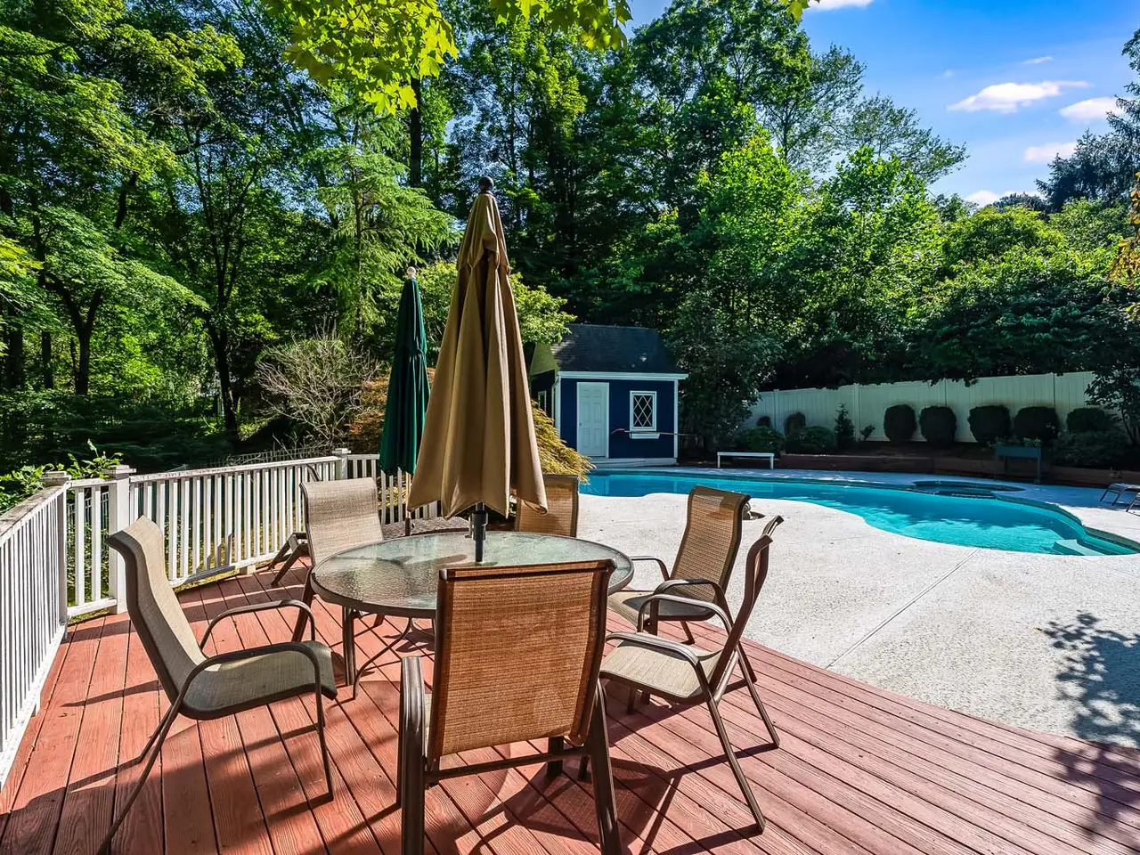 Welcome to this breathtaking ranch-style retreat, ideally situated on a quiet, private cul-de-sac in desirable Mendham Township. Step into the grand foyer, where soaring ceilings, exposed wood beams, and floor-to-ceiling windows flood the space with natural light, setting the tone for this expansive and inviting home. Designed for both tranquility and functionality, this 4-bedroom ranch offers the ease of single-level living with luxurious touches throughout. Enjoy the custom gourmet kitchen outfitted with high-end stainless steel appliances, flowing seamlessly into a dramatic dining room, perfect for hosting gatherings. Just beyond, a charming side porch offers peaceful views of the lush, tree-lined backyard. At the heart of the home is the living room, featuring striking wood beams, oversized windows, and a cozy fireplace, making it the perfect space to relax or entertain. The main level includes three spacious bedrooms with a serene primary suite and spa-inspired bath. Downstairs, the walk-out lower level offers exceptional versatility with a large billiards room, a home gym, private office, fourth bedroom and a fully equipped in-law suite with a kitchenette and its own entrance. Step outside to enjoy the beautifully landscaped grounds, complete with a bluestone patio and a sparkling pool surrounded by nature creating a true resort-like atmosphere in your own backyard. Located on the east side of town with direct access to Patriot's Path, this home combines convenient one-floor living, a peaceful setting, and a premier location. A rare opportunity not to be missed.