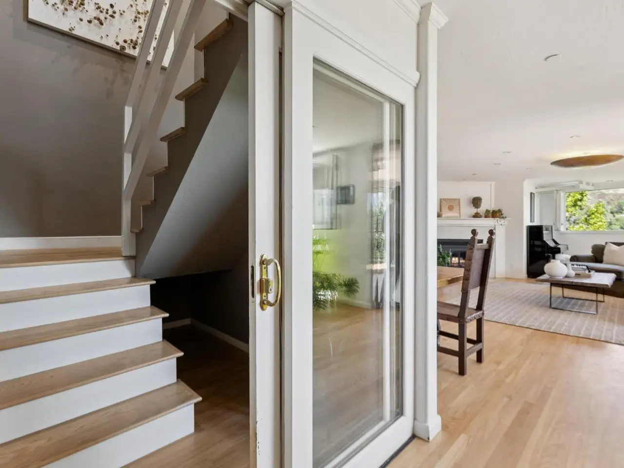 This stunning custom four-bedroom, five-bath home on prestigious Middle Ridge delivers the quintessential Marin lifestyle with sweeping views spanning the surrounding hills to Angel Island, the Bay, and downtown San Francisco. Entertain effortlessly on multiple decks, including the main deck accessible through custom moveable glass doors from the expansive great room featuring living, dining, and gourmet kitchen areas. The chef's kitchen showcases elegant Italian marble countertops, top-tier appliances, and exquisite custom mahogany Berkeley Mills cabinetry. Two sunny main-level bedrooms each offer en-suite baths, while the private upper-level primary suite captures incredible vistas from dual private decks, one featuring a spa tub and outdoor shower. This indulgent retreat includes a luxurious bath, wood-burning marble fireplace, oversized walk-in closet, and dedicated office and exercise areas. A versatile guest suite with separate entrance provides flexible living options. Premium features include hardwood floors throughout and owned solar panels. Situated on a tranquil, sun-drenched avenue mere minutes from downtown Mill Valley's award-winning schools and world-renowned hiking and biking trails.