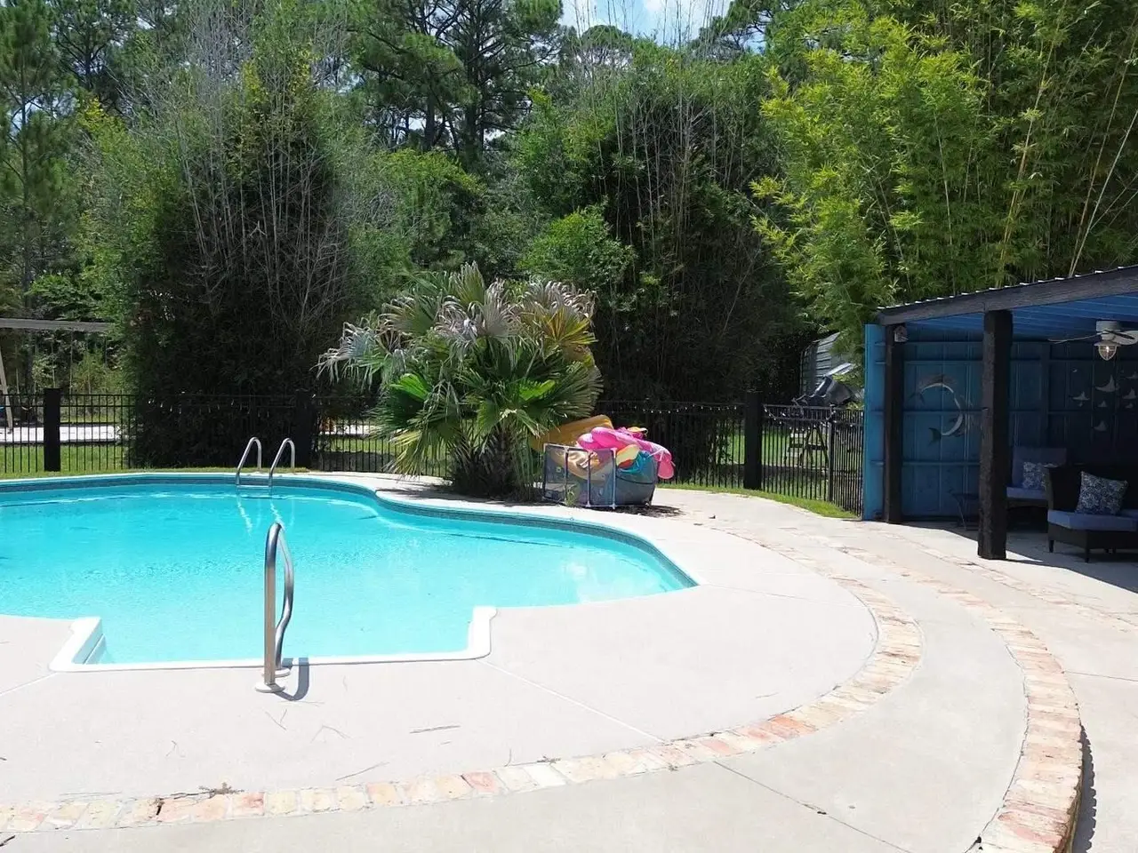 This Garcon Point-Milton expansive property could be an entertainer's dream, an event venue property for weddings or conferences, a multi-generational family compound, or income producing (AirBnB). The homes are a Tuscan-style main house, a guest house, and a studio cottage. Solar panels help reduce electricity costs! The main house has three bedrooms and baths with unique custom details like 'Henry' stained glass, cypress beamed ceilings, and a wood-burning stove. Its open layout connects living, dining, and kitchen areas to various porches, perfect for gatherings. A large loft offers versatile space. The guest house is fully furnished with two bedrooms, one bath, and a full kitchen, while the studio cottage provides a kitchenette, bath, and a screened porch with pond views. Both could be income producing! Outdoor amenities include an entertaining pavilion, a dining/cooking shack, a pool oasis with a cabana and fire pit, and a Rainbow swing set. Children love this property! Overlooking the self-watering pond are a gazebo and dock. The property also has a workshop, garden shed, raised garden beds, and a metal garage for extra storage or vehicles. It's conveniently located in quiet rural area just three miles south of I-10... including a local marina 5 minutes away to launch your boat!