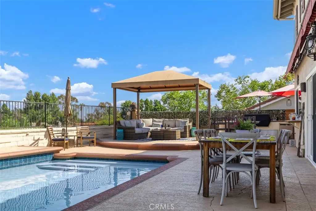 Outdoor living space with built-in BBQ, awnings, and gazebo