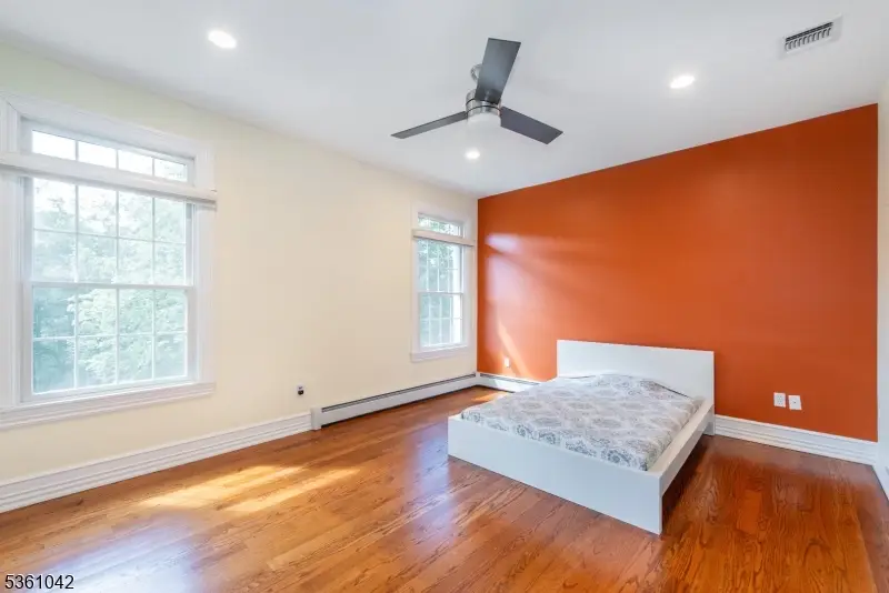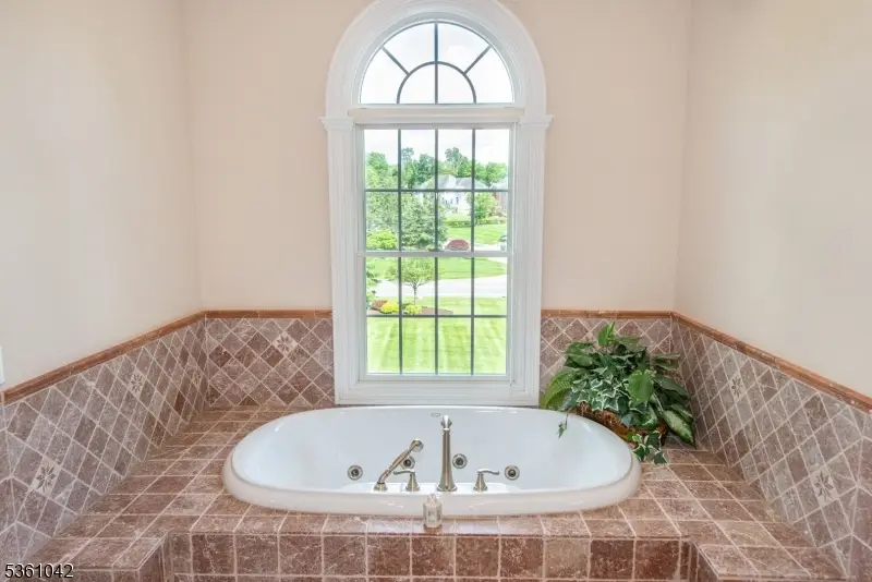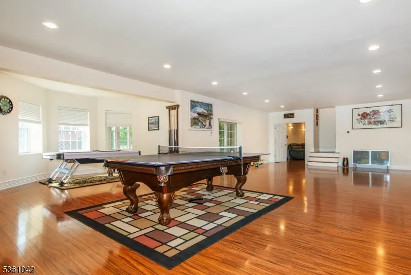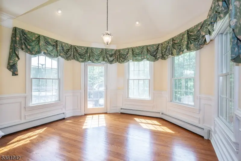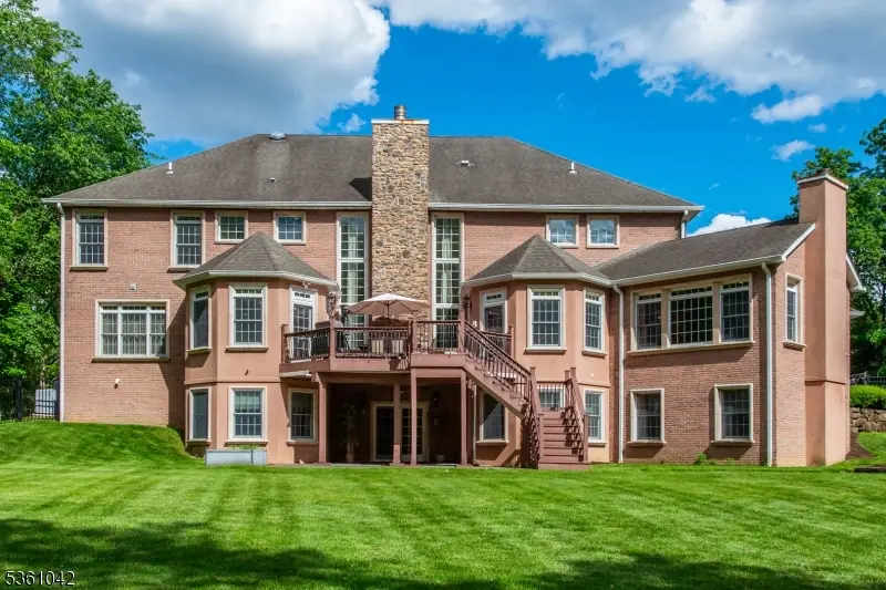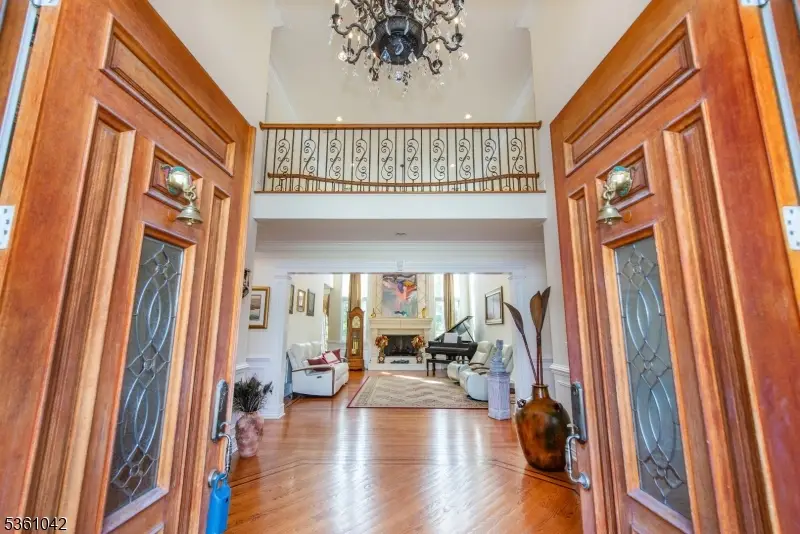 WOW factor! Discover this stunning 6-bedroom, 5.5-bath, 5.6 acre home, featuring a full brick/ stucco exterior, w/solar power, soundproof construction, circular driveway, and a 3-car garage. Built in 2010, this East-facing residence offers luxurious living with 9-foot ceilings on every floor and hardwood floors throughout, including inlaid wood accents. The two-story foyer, with chandelier adds a dramatic touch. The home includes two laundry rooms, spacious kitchen with granite countertops, a Viking 6-burner range, Sub-Zero fridge/freezer, heated tile floors, custom cabinetry, pot filler, large center island with eat-in area and formal dining room.. The family room features fireplace, custom moldings, inlaid wood floors, and coffered ceilings. A two-story living room is adorned with custom moldings, fireplace and an elegant chandelier. Additional den with double French doors and coffered ceiling and 1st fl primary suite with sitting area, walk-in closets and full en suite bathroom. Upstairs, the en suite bedroom includes an attached bath, while two additional bedrooms share a Jack-and-Jill bathroom. The bridge offers access to the 2nd fl primary suite offers high ceilings, hardwood floors, a wet bar, walk-in closet, and a luxurious custom bath with a Jacuzzi tub, double sinks, and a stand-up shower. access to a Trex deck overlooking fenced yard. The finished walkout basement has additional bath, a bedroom (currently a gym), a large rec room, and a home theater room. Four-zone AC/heat.