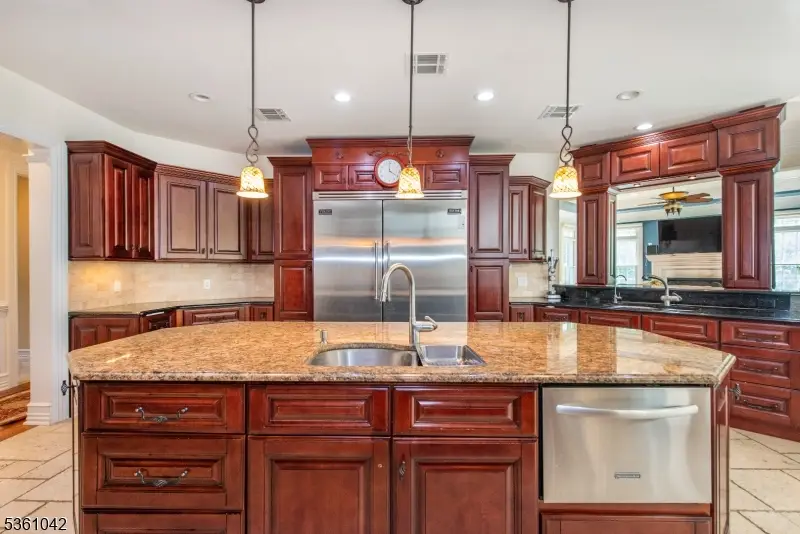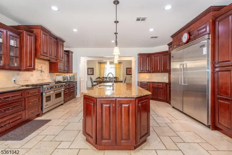 Spacious kitchen with granite countertops, Viking range, and Sub-Zero fridge