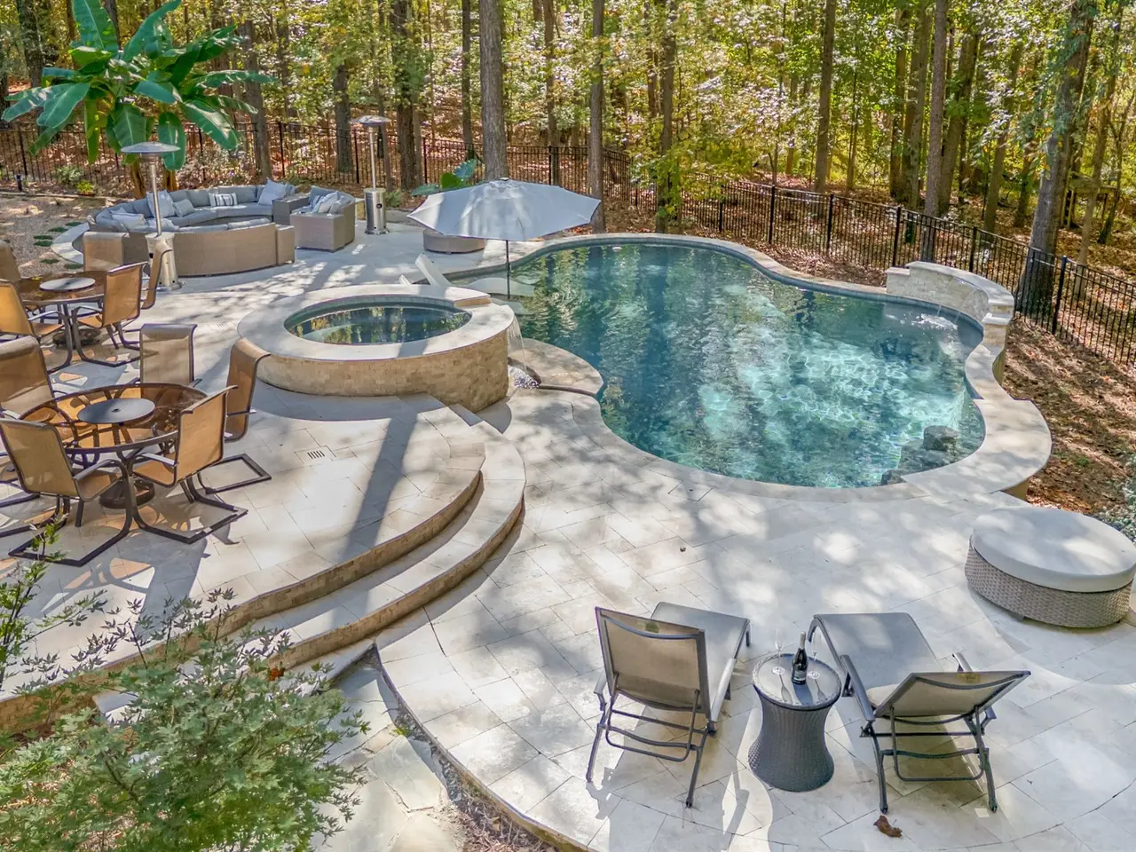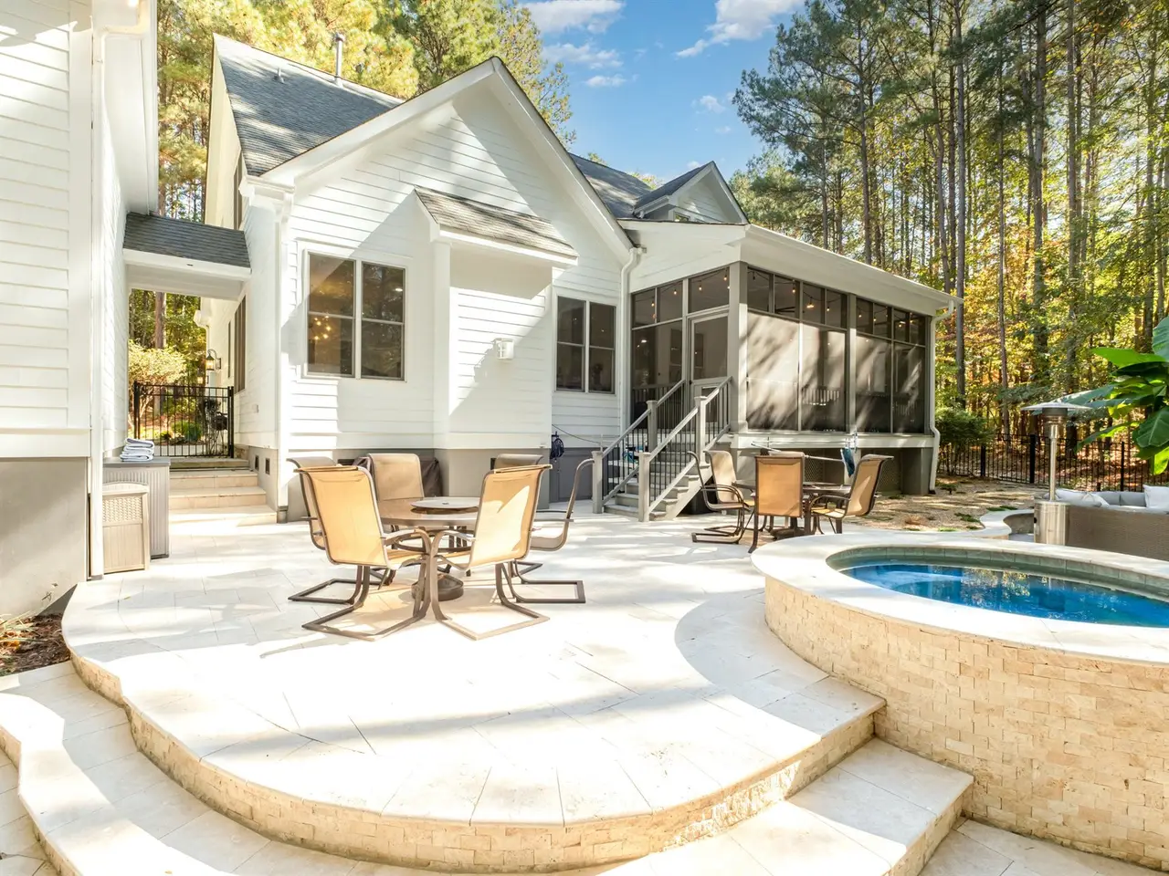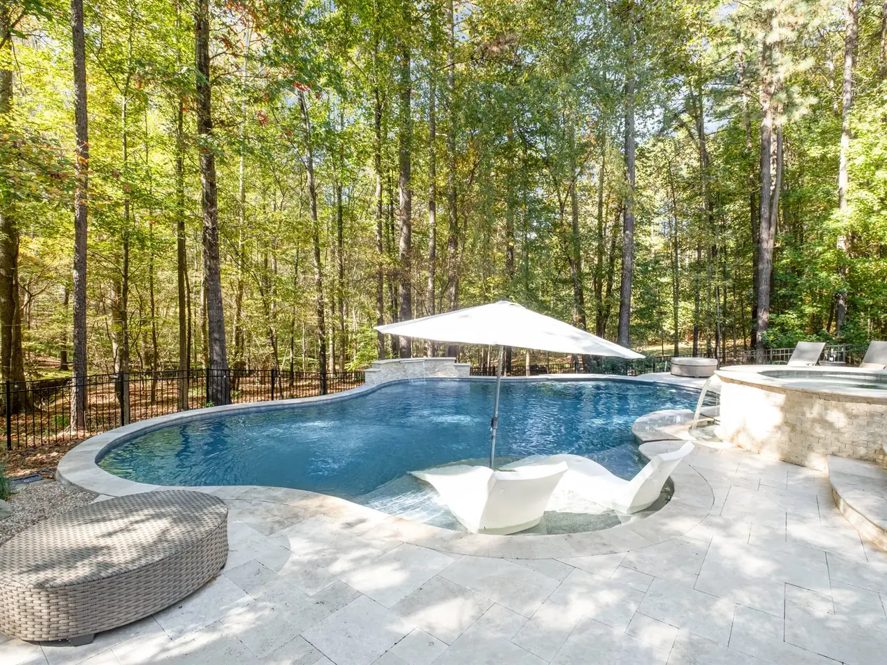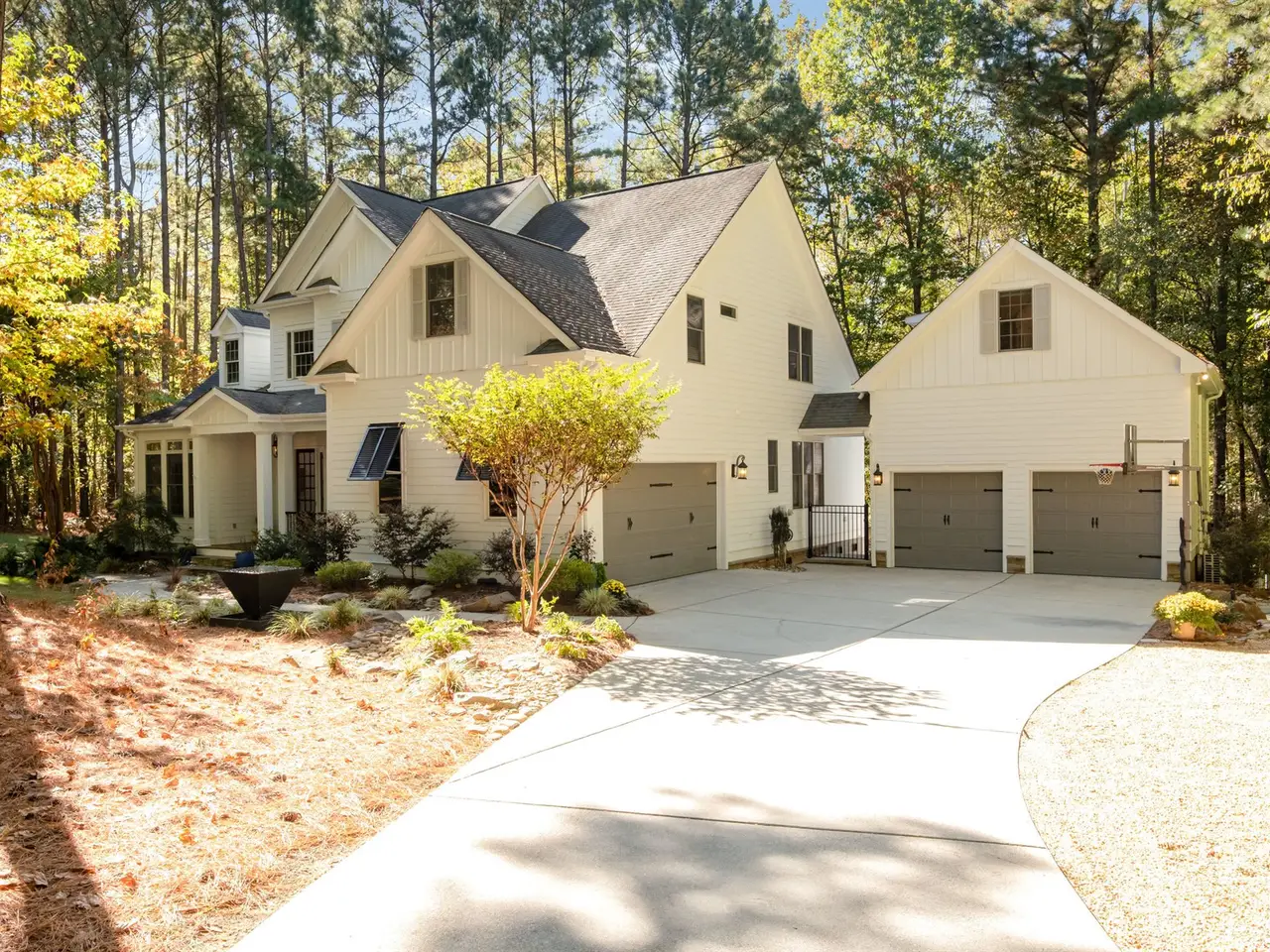 This modern luxury estate in The Farms offers true resort living on 2.1 private acres. Bordered by protected water-company land and community greenway, it's one of the most private homes in the neighborhood. The 4BR/3.5BA main home features soaring ceilings, hardwoods throughout (no carpet), designer lighting, neutral paint, and a newly built-in bar. The chef's kitchen includes a 48" gas range with double ovens, drawer microwave, and custom cabinet pantry. A double-sided fireplace opens to a screened deck overlooking the 40' heated saltwater pool with 7' depth, swim-up bar, and 8+ person spa. Outdoor features include stone walkways, bonfire pit. One of the few properties in The Farms with a carriage house, the detached carriage house offers a studio-style space with kitchenette, bath, washer/dryer hookups, and dual-zone mini-split that also temp-controls the garage. Main home has two HVAC units and two hot water tanks, plus a third serving the carriage house. Both garages feature lift-ready ceilings. The Farms amenities include clubhouse, pool, tennis, pickleball, soccer fields, holiday events, and boat/RV storage available. Lake Norman access is just minutes away.
