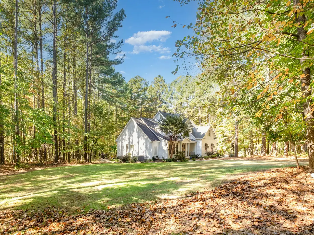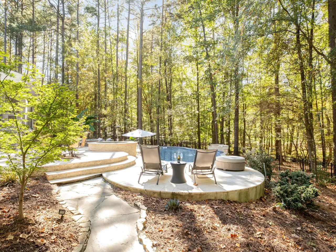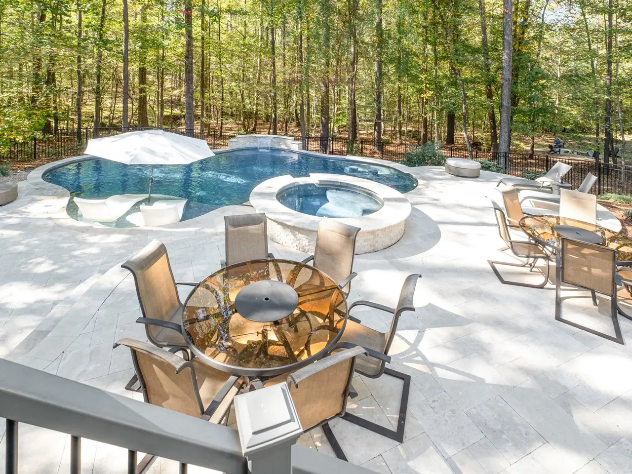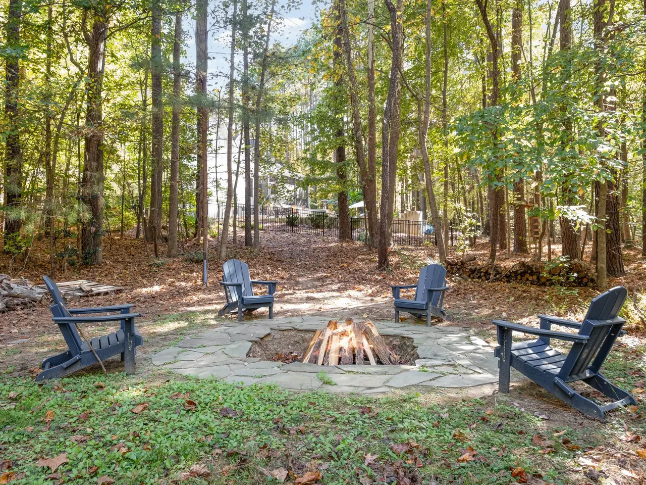 This modern luxury estate in The Farms offers true resort living on 2.1 private acres. Bordered by protected water-company land and community greenway, it's one of the most private homes in the neighborhood. The 4BR/3.5BA main home features soaring ceilings, hardwoods throughout (no carpet), designer lighting, neutral paint, and a newly built-in bar. The chef's kitchen includes a 48" gas range with double ovens, drawer microwave, and custom cabinet pantry. A double-sided fireplace opens to a screened deck overlooking the 40' heated saltwater pool with 7' depth, swim-up bar, and 8+ person spa. Outdoor features include stone walkways, bonfire pit. One of the few properties in The Farms with a carriage house, the detached carriage house offers a studio-style space with kitchenette, bath, washer/dryer hookups, and dual-zone mini-split that also temp-controls the garage. Main home has two HVAC units and two hot water tanks, plus a third serving the carriage house. Both garages feature lift-ready ceilings. The Farms amenities include clubhouse, pool, tennis, pickleball, soccer fields, holiday events, and boat/RV storage available. Lake Norman access is just minutes away.