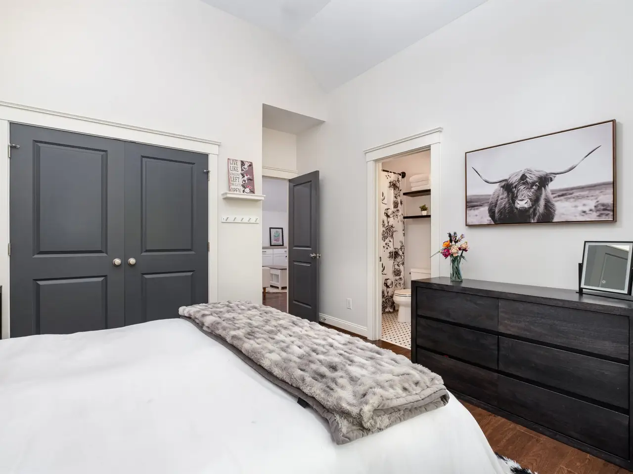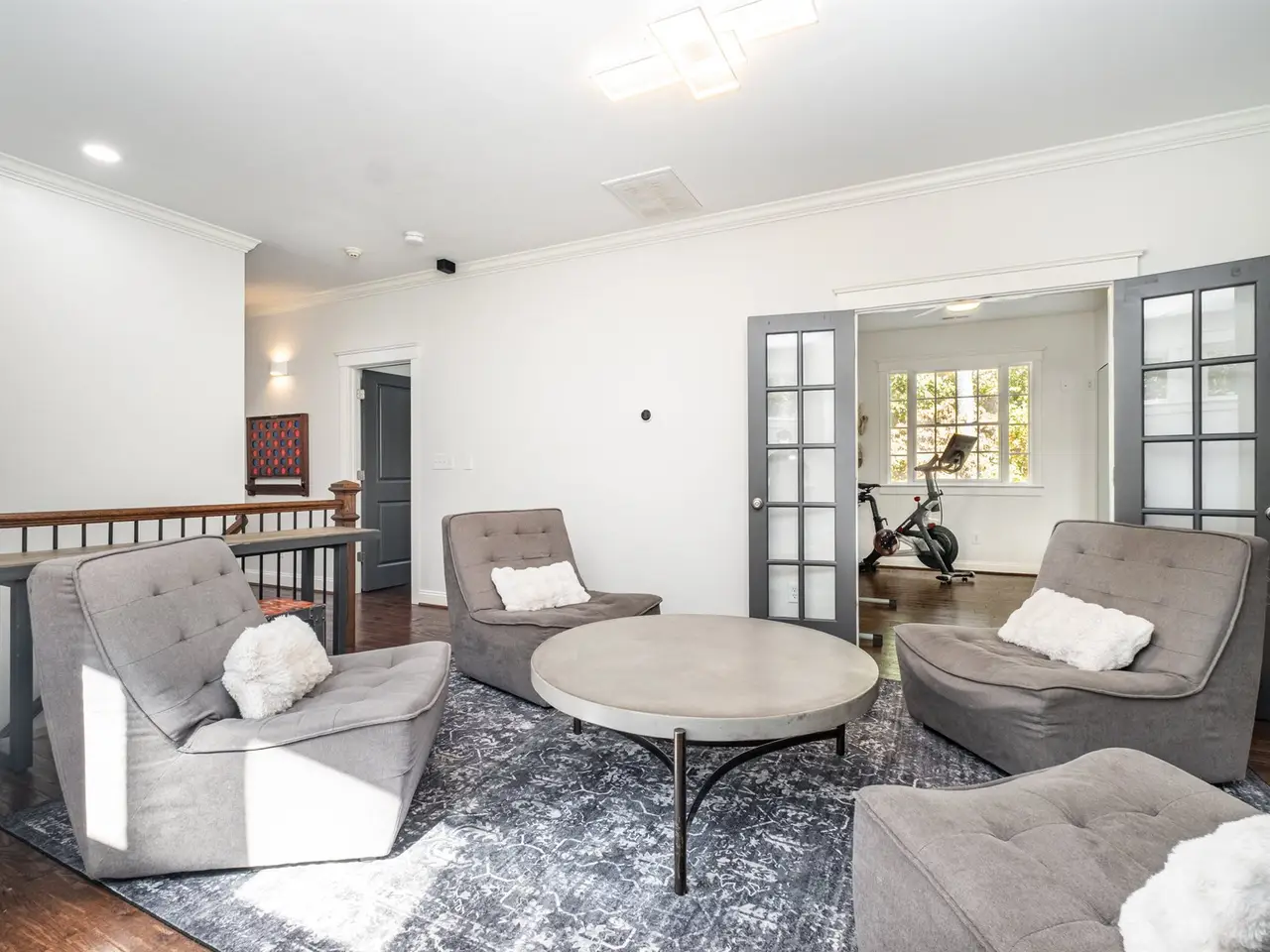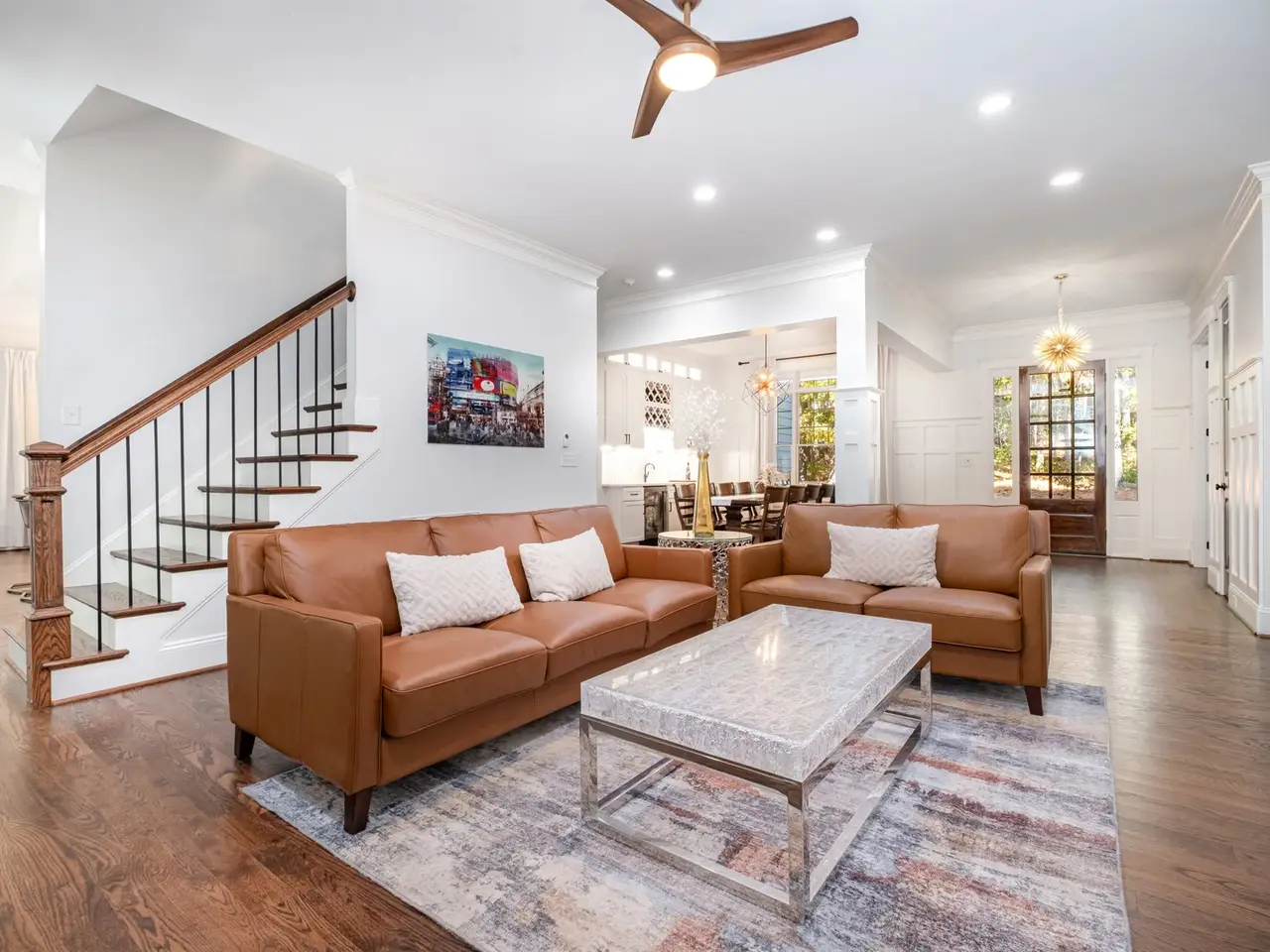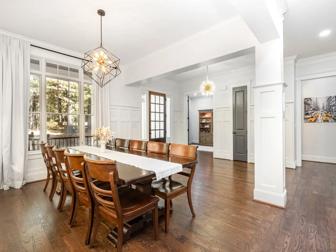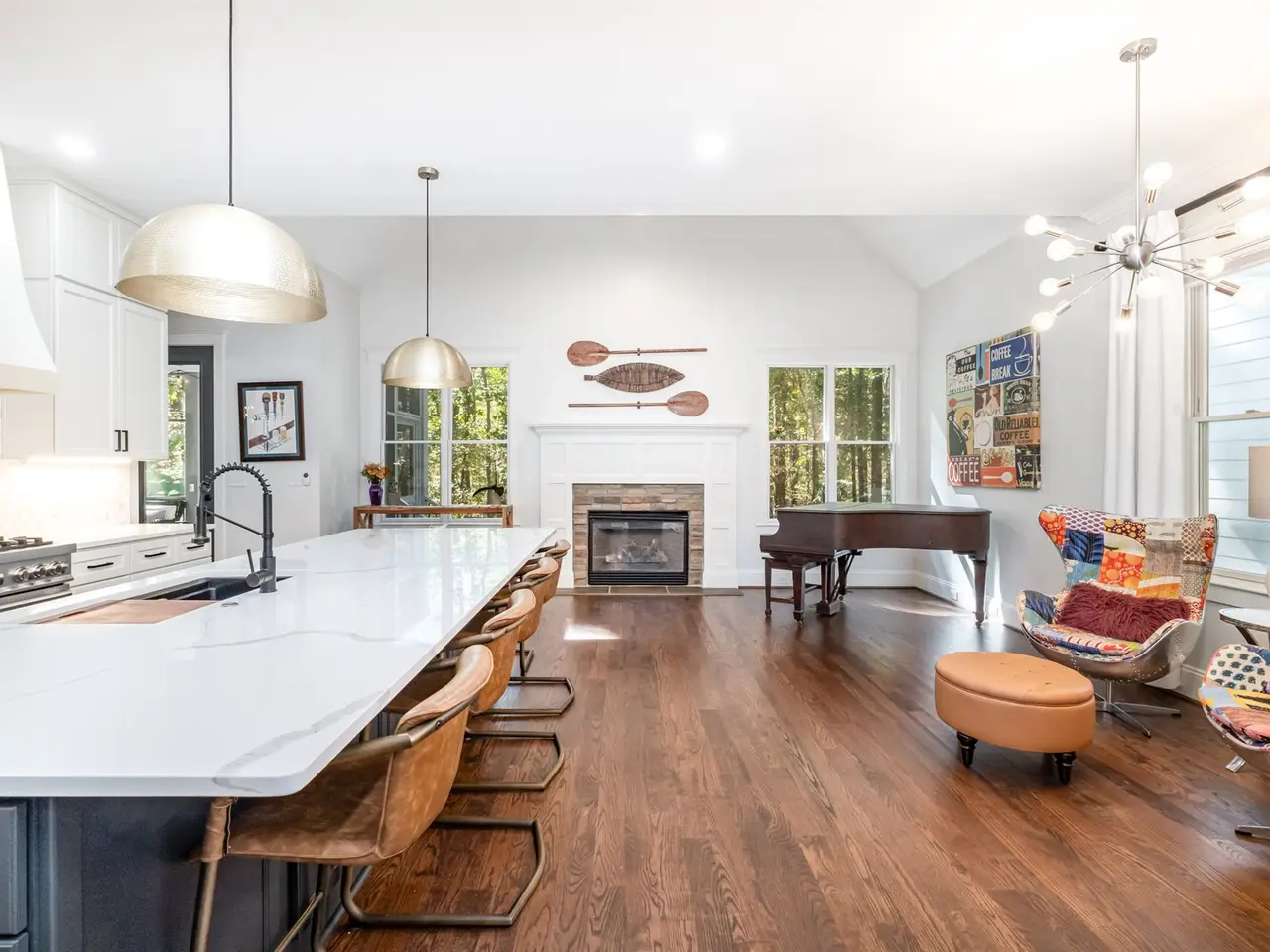 This modern luxury estate in The Farms offers true resort living on 2.1 private acres. Bordered by protected water-company land and community greenway, it's one of the most private homes in the neighborhood. The 4BR/3.5BA main home features soaring ceilings, hardwoods throughout (no carpet), designer lighting, neutral paint, and a newly built-in bar. The chef's kitchen includes a 48" gas range with double ovens, drawer microwave, and custom cabinet pantry. A double-sided fireplace opens to a screened deck overlooking the 40' heated saltwater pool with 7' depth, swim-up bar, and 8+ person spa. Outdoor features include stone walkways, bonfire pit. One of the few properties in The Farms with a carriage house, the detached carriage house offers a studio-style space with kitchenette, bath, washer/dryer hookups, and dual-zone mini-split that also temp-controls the garage. Main home has two HVAC units and two hot water tanks, plus a third serving the carriage house. Both garages feature lift-ready ceilings. The Farms amenities include clubhouse, pool, tennis, pickleball, soccer fields, holiday events, and boat/RV storage available. Lake Norman access is just minutes away.