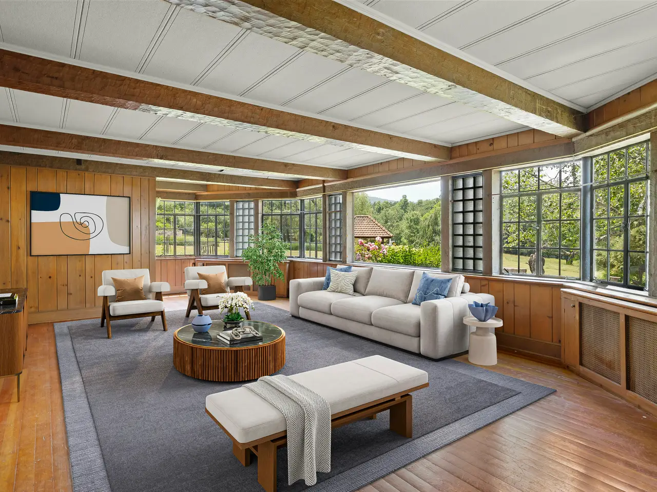 Welcome to Happy Brooks, the much-loved compound for many years of Woodstock Festival co-founder and legendary music industry icon Michael Lang, this mythic Mt. Tremper property boasts true style, along with a creative pedigree that dates back to the 1920s. Originally built for the artist G. Adolph Anderson, the 17 acre estate features three architecturally significant & historic structures designed by prominent architect A.M. Bedell; the original main house was built in 1928, with the two additional & alluring buildings following soon after. The grandly scaled double-height great room of the primary residence has played host to renowned artists of every stripe through the decades, with the inspired design detail easily matched by the world-class art and music created within its impressive walls. In this wing you will also find an office, two powder rooms, upper-level bedroom, and a library. Past a massive bluestone fireplace on the ground floor a central foyer leads into a formal dining room with long-range mountain views, a cooks" kitchen with breakfast area, and an open-plan media room (and another massive fireplace with wood stove & built-in bread oven). A light-filled hallway brings you to three oversized bedroom suites, including the romantic, beautifully scaled primary. Behind magnificent stained glass doors you will find a reading room with window seats that overlook the verdant, rolling lawn below. Connecting this wing of the home is a spectacular conservatory with a 24-foot glass ceiling - the perfect place to cultivate plants (or plans), paint a masterpiece, or simply dream. Across the central courtyard, and framed by a wide, mature birch tree is a two bedroom storybook guesthouse that holds true design treasure. An oversized living room leads into a den with bluestone fireplace and a striking collection of built-in Fu dogs and wood-carvings on gilded plaques collected from travels to China that depict an epic story (like the one you can create here). There is also a charming dining area and full kitchen. The third stone and wood structure is a two bedroom cottage that is connected to a three-bay garage, and has a greenhouse ready to be restored or turned into a Romanesque walled garden. Additional structures include a tool shed, three-stall barn, as well as an enchanting picnic pavilion sited up on a knoll with views of Slide Mountain, the tallest peak of the Catskills. From the moment you enter the gates there is a feeling of being in your own private village, and the park-like land is a natural wonder, with winding paths, stone walls, orchards, fields of wildflowers and a large centerpiece pond with its own art island showcasing a sculpture by Michael Lang. On sultry summer days you can enjoy a swim in the 53 x 40 oval lined cement pool while gazing at the peaks and valley's in the distance. Mt. Tremper is located just minutes from main street Woodstock, and Happy Brooks itself is approximately two hours from NYC. This rare Hudson Valley treasure, so full of possibilities, is ready for its next refresh and adventurous steward. So come on and get Happy.
