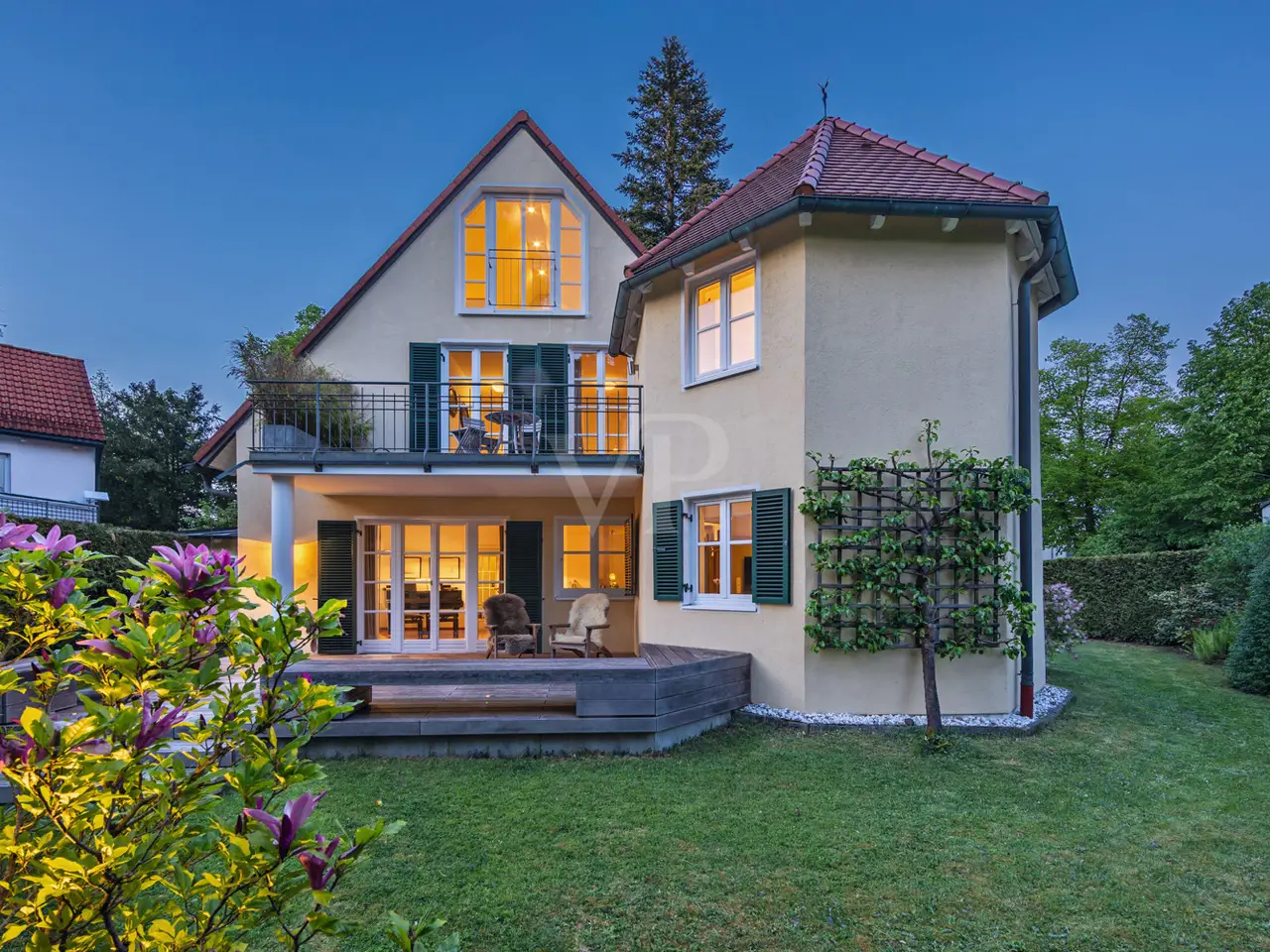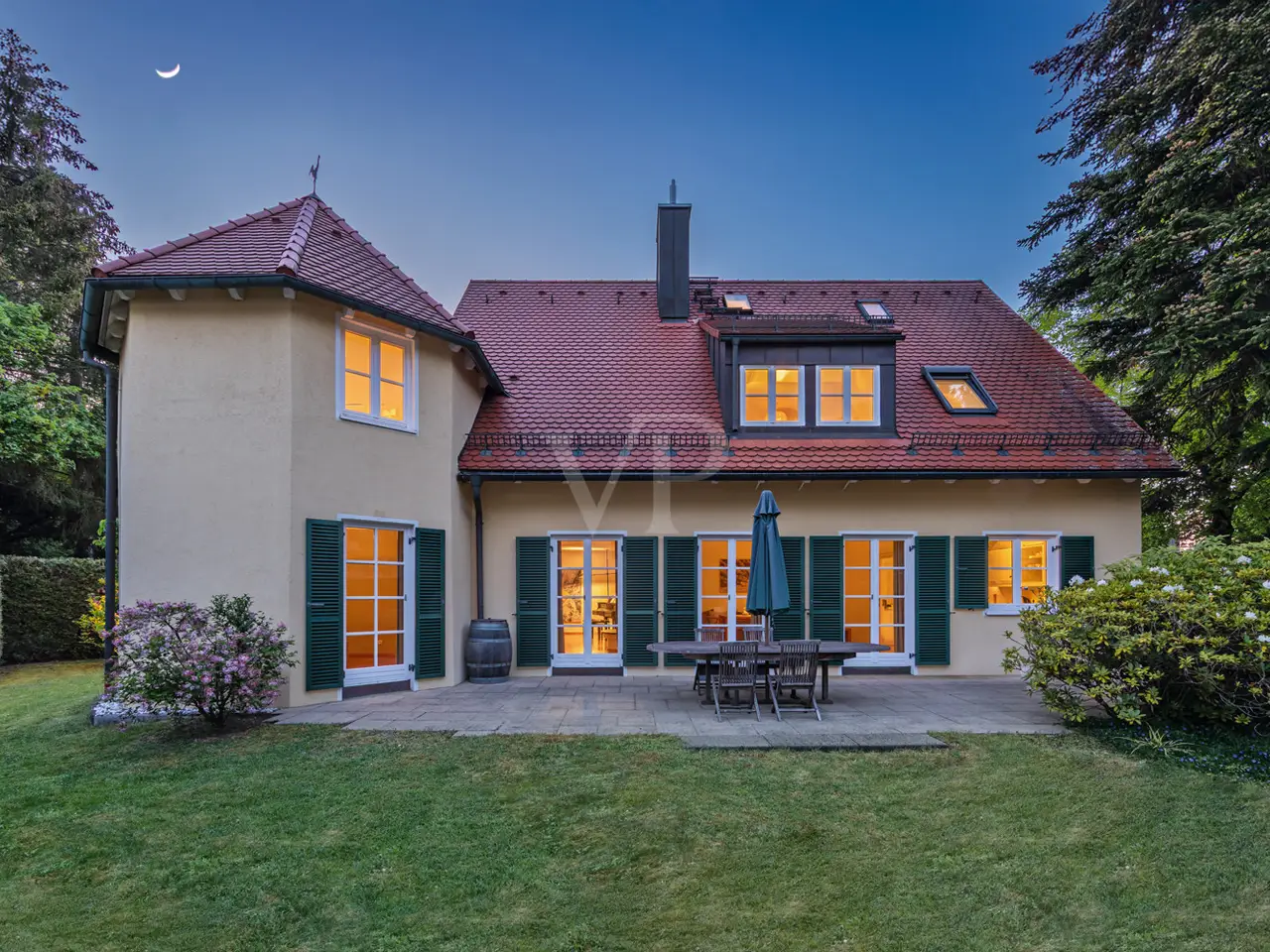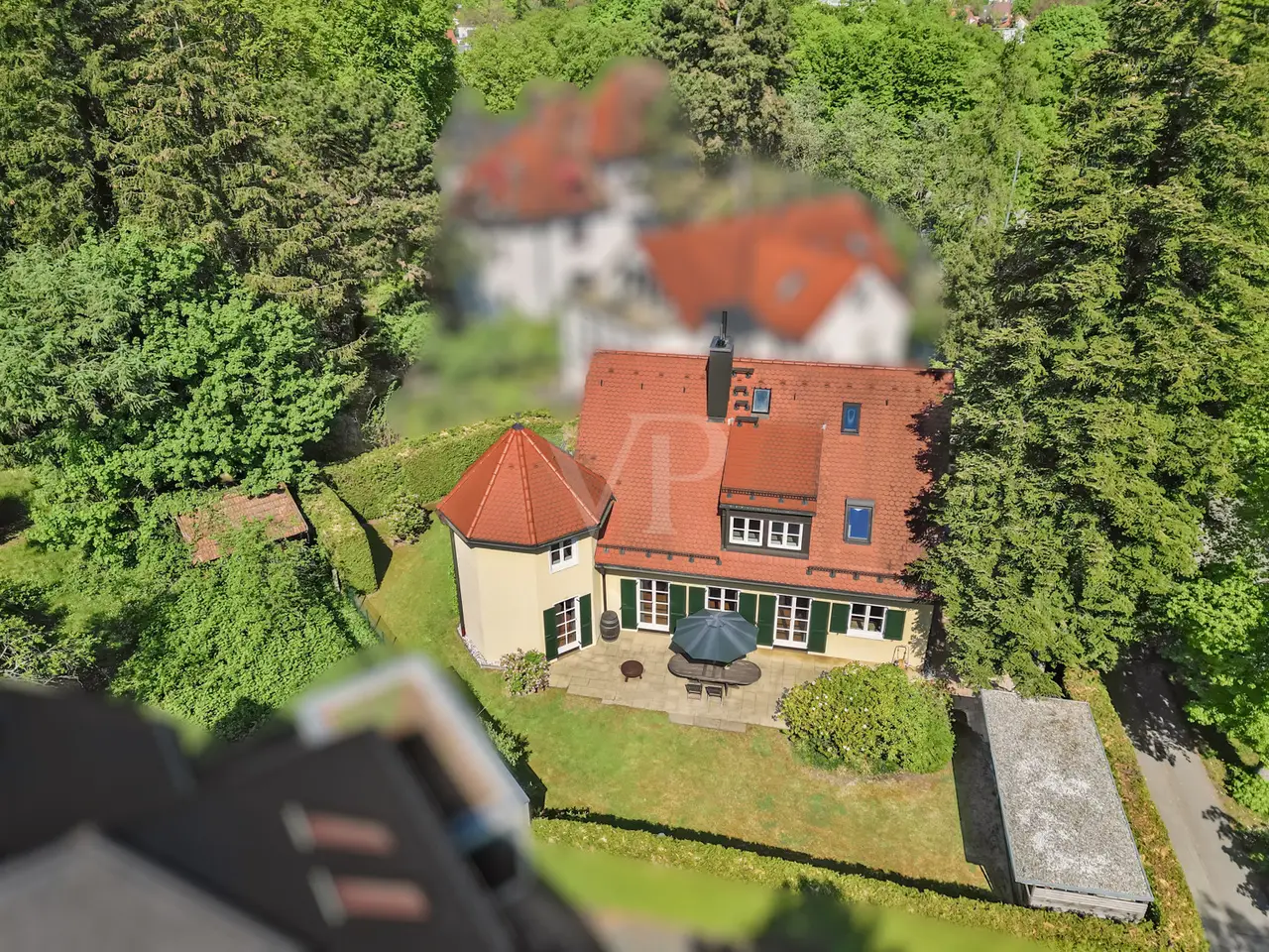 In the prestigious Villa Colony II, this charming property presents itself as a rare opportunity for families who demand space, style and quality of living. Originally built in 1957, the house with its historic flair was extensively renovated in 1997 and continuously modernized. On a generous living space of approx. 245 m² and a sunny plot of approx. 561 m², the house offers an ideal combination of classic living comfort and contemporary furnishings. Thanks to numerous windows, the entire house is flooded with light and conveys an open, inviting atmosphere. A particular architectural highlight is the striking tower on the building, which gives the house its unmistakable character. Two large terraces facing south-west and south-east as well as two balconies create attractive outdoor retreats and provide a view of the lovingly landscaped garden with garden shed. Inside, the house impresses with high-quality features such as fine cherry wood parquet flooring in all living areas, ceramic tiles in the kitchen and bathrooms and a stylish fitted kitchen that meets the highest standards both functionally and visually. The spacious living area is complemented by an elegant fireplace, which creates a cozy atmosphere on cooler days. A combination of underfloor heating and radiators ensures a pleasant indoor climate in the various areas of the house. A modern bathroom with a bathtub and a separate shower room provide comfort in everyday life. The converted top floor houses the popular open-plan lounge and the beautiful home office with south-west orientation and floor-to-ceiling windows. There is plenty of storage space in the basement of the house, which offers practical benefits for the residents. A hobby room or fitness room also allows for a variety of uses and rounds off the offer perfectly. This spacious property combines stylish living with historic charm - a rarity in this prestigious and family-friendly residential area. Immediate occupancy is possible.