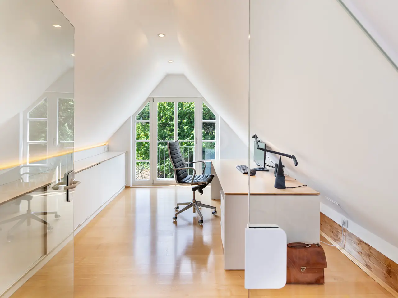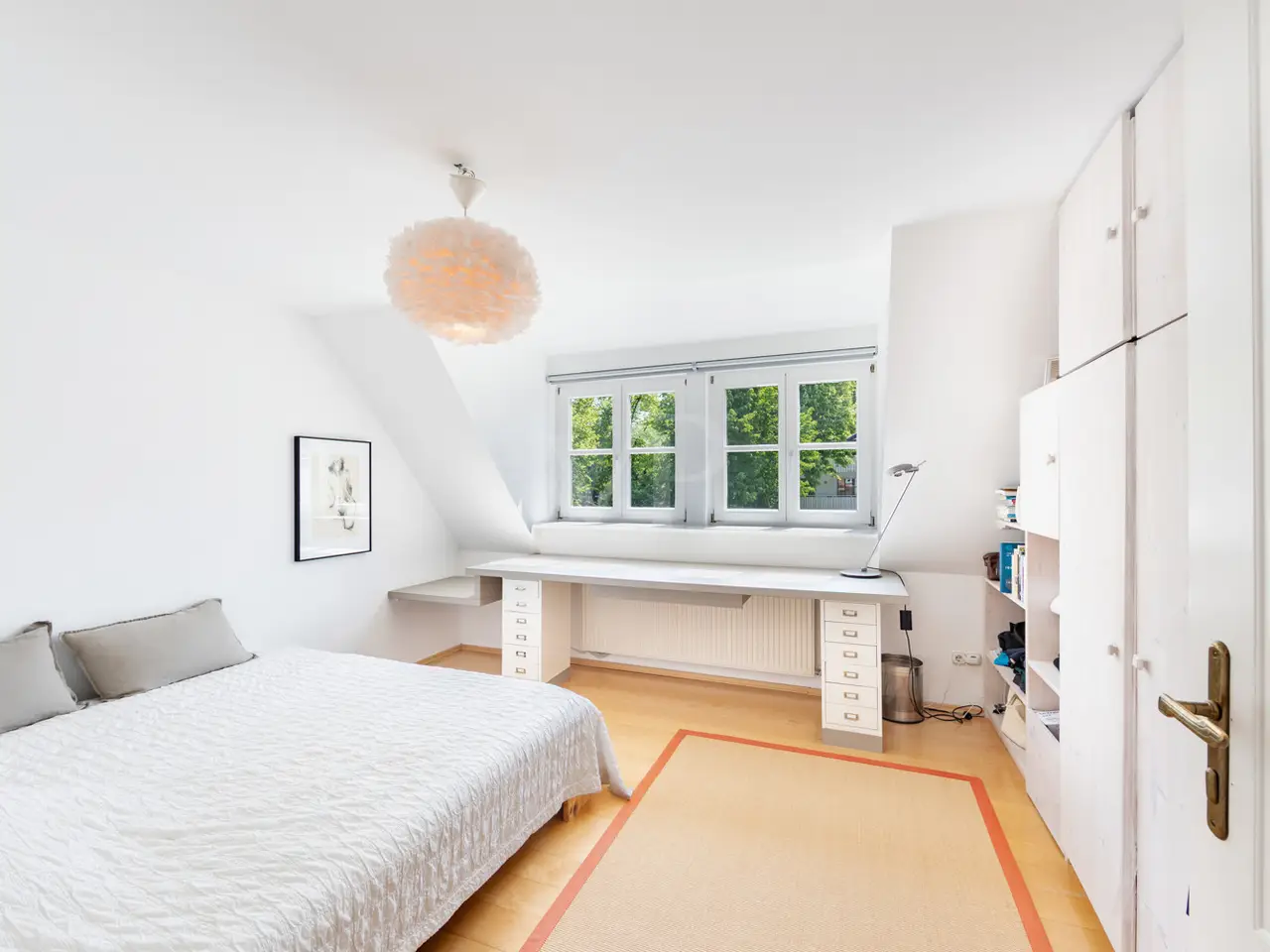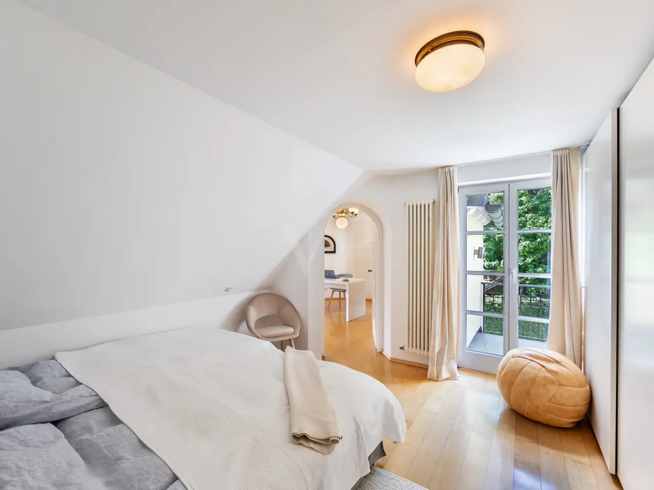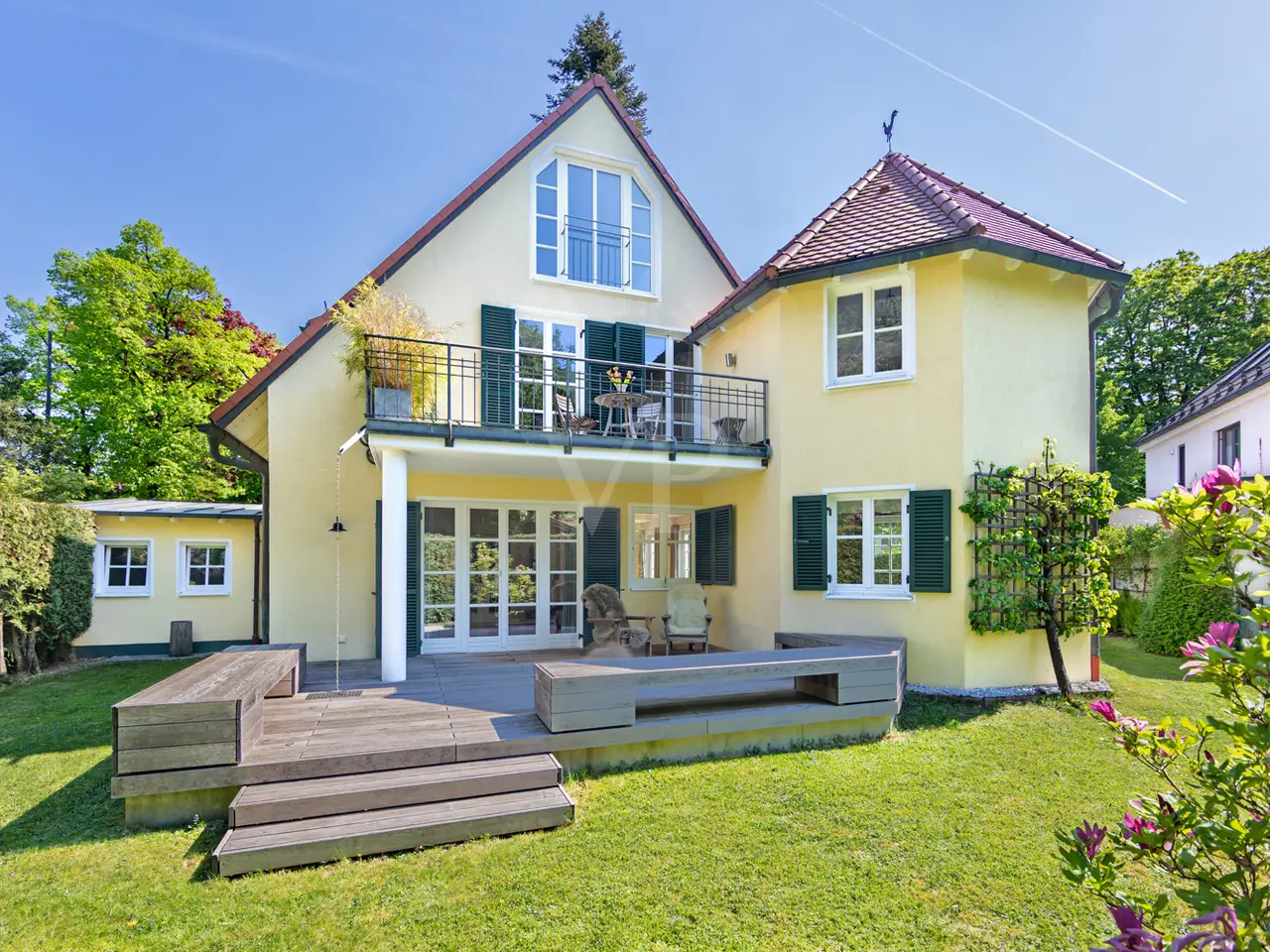 In the prestigious Villa Colony II, this charming property presents itself as a rare opportunity for families who demand space, style and quality of living. Originally built in 1957, the house with its historic flair was extensively renovated in 1997 and continuously modernized. On a generous living space of approx. 245 m² and a sunny plot of approx. 561 m², the house offers an ideal combination of classic living comfort and contemporary furnishings. Thanks to numerous windows, the entire house is flooded with light and conveys an open, inviting atmosphere. A particular architectural highlight is the striking tower on the building, which gives the house its unmistakable character. Two large terraces facing south-west and south-east as well as two balconies create attractive outdoor retreats and provide a view of the lovingly landscaped garden with garden shed. Inside, the house impresses with high-quality features such as fine cherry wood parquet flooring in all living areas, ceramic tiles in the kitchen and bathrooms and a stylish fitted kitchen that meets the highest standards both functionally and visually. The spacious living area is complemented by an elegant fireplace, which creates a cozy atmosphere on cooler days. A combination of underfloor heating and radiators ensures a pleasant indoor climate in the various areas of the house. A modern bathroom with a bathtub and a separate shower room provide comfort in everyday life. The converted top floor houses the popular open-plan lounge and the beautiful home office with south-west orientation and floor-to-ceiling windows. There is plenty of storage space in the basement of the house, which offers practical benefits for the residents. A hobby room or fitness room also allows for a variety of uses and rounds off the offer perfectly. This spacious property combines stylish living with historic charm - a rarity in this prestigious and family-friendly residential area. Immediate occupancy is possible.