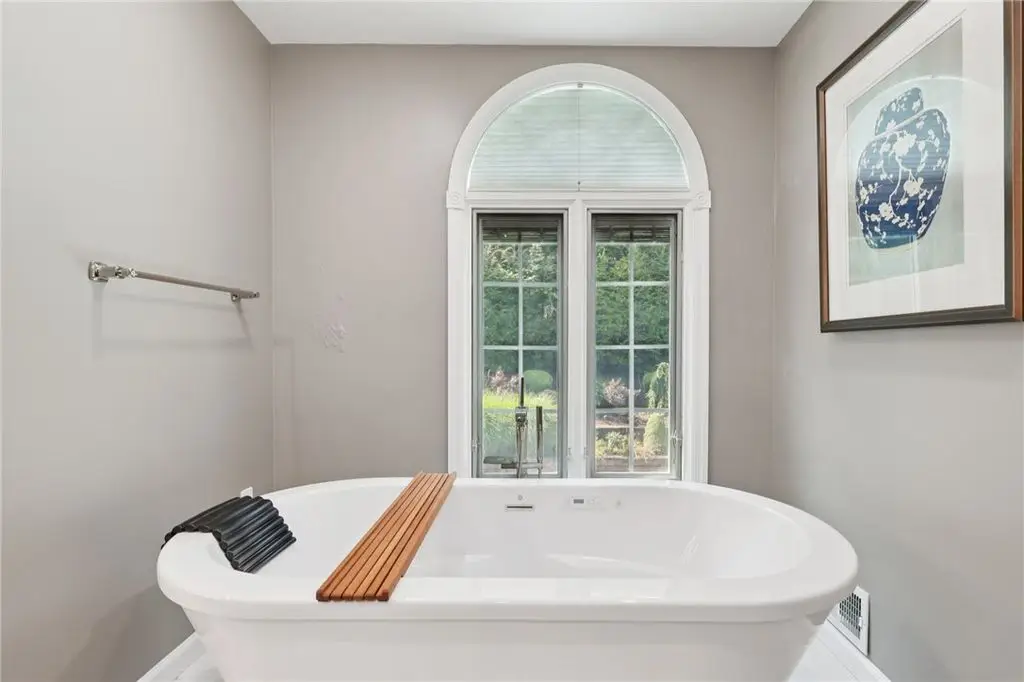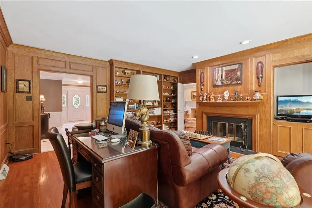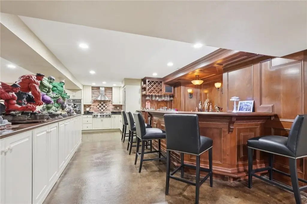 Luxury Living! Spectacular Estate on private road w/1.5acre professionally landscaped grounds. Grand foyer w/leaded glass door, grand staircase,& chandelier. Formal living & dining rooms w/exquisite details fireplace, bay window, hardwood flooring,& built-ins. Executive office w/wood-paneled walls, fireplace, custom cabinetry,& wet bar. Chef's dream kitchen w/Wolfe & Viking appliances, large island w/seating, Miele coffee bar, sliding glass doors to stunning outdoor retreat. Entertain in style w/rear patio w/full outdoor kitchen, woodfired pizza oven, inground pool, multiple seating areas,& tranquil pond w/waterfall. Luxurious owner's suite w/French doors, spa-bath w/soaking tub overlooking pool, oversized shower w/jets, double vanities,& walk-in closet. Updated bath, laundry, & balcony w/lounging area & spiral staircase to pool. Lower level is entertainer's dream w/wine room, full 2nd kitchen, wet bar, built-in seating, game area, media lounge, gym/5th bedroom, & full bath. WOW!