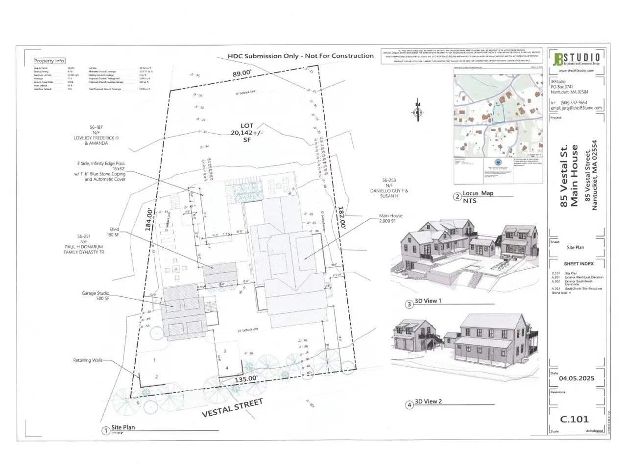 Exceptional Estate-Ready Offering at 85 Vestal Street, Nantucket HDC-Approved Compound with Pool, Studio, Cabana & More, June 2026 Occupancy. Ideally located just west of town, this spacious half-acre parcel - offering a seamless path to high-end Nantucket living. Development includes- A gracefully designed main residence with five bedrooms, five full and one half baths, open-concept living spaces, and timeless Nantucket detailing throughout. A detached garage with full second-floor studio, connected to the main house by a private underground tunnel - a standout feature that opens the door for exciting possibilities such as a private bowling alley. A heated in-ground saltwater pool with auto cover and integrated spa creating a true backyard sanctuary. A charming cabana for seamless indoor-outdoor living and entertainment. Ample room on the lot for a future sports court - ideal for basketball, pickleball, or tennis - enhancing the estate's active lifestyle potential. Every detail of the design has been thoughtfully curated to elevate comfort, functionality, and enjoyment. What truly sets this offering apart: The seller offers the exclusive opportunity to deliver the finished compound for June 2026 occupancy, providing a rare turnkey solution. Your Nantucket estate will be ready to welcome you with elevated finishes and full customization. Set within a serene residential enclave just minutes from downtown Nantucket, 85 Vestal Street blends privacy, convenience, and long-term value. Inquire today for detailed architectural plans, build specifications, and delivery timeline. A rare opportunity to own a fully realized Nantucket compound - designed for both luxury and lifestyle - is here.