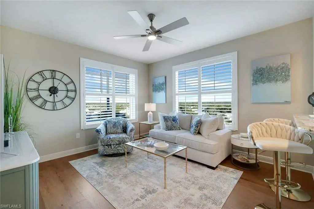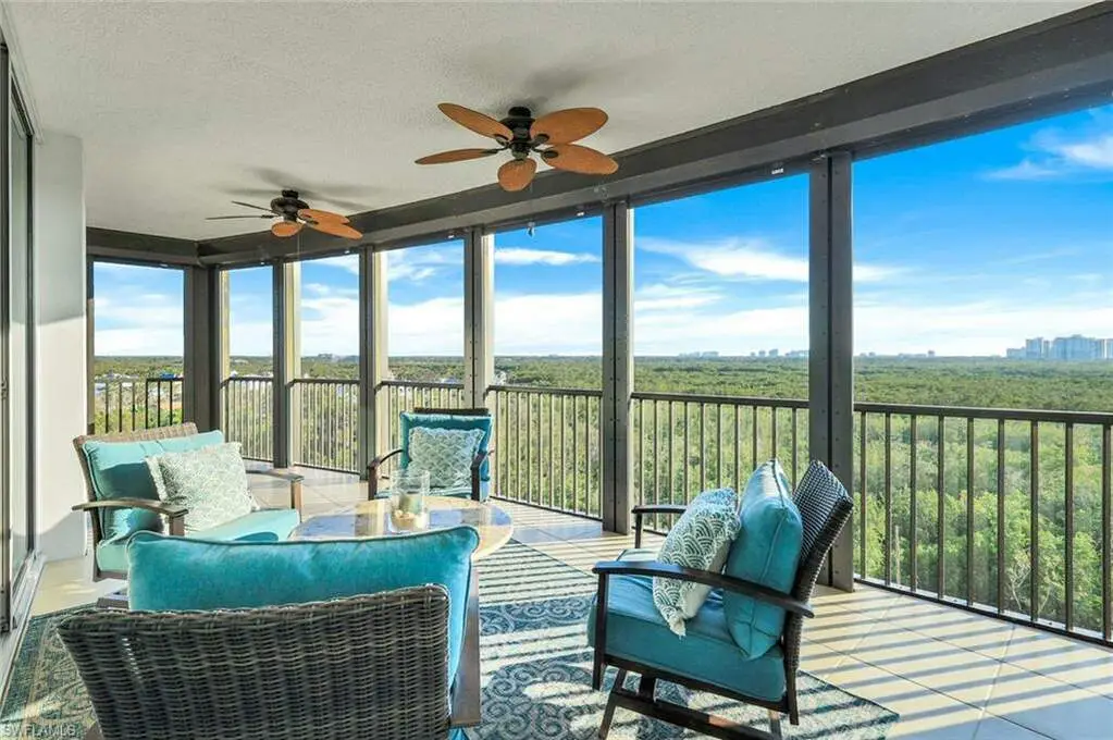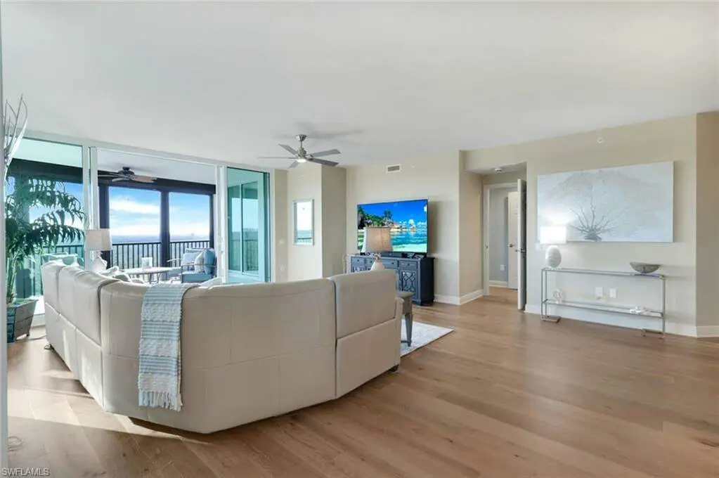 Introducing a sanctuary of luxury living in this prestigious Cove Towers condominium overlooking Turkey Bay with sunset views looking out to the Gulf of Mexico. Located in the highly coveted 01 corner stack where only 3 other end units have been sold over the last 10 years. This gorgeous property epitomizes the pinnacle of elegance and sophistication with private elevator entry opening to your grand salon with wrap around balcony and includes 3 bedrooms and 3.5 baths. Cove Towers is a gated enclave within a gated community, and residents will revel in the exclusivity of the private Calypso Club. Boasting a heated lap pool, a cabana adorned with a fireplace & grills, media/entertainment room, a fitness room, onsite management, and guest suites. This haven offers an active resort lifestyle all located just steps from the residence. The meticulously designed kitchen will be a cook's dream and features top-of-the-line Cafe appliances including an Advantium that offers convection, microwave and halogen cooking, professional French door wall oven, induction cooktop, GE Monogram wine chiller & recently updated granite countertops with breakfast bar all set against the backdrop of newly updated wide plank engineered wood flooring. You'll appreciate attractive and updated lighting throughout the home as well as elegant plantation shutters that offer a coastal modern feel. The master suite offers balcony access and features a serene view of the gulf in addition to an in-suite bath with soaking tub & shower as well as 2 walk in closets. Guests can enjoy both spacious guest bedrooms with in-suite baths and shared balcony with views of the newly developed Kinsale Golf Club. Residents have the option to join Tarpon Cove Yacht & Tennis Club which is located within the community and offers tennis, dining, clubhouse, resort style pool and boat taxi to Naples gorgeous white sand beaches. Embracing captivating views of Turkey Bay and the Gulf of Mexico, this home is the epitome of luxury living.