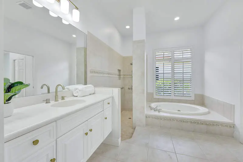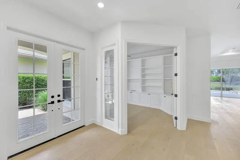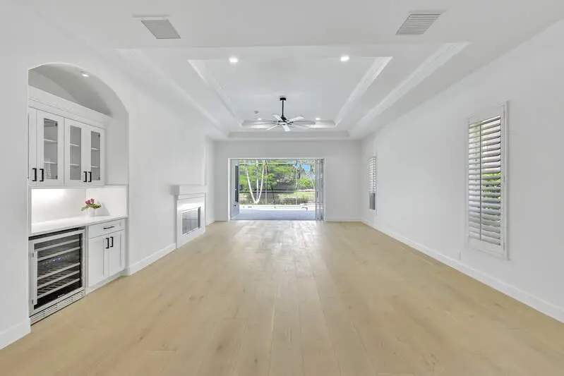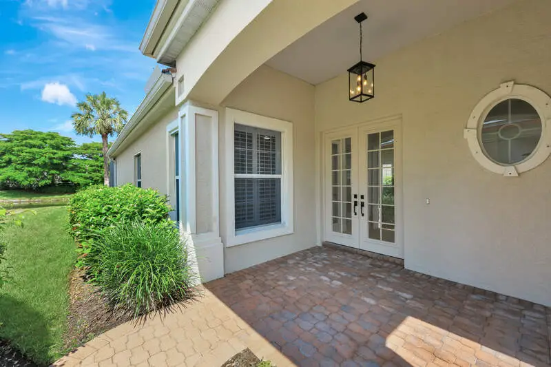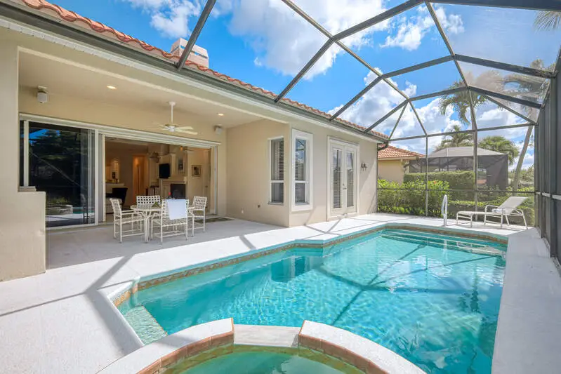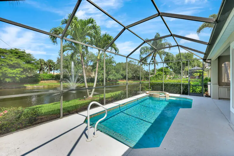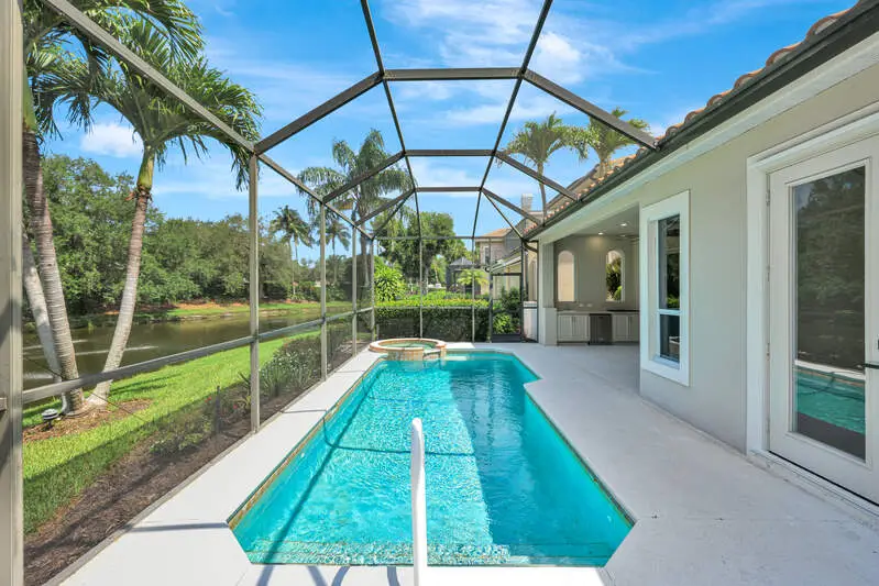 Capture the elegance of waterfront living in Troon Lakes. Western views frame peaceful scenes of the lake, fountain, and lush landscape. This single-story pool home with hot tub and proximity to the community club offers convenient access to local retail and restaurants, the beach and the benefits of a highly amenitized community. The home provides beautiful, easy-flow living with abundant natural light and numerous upgrades, including an office/den with built-ins, crown molding, and coffered ceilings in the great room. Dining and entertaining are effortless with a spacious kitchen island, formal dining area, and inviting lanai. The master suite overlooking the lake offers privacy and direct access to the pool for year-round, relaxing Florida evenings, while guests enjoy their own private space. Recently remodeled with white oak Maui wood floors, new appliances, cabinets, and fixtures. The amenity-rich community includes tennis, pickleball, bocce, fitness and social centers, and The Nest outdoor bar & grill.