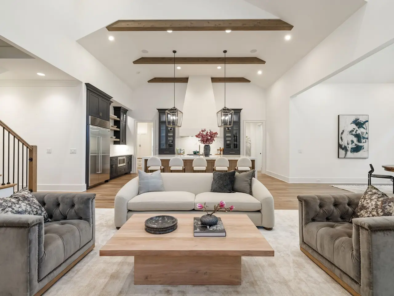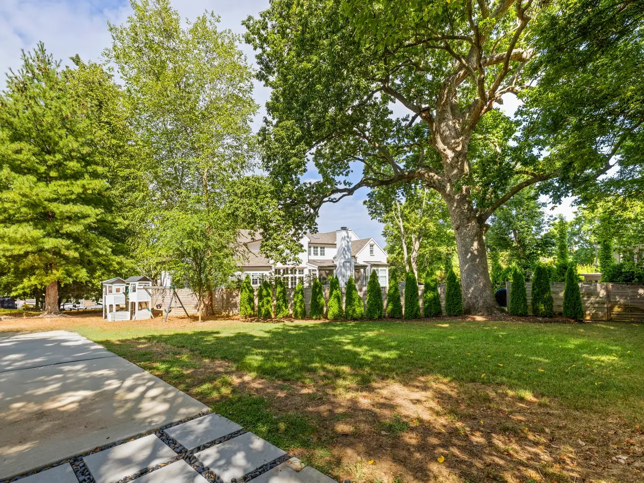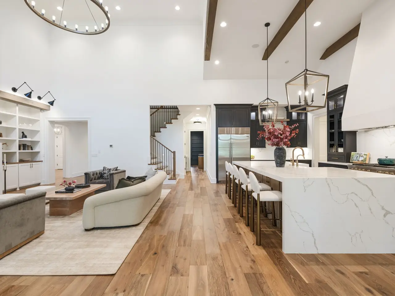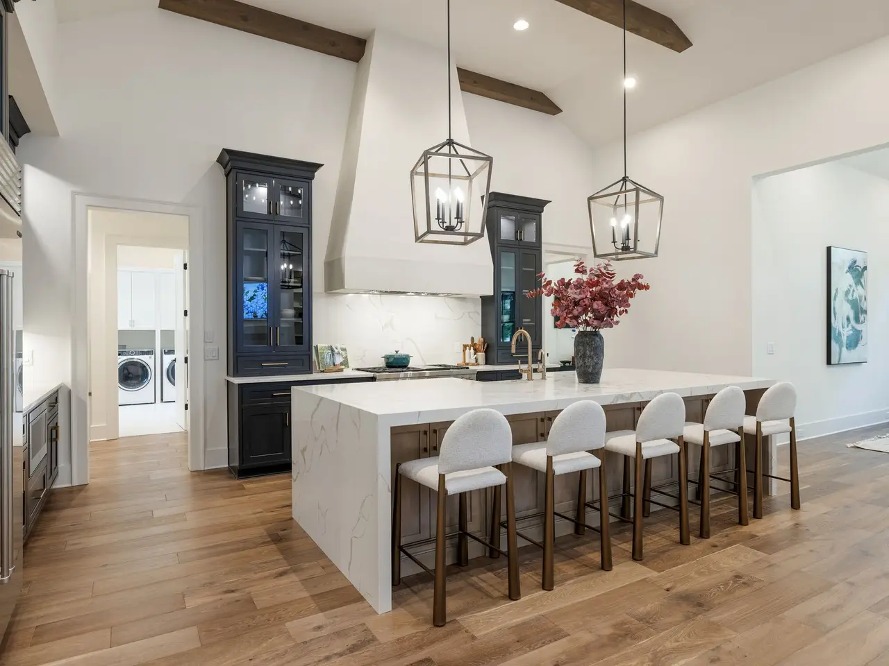 Luxury living meets unbeatable location in this stunning home, just a short drive from the heart of downtown Nashville. Beyond the double glass-paneled front doors, you're welcomed into an elegant entry foyer that flows seamlessly into the formal dining room, complete with accent walls and a show-stopping chandelier. A private vaulted office with custom cabinetry provides the perfect work-from-home retreat, while the open-concept floor plan centers around a soaring two-story great room. Here, custom built-in cabinets, open shelving, and a gas fireplace create a warm yet sophisticated gathering space. The gourmet kitchen is a chef's dream, showcasing a waterfall-edge island, wooden ceiling beams, Wolf appliances, a wet bar, beverage center, and an oversized pantry with abundant shelving and room for a second refrigerator. A light-filled breakfast room connects the living and dining areas, making entertaining effortless. The main-level primary suite is a true retreat with high ceilings, designer accent walls, double vanities, a soaking tub, a floor-to-ceiling tile shower with rain head and built-in bench, and a spacious walk-in closet with custom shelving that conveniently connects to the laundry room. Two additional bedrooms and a full bath complete the main level. Upstairs, you'll find a second laundry room, a generous bonus room with its own wet bar and beverage center, three well appointed bedrooms with en suite baths and walk-in-closets, plus an additional entertaining space that could serve as a media room, playroom, second office, or even an extra bedroom--offering endless possibilities to suit your needs. Step outside to the screened back porch overlooking a private, fenced yard with concrete paver patio--ideal for both relaxation and entertaining. A gated driveway and three-car garage complete this incredible property.