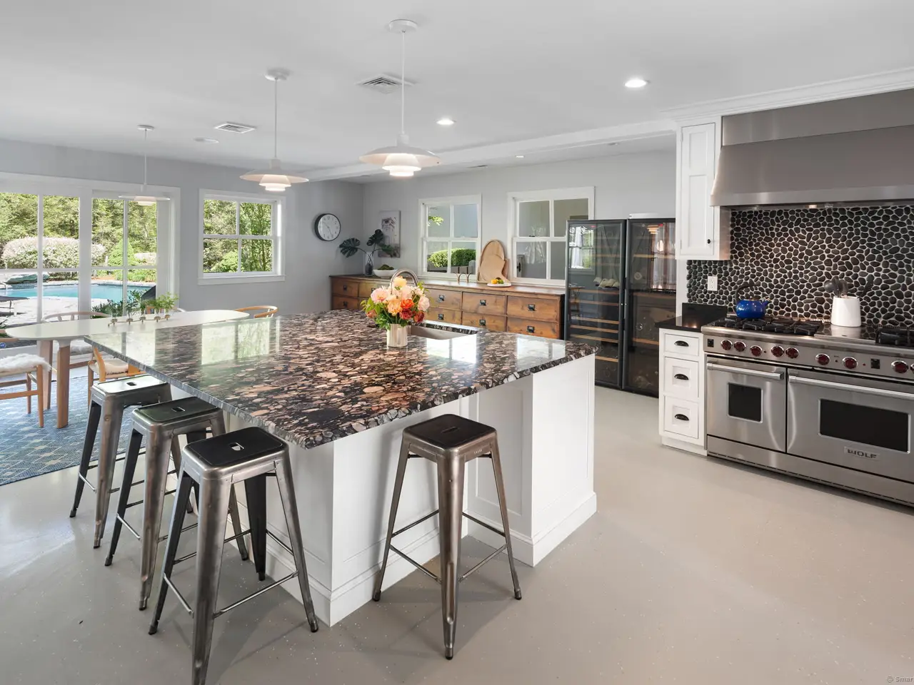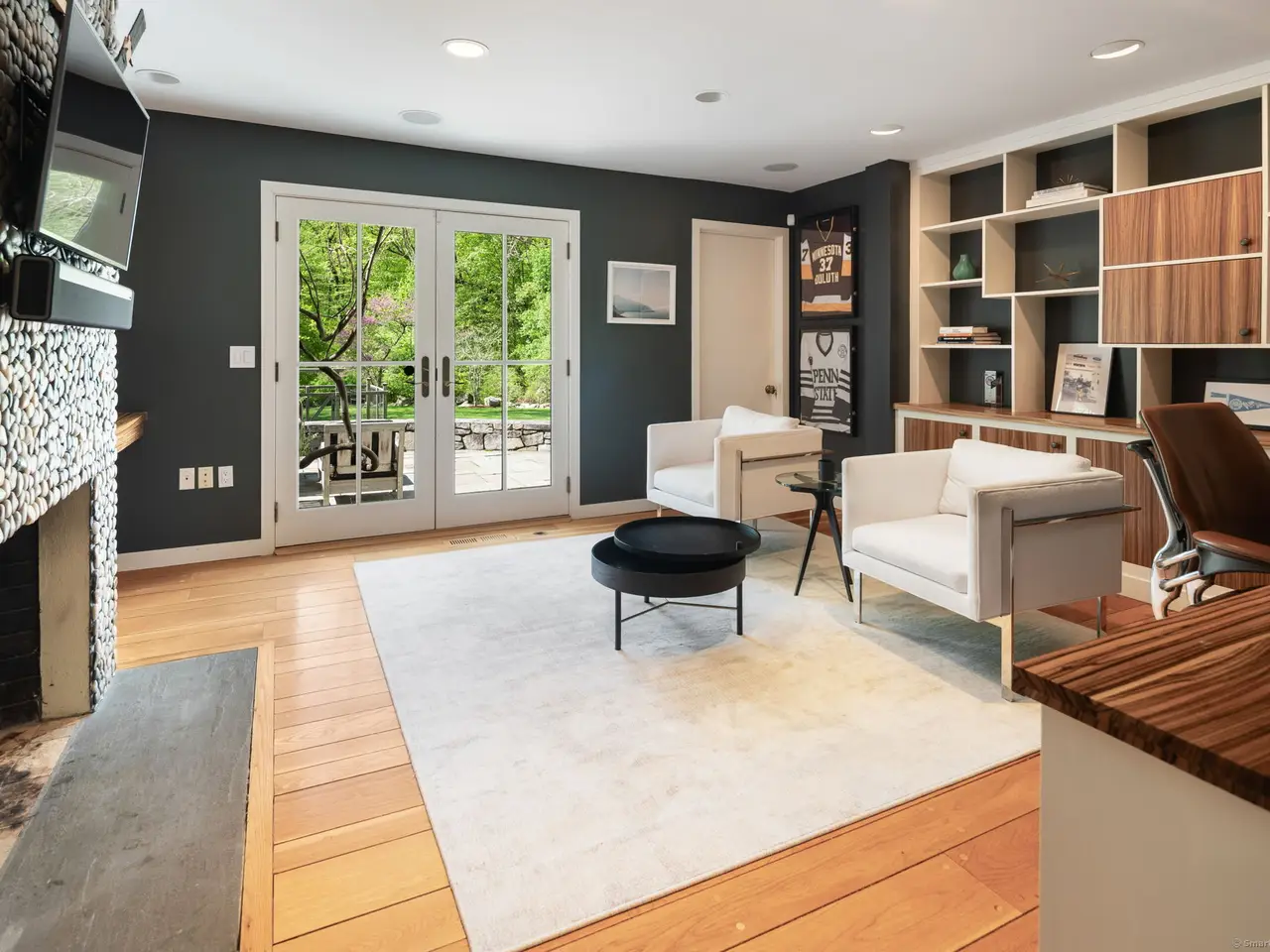 California meets New Canaan in this William Wurster inspired transitional-style masterpiece set on 2.54 private acres on New Canaan's desirable west side that's so convenient to town. This extensively renovated home has over 100 custom windows and 16 doors bringing the outside in from every room. Amazing sun-drenched living space with wonderful views from EVERYWHERE. French doors lead to expansive bluestone terraces, a beautiful gas fire pit for entertaining, meticulously manicured flower gardens, pool, spa and river. Five bedrooms, 4-car garages, au pair suite and an exceptionally designed layout make this home a sensational haven with the warmth of a colonial but so fresh!