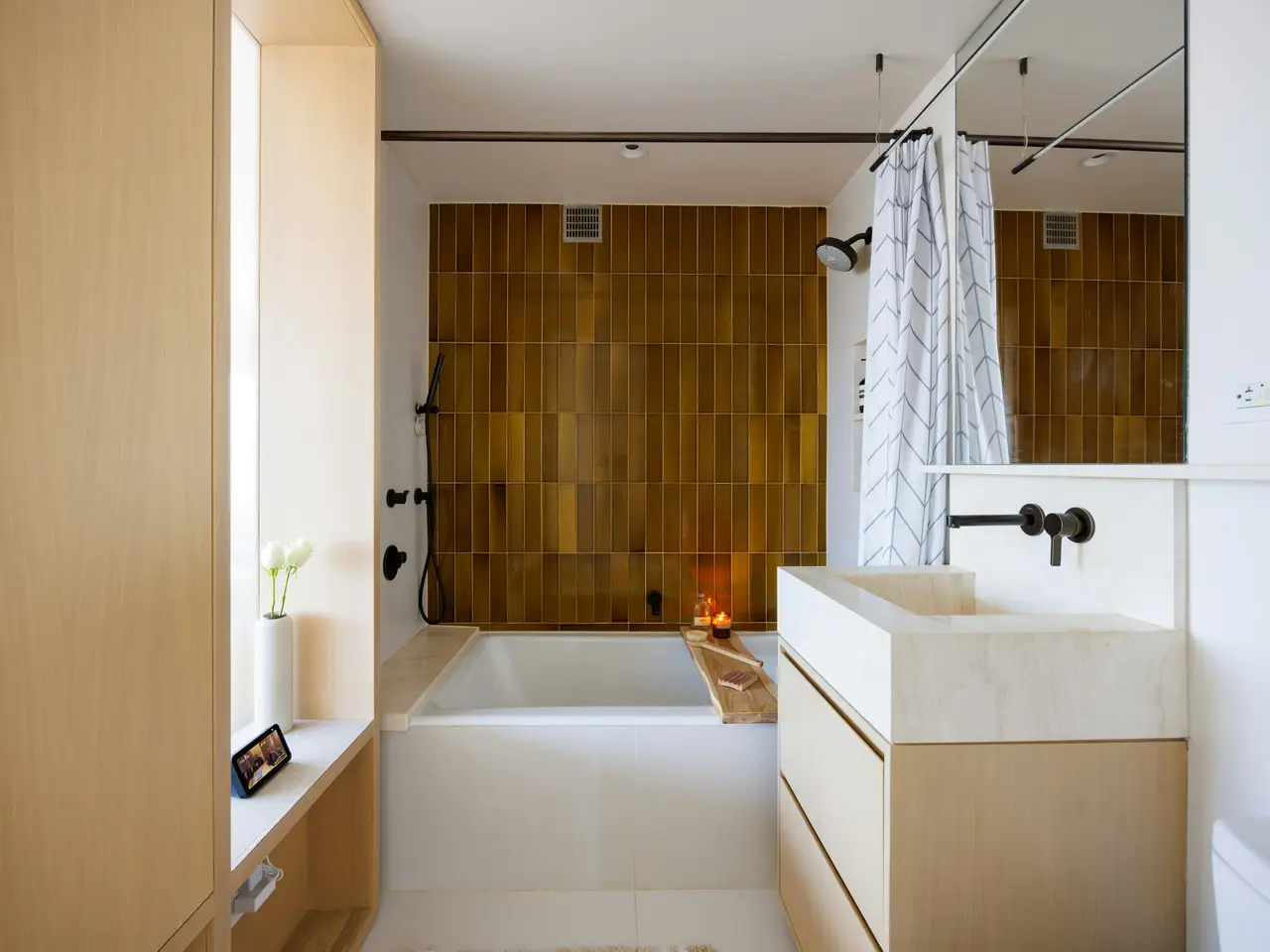 A Published Masterpiece in the Sky  Perched on the coveted northeast corner of the 35th floor, this residence is offered for the first time since its masterful designer renovation by Sarah Zames & Colin Stief of General Assembly. Reimagined with a clean material palette, the home balances refined architecture with effortless livability.  Walls of glass frame panoramic views across the ever-changing East Side skyline, creating a home of many moods and scenes. With balconies on both sides of the apartment, the vistas can be enjoyed from the outdoors as well. As Dezeen observed in its feature on the residence, the architects sought "a balance between the feeling of being in the air, while being grounded by the weight of the building."  The custom kitchen is anchored by a concrete waterfall island with a built-in wine fridge and microwave drawer. Light wood cabinetry frames the Thermador suite, including a 6-burner gas cooktop and oven, Sapphire Glow dishwasher, and refrigerator with Open Door Assist- just a gentle touch opens the door, the ultimate luxury detail.  Windows line the kitchen, filling the space with light and lively city views, turning daily routines into moments of enjoyment. Honed Caesarstone counters and a sophisticated ceramic tile backsplash complete the modern design, while built-in shelving offers a stylish home for barware, vases, and everyday essentials.  The primary suite offers a serene retreat, complete with two closets plus a 14-foot walk in by California Closets. Pocket doors provide quiet separation, while custom millwork introduces floating bedside tables and subtle ledges for art or keepsakes. A unique architectural opening filters natural light between the bedroom and bath, elevating both spaces.   The ensuite is finished with a travertine vanity, soaking tub, Japanese washlet, matte black fixtures, and richly hued vertical tile, a striking marriage of warmth and refinement.  The second bedroom includes a generous closet and is enclosed by a sliding panel of reeded glass, a purposeful design choice that allows natural light to filter through while maintaining privacy. This thoughtful detail makes the room ideal not only as a bedroom but also as a home office or den. The other full bath features a stall shower, midnight cabinetry, travertine vanity, brass fixtures, and a Japanese washlet.  Additional thoughtful details include discreet TV wall behind sliding door, built-in entry storage, motorized shades, Lutron-controlled lighting, anti-UV window films, and split AC units in the bedrooms.  The Landmark is a full-service luxury building offering a modern lobby, landscaped roof deck, garage with Zipcar, and on-floor washer/dryer access. Two dogs or cats are welcome per apartment!