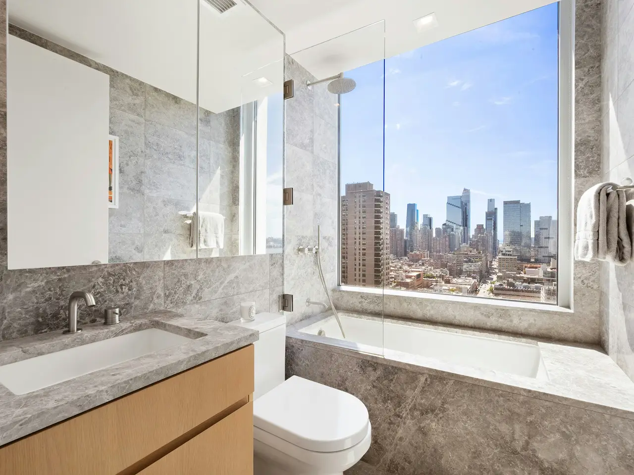 Welcome to Residence 25A at 611 West 56th Street - a sophisticated two-bedroom, two-and-a-half-bath home offering more than 1,400 square feet of thoughtfully designed living space, complete with the privacy and elegance of direct elevator access. Designed by acclaimed architect Álvaro Siza, with interiors by Gabellini Sheppard, this corner residence is bathed in natural light from oversized windows, framing sweeping views of Uptown, Midtown, and the dramatic downtown skyline to the south. Just off the entry, a well-placed powder room offers convenience and discretion for guests. The windowed chef's kitchen combines striking design with everyday functionality, featuring Italian walnut cabinetry, honed Grigio Nicola marble countertops and backsplash, and a custom waterfall-edge island. Top-of-the-line Gaggenau appliances - including a gas range, speed oven, refrigerator, freezer, and dishwasher - make the space ideal for both daily living and effortless entertaining. The expansive primary suite enjoys a dramatic corner exposure and a spa-inspired five-fixture bathroom with radiant heated floors, honed Tundra Gray marble, and custom lighting that creates a warm, inviting ambiance. A spacious secondary bedroom with its own en-suite bath ensures comfort and privacy for family or guests. Residents of 611 West 56th Street enjoy an elevated lifestyle with exclusive access to curated amenities, including a serene garden mezzanine, a state-of-the-art fitness center with yoga and training studios, steam rooms, a media lounge with billiards, a children's playroom, and a refined residents" lounge with formal dining space and a catering kitchen. The unit trades with a private storage cage and private parking is also available. Perfectly positioned at the crossroads of the Upper West Side and Midtown West - moments from Riverside Park South and Central Park - this residence is a quiet sanctuary at the heart of Manhattan's vibrant west side.