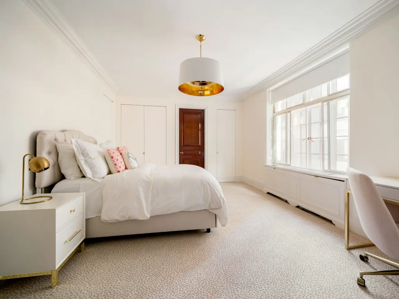 Newly renovated, glamorous duplex at Millan House. A foyer with a sweeping curved staircase provides the point of arrival for this elegant apartment. A step-down living room is entered through an archway, and has a wood burning fireplace, ten foot ceilings, and original casement windows, with sunny southern exposure over the roof of the landmarked Park Avenue Armory. A gorgeously pine-paneled library is adjoining, an ideal spot for cozy evenings or intimate gatherings. There is a huge cloak and powder room with a mahogany and marble vanity. A large and gracious formal dining room with parquet de Versailles floors and china closet faces north to Millan House's famed garden. All of the doors are figured mahogany with custom brass hardware. Beyond the dining room is a pantry with marble counters, ample storage, an under counter subzero wine fridge, two SubZero refrigerator drawers, and a sink and a bar. The pantry leads to a gourmet eat-in kitchen with a SubZero refrigerator, Miele dishwasher and brand new six-burner Bertazzoni vented chef's range. In the rear of the apartment is a full bath, a large and private guest bedroom and a wonderful laundry room with tons of storage. Ascending the staircase one arrives on the upstairs floor, also accessed by the passenger elevator. A large primary bedroom suite has a south-facing bedroom with lovely views over the Armory and the midtown skyline. The middle bedroom has been artfully transformed into a jaw-dropping dressing room with elegant mahogany built ins worthy of Saville Row. Beyond is a bathroom that transports one to the most elegant of London hotels, with a free-standing soaking tub, a large limestone shower with rainfall head, a separate water closet, a marble and mahogany vanity, and custom mahogany moldings and millwork throughout. A hallway leads to a very private and spacious guest suite, with a custom marble bathroom, eastern exposure over the garden, and ample closet space. The apartment is fully centrally air conditioned. Built by John D. Rockefeller in 1931, Millan House consists of two separate buildings connected by a two-level Italianate interior private garden courtyard, with a wonderful fountain and seating areas. Designed by architect Andrew J. Thomas with 57 apartments, the buildings have Romanesque details such as carved animal capitals and arched loggias. Pied-a-terres and pets are welcome. 3% flip tax by purchaser. Special assessment for Local Law 11 through 7/25 of $1897 a month.