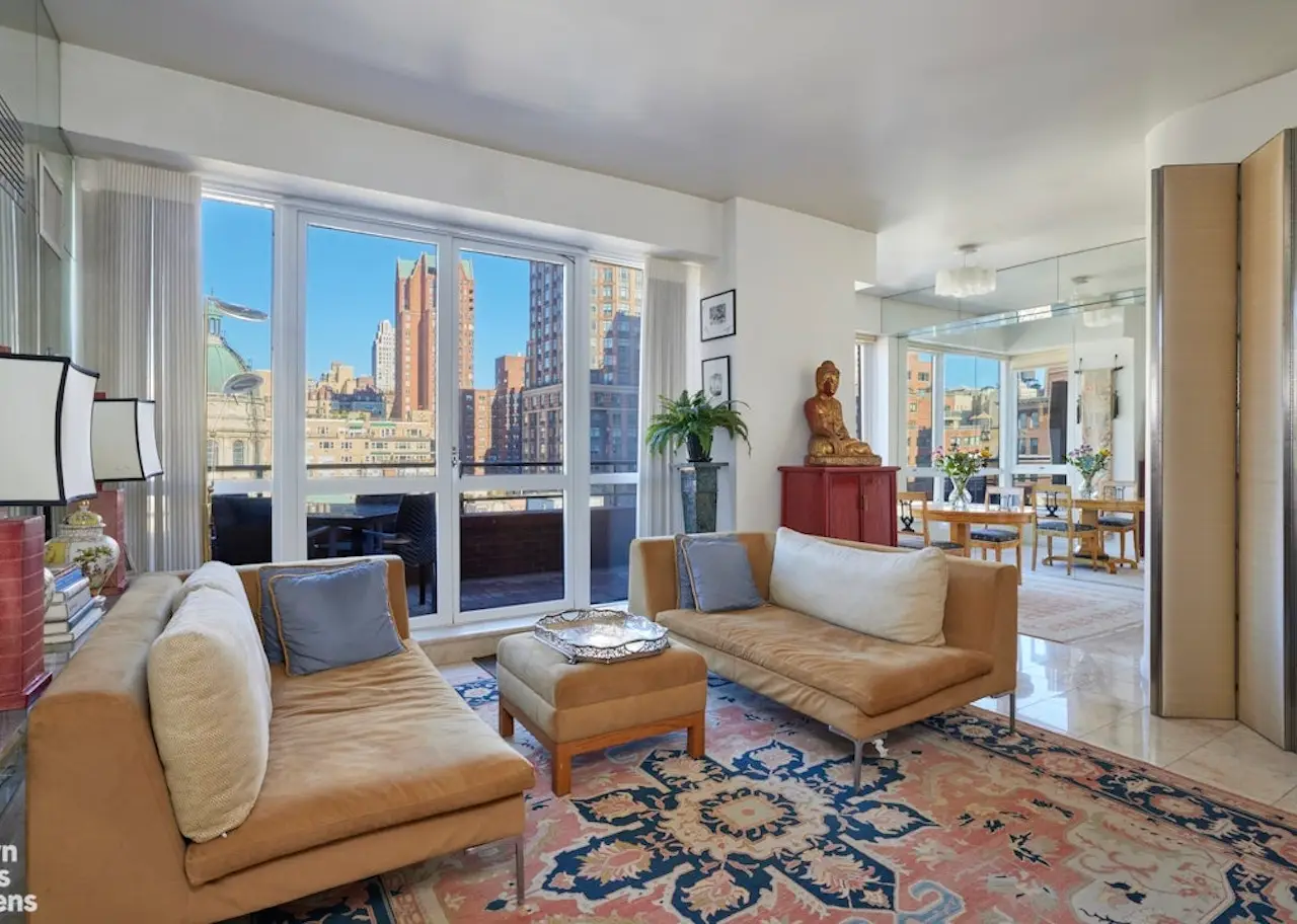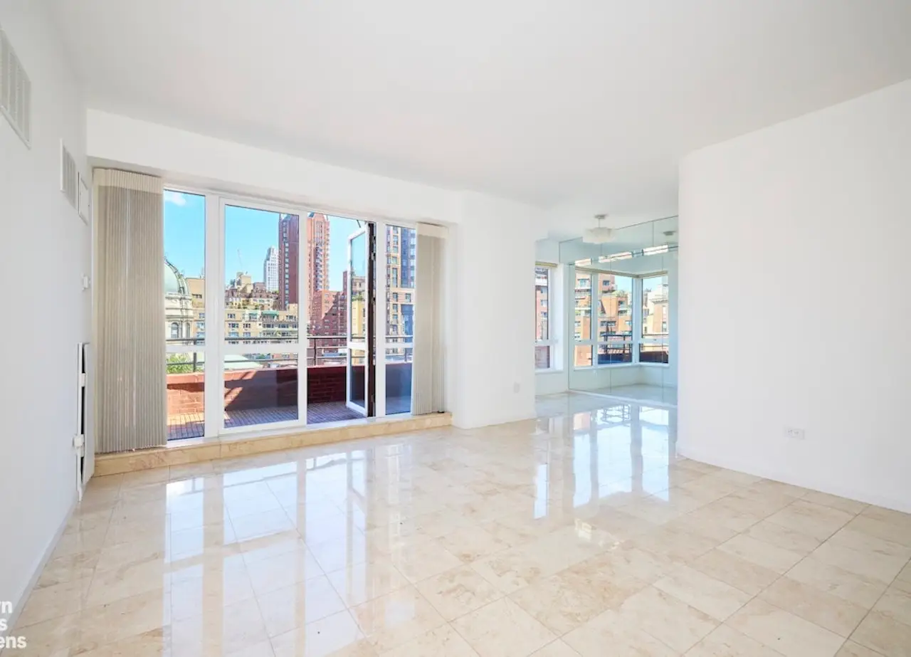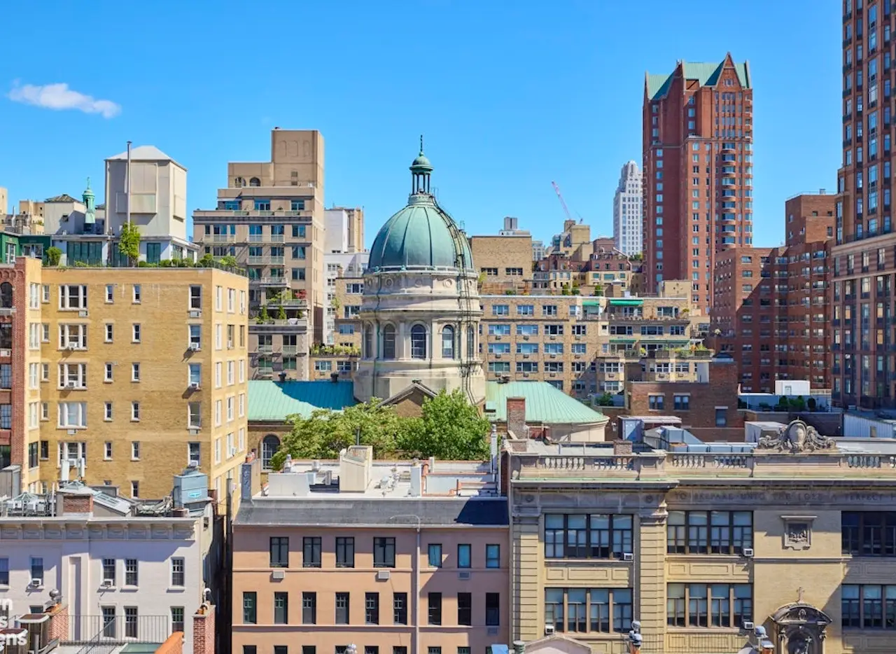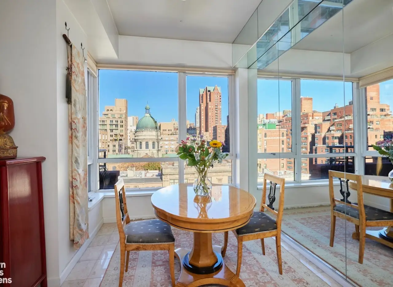 Rarely available in the heart of the Upper East Side, this expansive one-bedroom, 1.5-bath condominium at the Saga House offers the ultimate in city living and comfort. From the moment you step into the elegant foyer, you'll recognize how special this apartment is. Featuring a modernist flair and floor-to-ceiling picture windows throughout, the protected northern views-complete with a striking vista of the dome of St. Jean Baptiste-feel straight out of a Merchant and Ivory film. With ceilings soaring over nine feet and abundant natural light, the apartment radiates sophistication. French doors in the living room lead to a spacious north-facing balcony, the perfect spot for enjoying tranquil outdoor moments. The European-style chef's kitchen boasts ample storage and opens seamlessly into a dedicated corner dining area surrounded in glass, creating an inviting space for entertaining. The serene primary bedroom is generously proportioned and features an en-suite marble bathroom and a large walk-in closet with custom built-ins, offering extensive storage options. A marble-accented powder room conveniently located off the entrance foyer adds to the apartment's functionality. Situated on one of the most picturesque tree-lined blocks of East 74th Street, Saga House is a full-service East Side condominium with 24/7 doormen. Additional amenities include central air-conditioning and an in-unit washer and dryer, ensuring a meticulous blend of convenience and luxury.