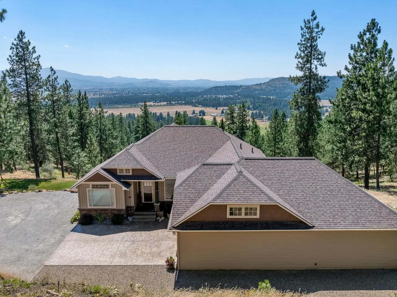 Beautifully maintained custom home in a gated community with sweeping views of Liberty Lake. Main-level living includes the primary suite, kitchen, family room, den, half bath, and laundry. The fully finished daylight basement features two bedrooms with large walk-in closets, a full bath and a spacious family/game room opening to a new patio with an oversized spa. Home highlights include 10' ceilings, radiant floor heating, granite counters, Viking appliances and numerous updates: new roof, siding, gutters, A/C, natural gas boiler, water softener/filtration system, security system, and laundry room upgrades. The oversized 4-car garage (2 wide, 2 deep) has radiant heat & a utility sink. A new 30x40x14 shop with 200A power and 12' door, plus a 10x16 shed, offer great hobby/storage space. Nestled on 5 serene acres with amazing views, privacy, security, and a cleared area ready for a future sport/pickleball court. Peaceful yet convenient to Spokane, Liberty Lake, and Coeur d'Alene.