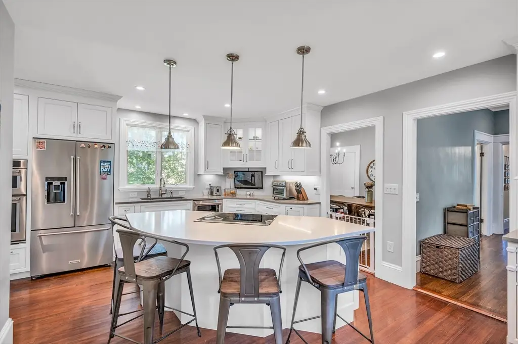 This beautifully renovated 1880 Victorian blends historic charm with modern comfort. Original details like ceiling medallions and arched doorways meet recessed lighting, radiant heated floors, and soaring 9'7" ceilings. Spacious rooms and bay windows enhance both family living and entertaining. The chefÆs kitchen features Wood Mode custom cabinetry, high-end appliancesùincluding an induction stove and bonus fridge drawersùand a large island perfect for gathering. A mudroom with heated floors and a main-floor bath add everyday convenience. Upstairs, the primary suite includes a luxurious bath with a clawfoot tub and custom closet. Two additional bedrooms, a marble full bath, and laundry complete the upper level. Sited on 13,000 sq.ft. lot surrounded by lush trees this home has a lovely yard a 1+car garage, EV charger. A commuter's dream: easy access to the Riverside T, I 95 the Pike. Near Lasell University + Newton Wellesley Hospital. Williams Elementary, Brown Middle, Newton South.