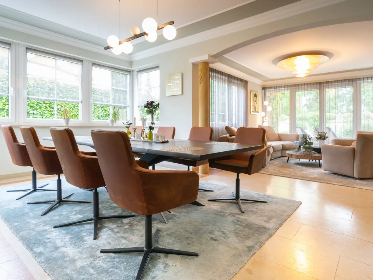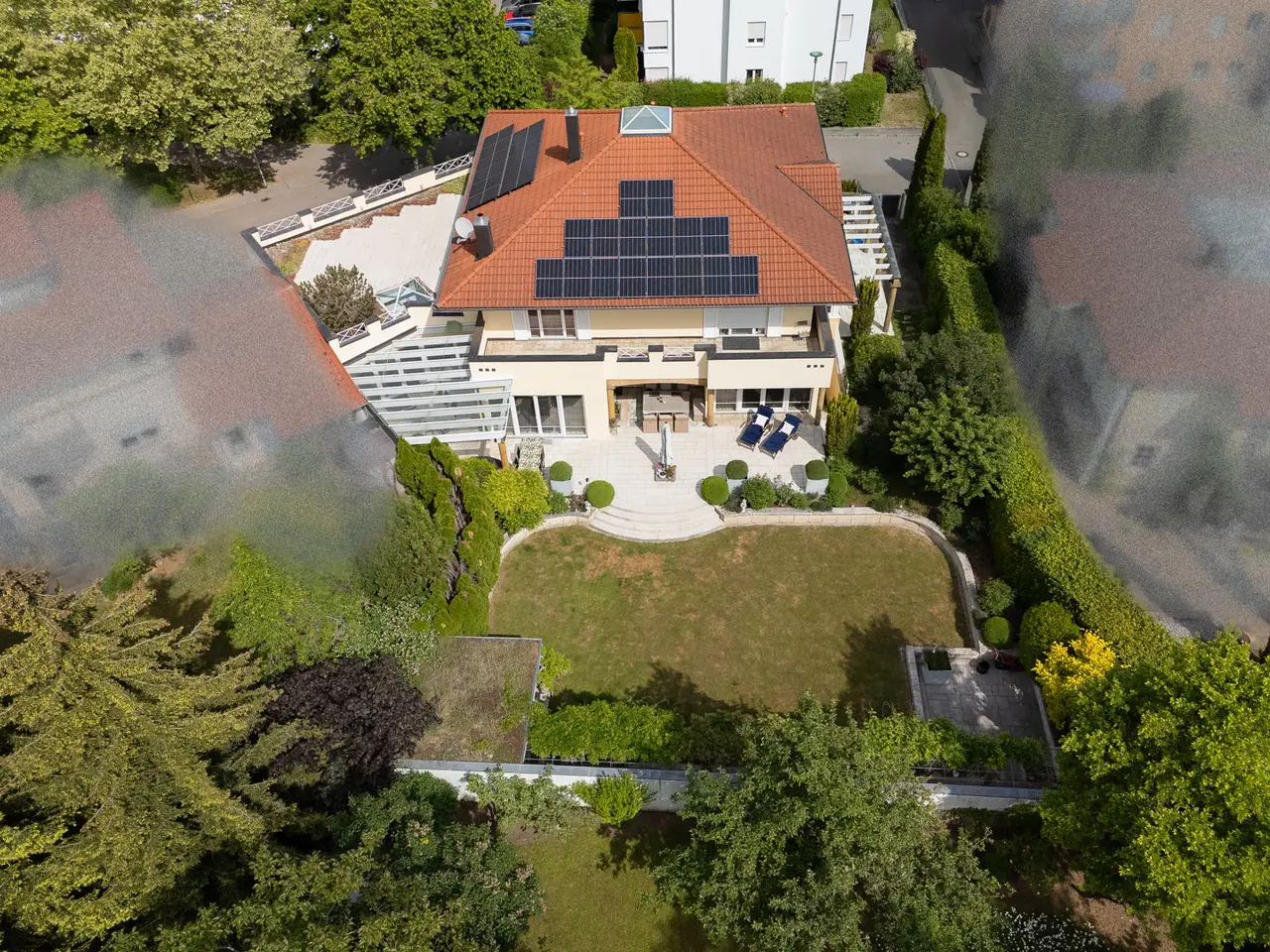 Welcome to a property that offers more than just living space - it embodies a lifestyle. This extraordinary town villa, built in 2004, stands on a generous plot of approx. 981 m² and combines sophisticated architecture, modern technology and pure quality of life on around 412 m² of living space. As soon as you enter the prestigious entrance hall, you can sense the special character of this house: high-quality marble, gold-plated accents and an architecturally sophisticated interior design welcome residents and guests with a touch of grandeur. The spaciousness is continued in all areas - spread over two full floors, a total of eight stylish rooms await you, including up to four bedrooms. Three elegantly appointed bathrooms and a separate guest WC provide the necessary comfort for families and discerning visitors. At the heart of the house is the open-plan living and dining area - flooded with light, with a view of the greenery and equipped with a fireplace that provides warmth and atmosphere in the evenings. A high-quality, as-new fitted kitchen blends seamlessly into the elegant overall concept and invites you to enjoy moments of cooking pleasure. A special highlight is the exclusive wellness area with sauna, shower and WC - your very own personal retreat for relaxation and recreation. The villa also impresses with its diversity in the outdoor area: two spacious terraces, a stylish covered outdoor seating area and a pergola with an outdoor fireplace create space for spending time together outdoors. The additional roof terrace offers a wonderful view over the surrounding area - perfect for sunny afternoons or relaxed evenings with friends. Technically, the villa is of the highest standard: a sophisticated heating system consisting of stove, central and underfloor heating ensures a pleasant indoor climate all year round. A modern BUS system and an alarm system ensure a high level of comfort, efficiency and security. The space available for cars also leaves nothing to be desired: The spacious triple garage offers comfortable space for three vehicles, supplemented by three additional outdoor parking spaces - ideal for families with several vehicles or for visitors. The house has a full basement and, with approx. 172 m² of usable space, opens up additional possibilities - whether for hobbies, fitness or storage. An integrated photovoltaic system operates on the modern hipped roof, making a sustainable contribution to energy efficiency. The solid brick construction stands for quality, durability and a healthy living environment. The location? Also exceptional: the historic old town of Nördlingen - one of the most charming towns in southern Germany - is just a three-minute walk away. And yet here you can enjoy a quiet, upscale living environment with plenty of privacy and perfect connections. Schools, kindergartens, medical care and shopping facilities are in the immediate vicinity - an ideal environment for families, doctors and discerning individualists. This villa is not just a home - it is a place of inspiration, tranquillity and representation. Come and see this rare offer for yourself and be inspired by a personal viewing.