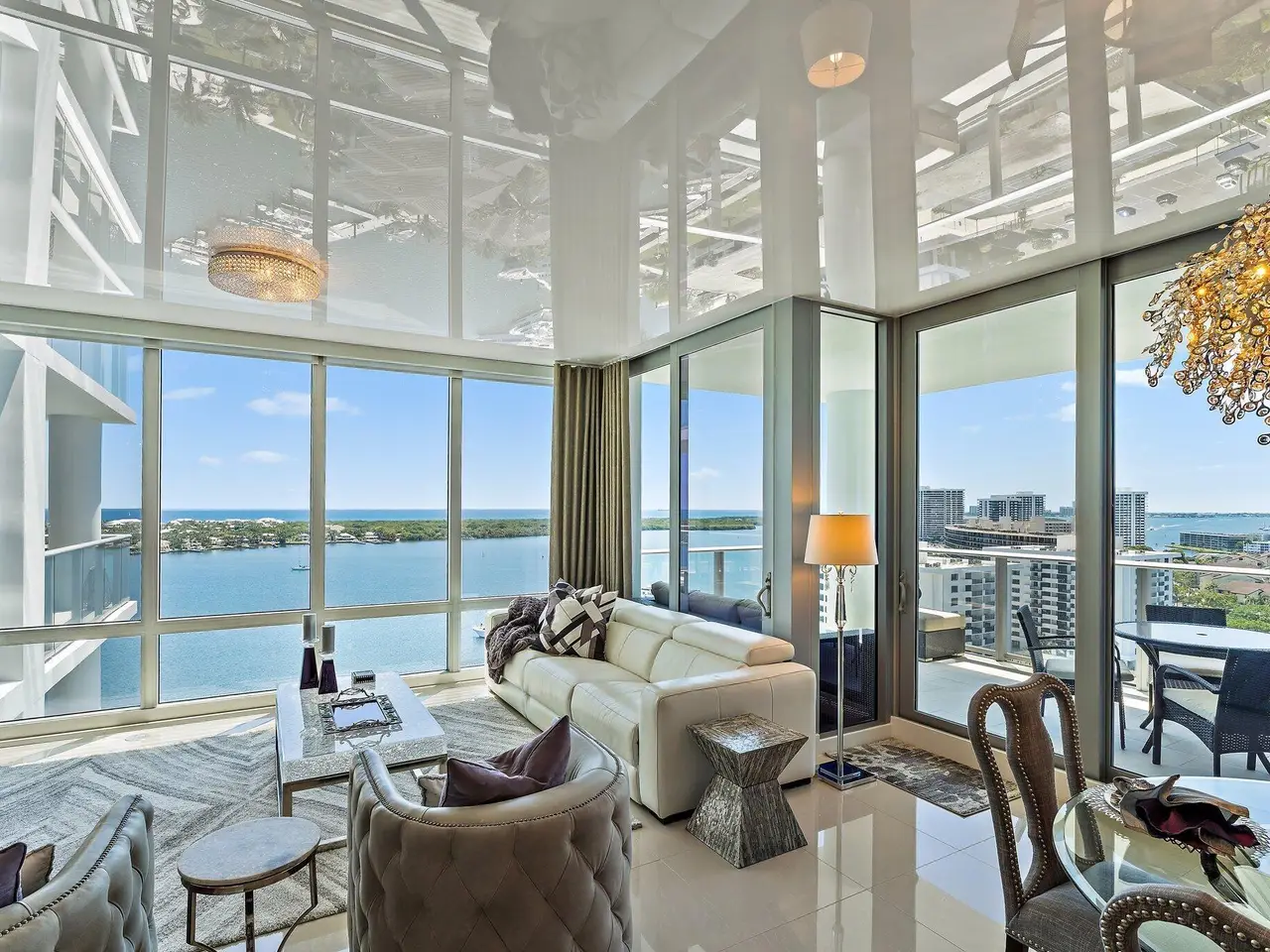 Enjoy amazing views to the ocean, Lake Worth Lagoon, and as far South as The Breakers Hotel in Palm Beach from this ultra-luxury ''Cobalt'' floor plan in Water Club. This unit has a den/office that could serve as a 3rd bedroom with use of the hall Power Room on those rare occasions when you have an extra guest. Best of all, Water Club has world class amenities like 24/7 manned and gated security, private elevator lobbies, under building parking, a private clubhouse with bar and billiards table, resort style pool, day docks, lap pool, fitness center with yoga/pilates studio, spa, fire pits, pickle ball court, guest suites, and more..