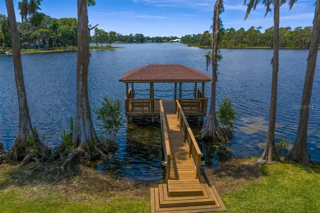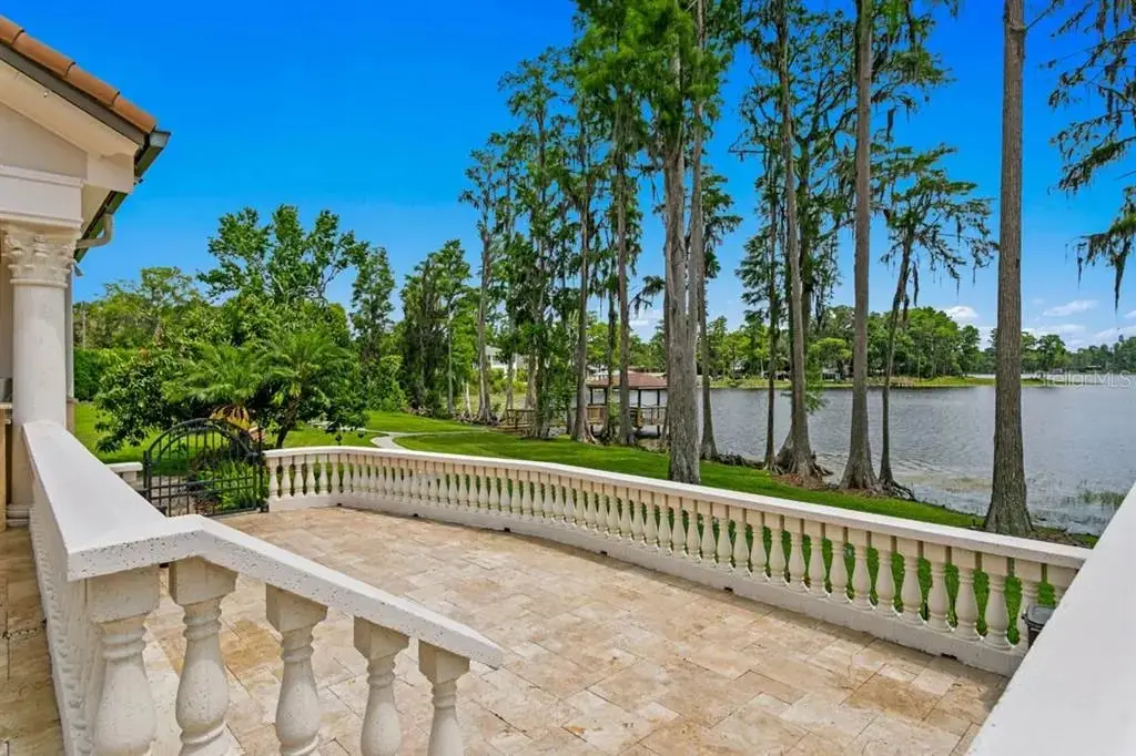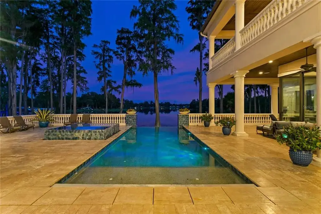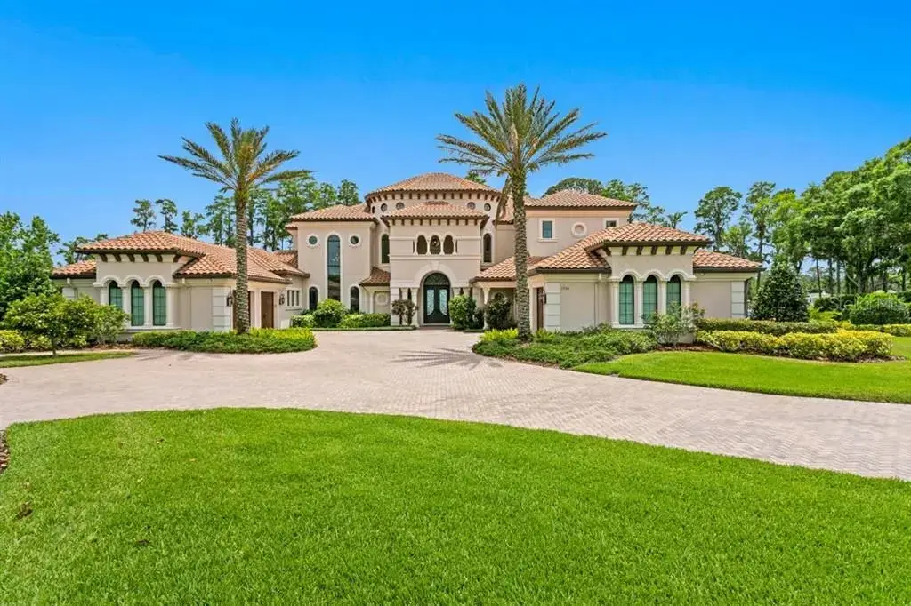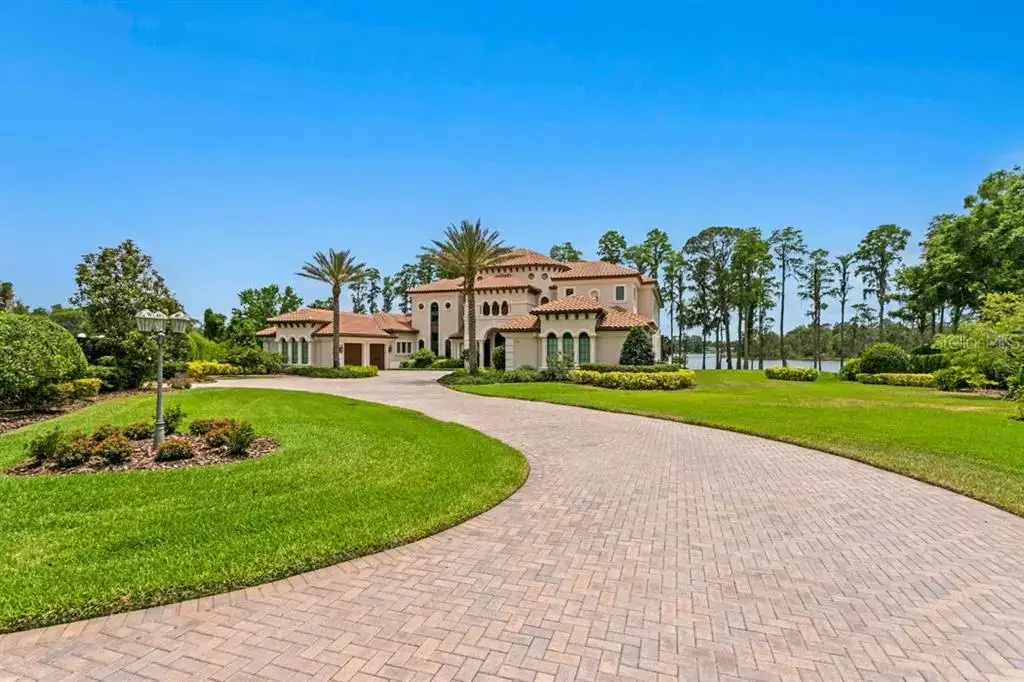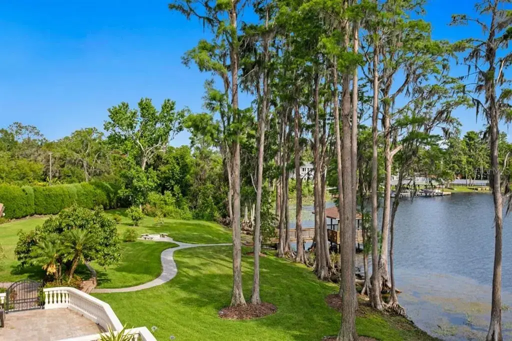 Gated lakefront estate offering space, privacy, and a stunning natural setting—17124 Crawley Road in Odessa is a rare opportunity to live expansively on nearly 6 acres along the tranquil shoreline of Rainbow Lake. With 300 feet of private lake frontage, this custom residence offers 10,545 square feet of living space. Built for both comfort and entertaining, the main house includes 5 bedrooms, 6 full baths, 2 half baths, entertainment space, gym, study, and 2 attached garages—one on each side of the home—designed for convenience and symmetry. Separate guest house features 1 bedroom and 1 full bath. The estate is finished with a pool, spa, and private dock—all with no HOA or CDD fees. Step through the grand double doors into a sweeping foyer with a dramatic double staircase. Straight ahead, the formal living room welcomes you with nearly 24-foot ceilings, gas fireplace, and open view to the pool and lake beyond. The spacious family room serves as a relaxed space with TV, electric fireplace, and sliding glass doors that lead seamlessly to the outdoor terrace. At the heart of the home, the kitchen is both stylish and functional—featuring a striking Cianitus granite island and Cambria Menai quartz on the perimeter, along with a gas range with 1.5 ovens, a separate wall oven, pot filler, microwave and refrigerator, and thoughtful storage. Nearby butler’s pantry with granite countertops and wine refrigerator connects the kitchen to the formal dining room, ideal for entertaining or daily living. Downstairs also includes a primary suite with a fireplace and sitting area, dual custom closets, and a spa-style bath with freestanding tub and oversized walk-in shower. 2 additional ensuite bedrooms are located on the main level. A dedicated study with soaring ceilings and separate gym complete the thoughtful main-level layout. Upstairs, 2 large suites offer the flexibility of dual primary bedrooms, each with its own full bath and walk-in closet. Just beyond, a large entertainment area includes a sunken game room, wet bar with refrigerator, and balcony with balustrades—perfect for entertaining or relaxing. Throughout the home, 8-foot doors, wood flooring, detailed crown and tray ceilings, and custom-finished walk-in closets in every bedroom enhance the design, while both upstairs and downstairs laundry rooms and electric vehicle charging station in the garage add everyday convenience. The separate guest cabana offers a refined yet relaxed extension of the home’s living space. Located just off the pool, it includes a built-in TV, crown and tray ceilings, and walk-in closet, along with full bath and bar with refrigerator. The grounds are the heart of this property. Designed by Ryan Hughes Design Build, the outdoor spaces are a blend of texture, scale, and serenity. Stacked stone retaining walls, lush gardens, fruit trees, and paver walkways surround a heated saltwater pool and spa, fire pit, covered terrace, full summer kitchen, and a separate outdoor full bath for added convenience. At the water’s edge, a private dock features electricity and nautical rope detailing, offering direct access to Rainbow Lake. Located in the heart of Odessa—where luxury homes, wide-open spaces, and natural beauty converge—this estate captures the essence of lakefront living with the convenience of being just minutes from Tampa, major roadways, and top-tier amenities. A rare opportunity to live expansively, privately, and beautifully.