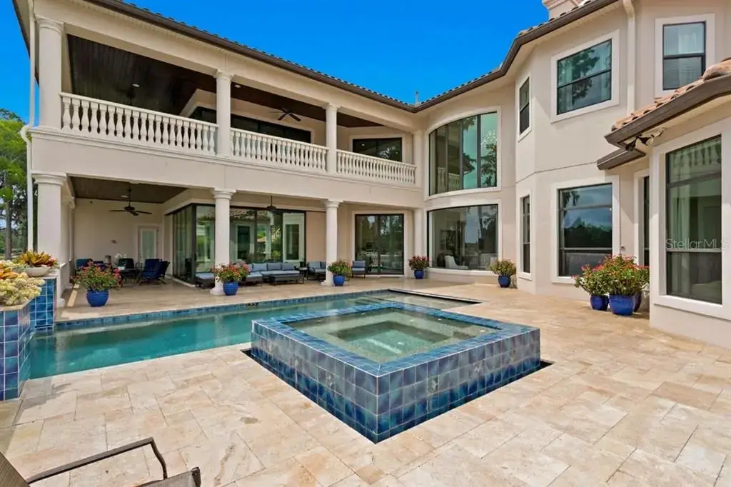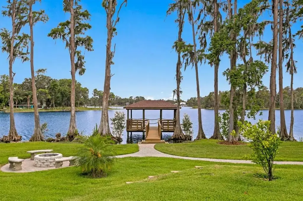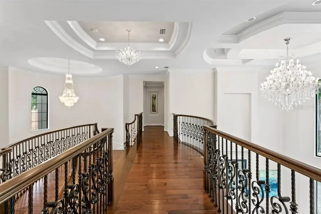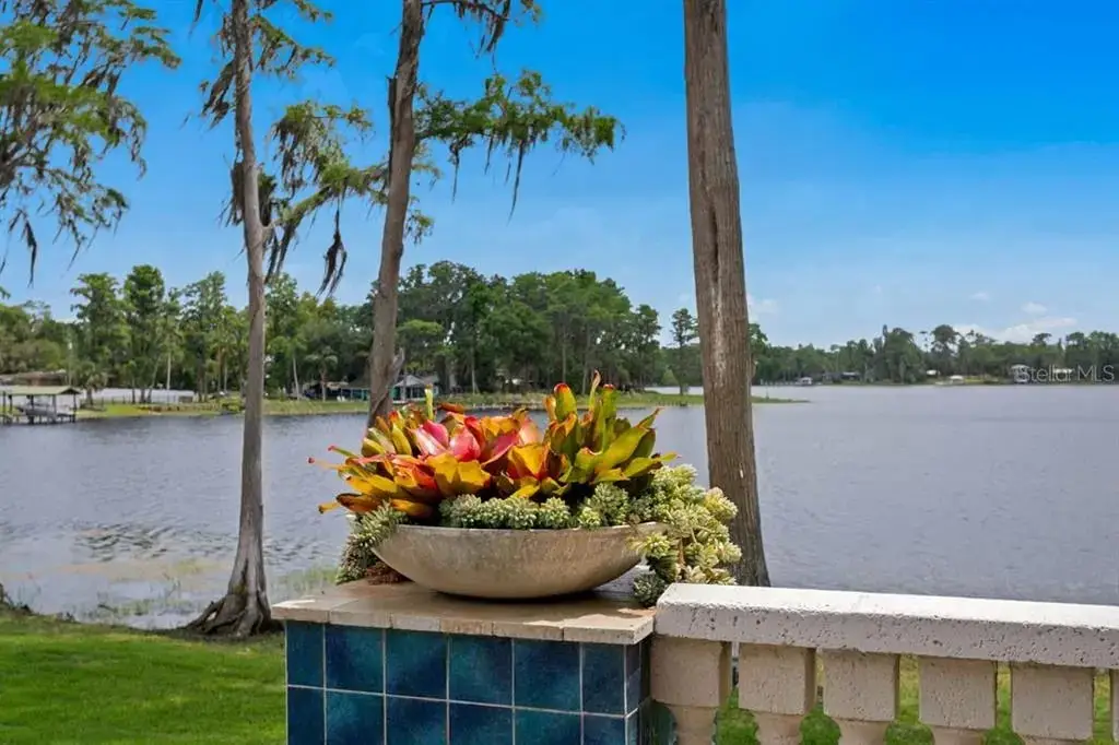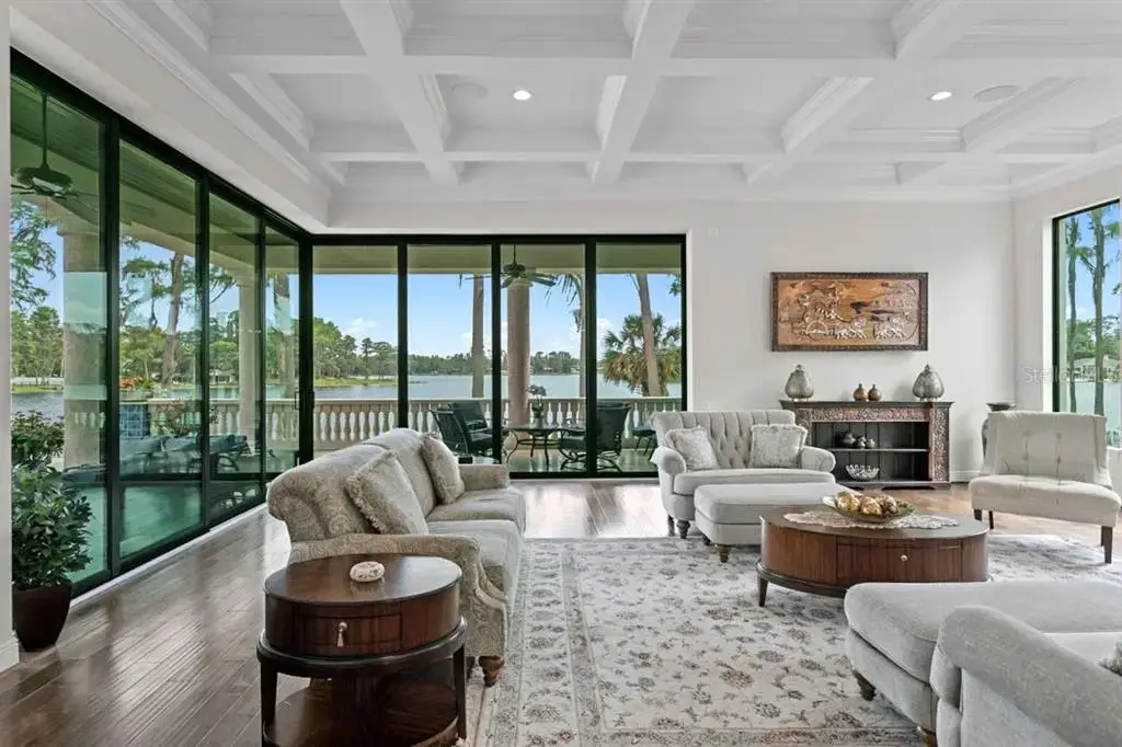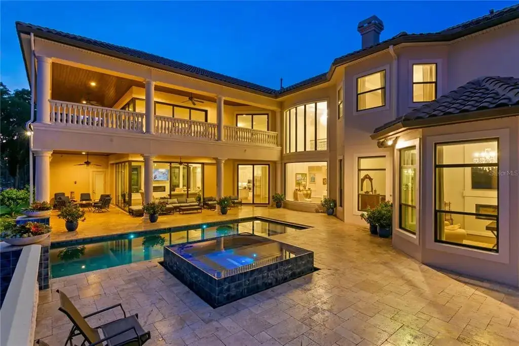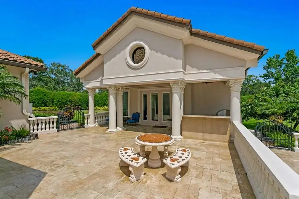 Gated lakefront estate offering space, privacy, and a stunning natural setting—17124 Crawley Road in Odessa is a rare opportunity to live expansively on nearly 6 acres along the tranquil shoreline of Rainbow Lake. With 300 feet of private lake frontage, this custom residence offers 10,545 square feet of living space. Built for both comfort and entertaining, the main house includes 5 bedrooms, 6 full baths, 2 half baths, entertainment space, gym, study, and 2 attached garages—one on each side of the home—designed for convenience and symmetry. Separate guest house features 1 bedroom and 1 full bath. The estate is finished with a pool, spa, and private dock—all with no HOA or CDD fees. Step through the grand double doors into a sweeping foyer with a dramatic double staircase. Straight ahead, the formal living room welcomes you with nearly 24-foot ceilings, gas fireplace, and open view to the pool and lake beyond. The spacious family room serves as a relaxed space with TV, electric fireplace, and sliding glass doors that lead seamlessly to the outdoor terrace. At the heart of the home, the kitchen is both stylish and functional—featuring a striking Cianitus granite island and Cambria Menai quartz on the perimeter, along with a gas range with 1.5 ovens, a separate wall oven, pot filler, microwave and refrigerator, and thoughtful storage. Nearby butler’s pantry with granite countertops and wine refrigerator connects the kitchen to the formal dining room, ideal for entertaining or daily living. Downstairs also includes a primary suite with a fireplace and sitting area, dual custom closets, and a spa-style bath with freestanding tub and oversized walk-in shower. 2 additional ensuite bedrooms are located on the main level. A dedicated study with soaring ceilings and separate gym complete the thoughtful main-level layout. Upstairs, 2 large suites offer the flexibility of dual primary bedrooms, each with its own full bath and walk-in closet. Just beyond, a large entertainment area includes a sunken game room, wet bar with refrigerator, and balcony with balustrades—perfect for entertaining or relaxing. Throughout the home, 8-foot doors, wood flooring, detailed crown and tray ceilings, and custom-finished walk-in closets in every bedroom enhance the design, while both upstairs and downstairs laundry rooms and electric vehicle charging station in the garage add everyday convenience. The separate guest cabana offers a refined yet relaxed extension of the home’s living space. Located just off the pool, it includes a built-in TV, crown and tray ceilings, and walk-in closet, along with full bath and bar with refrigerator. The grounds are the heart of this property. Designed by Ryan Hughes Design Build, the outdoor spaces are a blend of texture, scale, and serenity. Stacked stone retaining walls, lush gardens, fruit trees, and paver walkways surround a heated saltwater pool and spa, fire pit, covered terrace, full summer kitchen, and a separate outdoor full bath for added convenience. At the water’s edge, a private dock features electricity and nautical rope detailing, offering direct access to Rainbow Lake. Located in the heart of Odessa—where luxury homes, wide-open spaces, and natural beauty converge—this estate captures the essence of lakefront living with the convenience of being just minutes from Tampa, major roadways, and top-tier amenities. A rare opportunity to live expansively, privately, and beautifully.