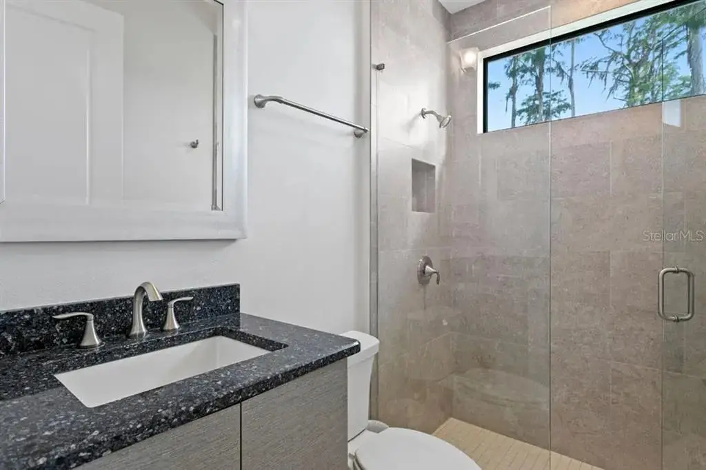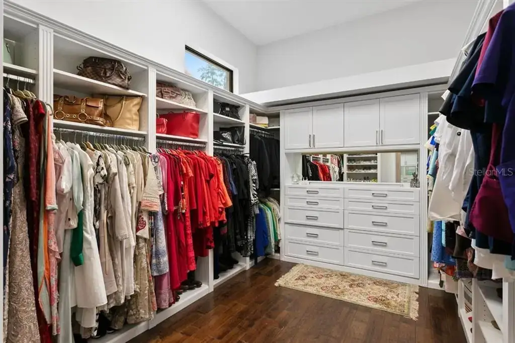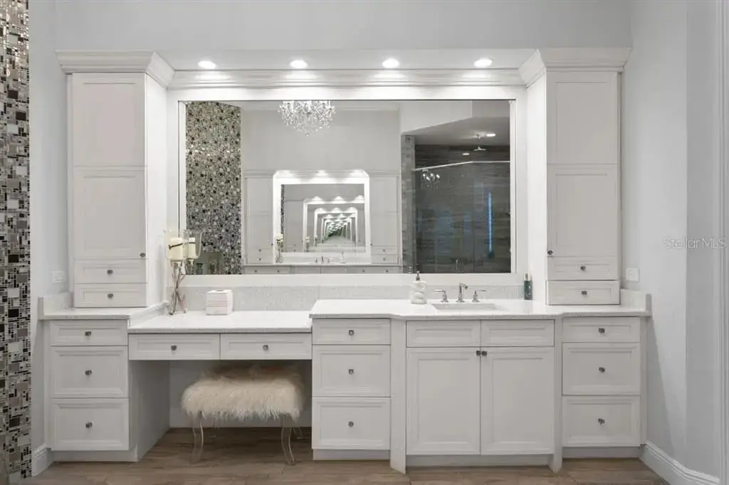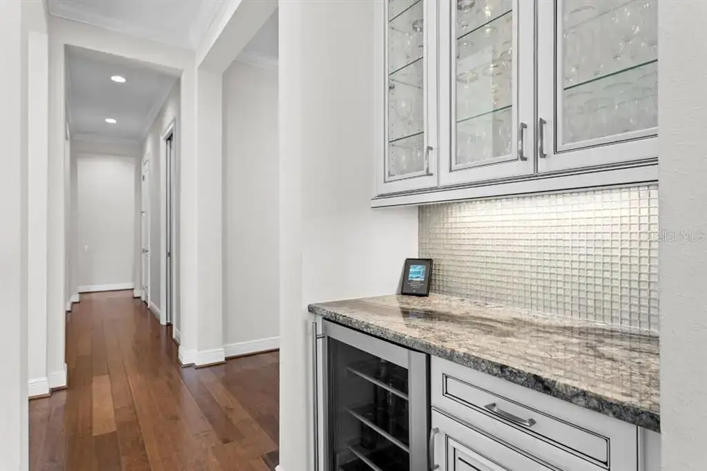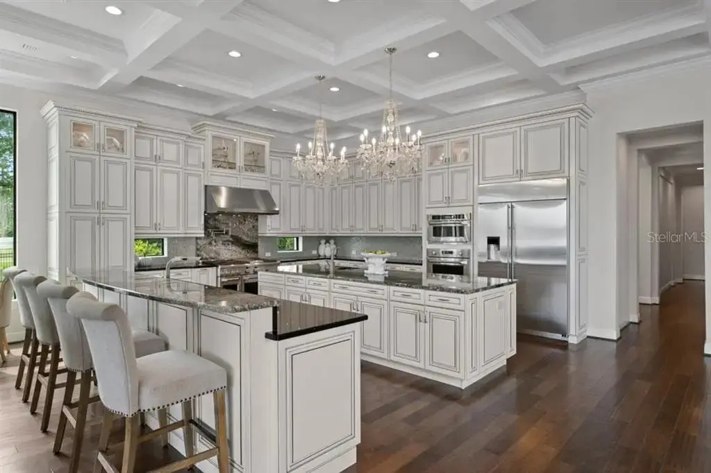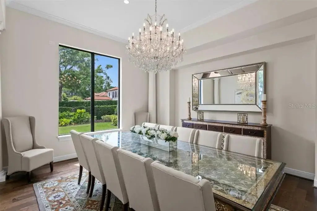 Gated lakefront estate offering space, privacy, and a stunning natural setting—17124 Crawley Road in Odessa is a rare opportunity to live expansively on nearly 6 acres along the tranquil shoreline of Rainbow Lake. With 300 feet of private lake frontage, this custom residence offers 10,545 square feet of living space. Built for both comfort and entertaining, the main house includes 5 bedrooms, 6 full baths, 2 half baths, entertainment space, gym, study, and 2 attached garages—one on each side of the home—designed for convenience and symmetry. Separate guest house features 1 bedroom and 1 full bath. The estate is finished with a pool, spa, and private dock—all with no HOA or CDD fees. Step through the grand double doors into a sweeping foyer with a dramatic double staircase. Straight ahead, the formal living room welcomes you with nearly 24-foot ceilings, gas fireplace, and open view to the pool and lake beyond. The spacious family room serves as a relaxed space with TV, electric fireplace, and sliding glass doors that lead seamlessly to the outdoor terrace. At the heart of the home, the kitchen is both stylish and functional—featuring a striking Cianitus granite island and Cambria Menai quartz on the perimeter, along with a gas range with 1.5 ovens, a separate wall oven, pot filler, microwave and refrigerator, and thoughtful storage. Nearby butler’s pantry with granite countertops and wine refrigerator connects the kitchen to the formal dining room, ideal for entertaining or daily living. Downstairs also includes a primary suite with a fireplace and sitting area, dual custom closets, and a spa-style bath with freestanding tub and oversized walk-in shower. 2 additional ensuite bedrooms are located on the main level. A dedicated study with soaring ceilings and separate gym complete the thoughtful main-level layout. Upstairs, 2 large suites offer the flexibility of dual primary bedrooms, each with its own full bath and walk-in closet. Just beyond, a large entertainment area includes a sunken game room, wet bar with refrigerator, and balcony with balustrades—perfect for entertaining or relaxing. Throughout the home, 8-foot doors, wood flooring, detailed crown and tray ceilings, and custom-finished walk-in closets in every bedroom enhance the design, while both upstairs and downstairs laundry rooms and electric vehicle charging station in the garage add everyday convenience. The separate guest cabana offers a refined yet relaxed extension of the home’s living space. Located just off the pool, it includes a built-in TV, crown and tray ceilings, and walk-in closet, along with full bath and bar with refrigerator. The grounds are the heart of this property. Designed by Ryan Hughes Design Build, the outdoor spaces are a blend of texture, scale, and serenity. Stacked stone retaining walls, lush gardens, fruit trees, and paver walkways surround a heated saltwater pool and spa, fire pit, covered terrace, full summer kitchen, and a separate outdoor full bath for added convenience. At the water’s edge, a private dock features electricity and nautical rope detailing, offering direct access to Rainbow Lake. Located in the heart of Odessa—where luxury homes, wide-open spaces, and natural beauty converge—this estate captures the essence of lakefront living with the convenience of being just minutes from Tampa, major roadways, and top-tier amenities. A rare opportunity to live expansively, privately, and beautifully.