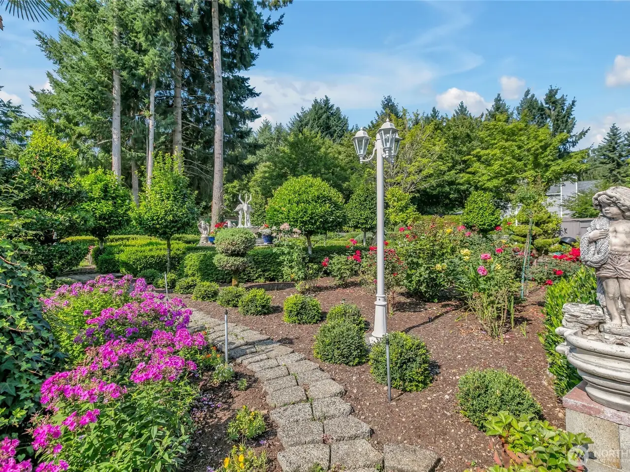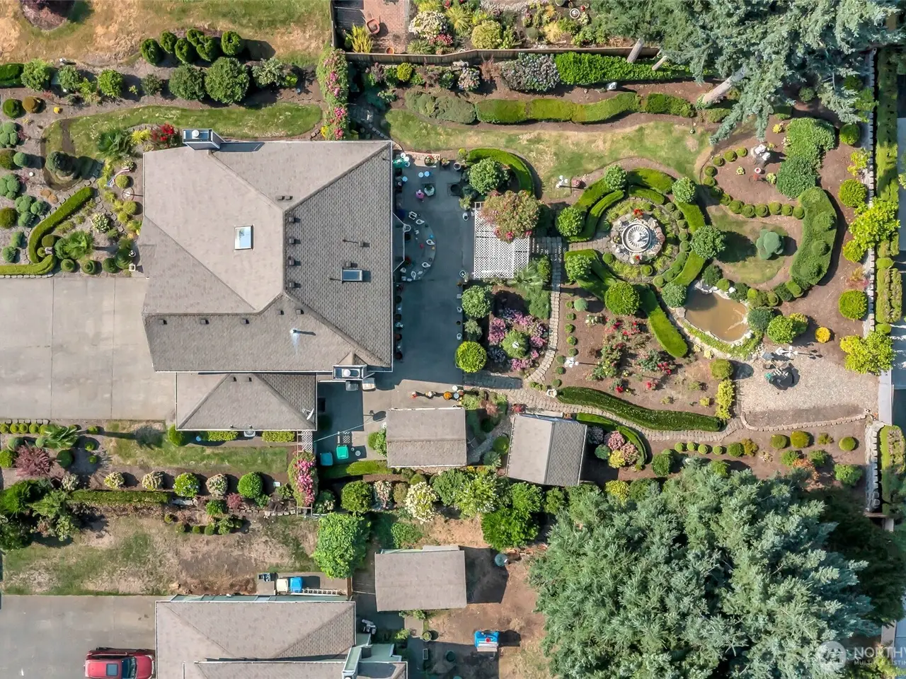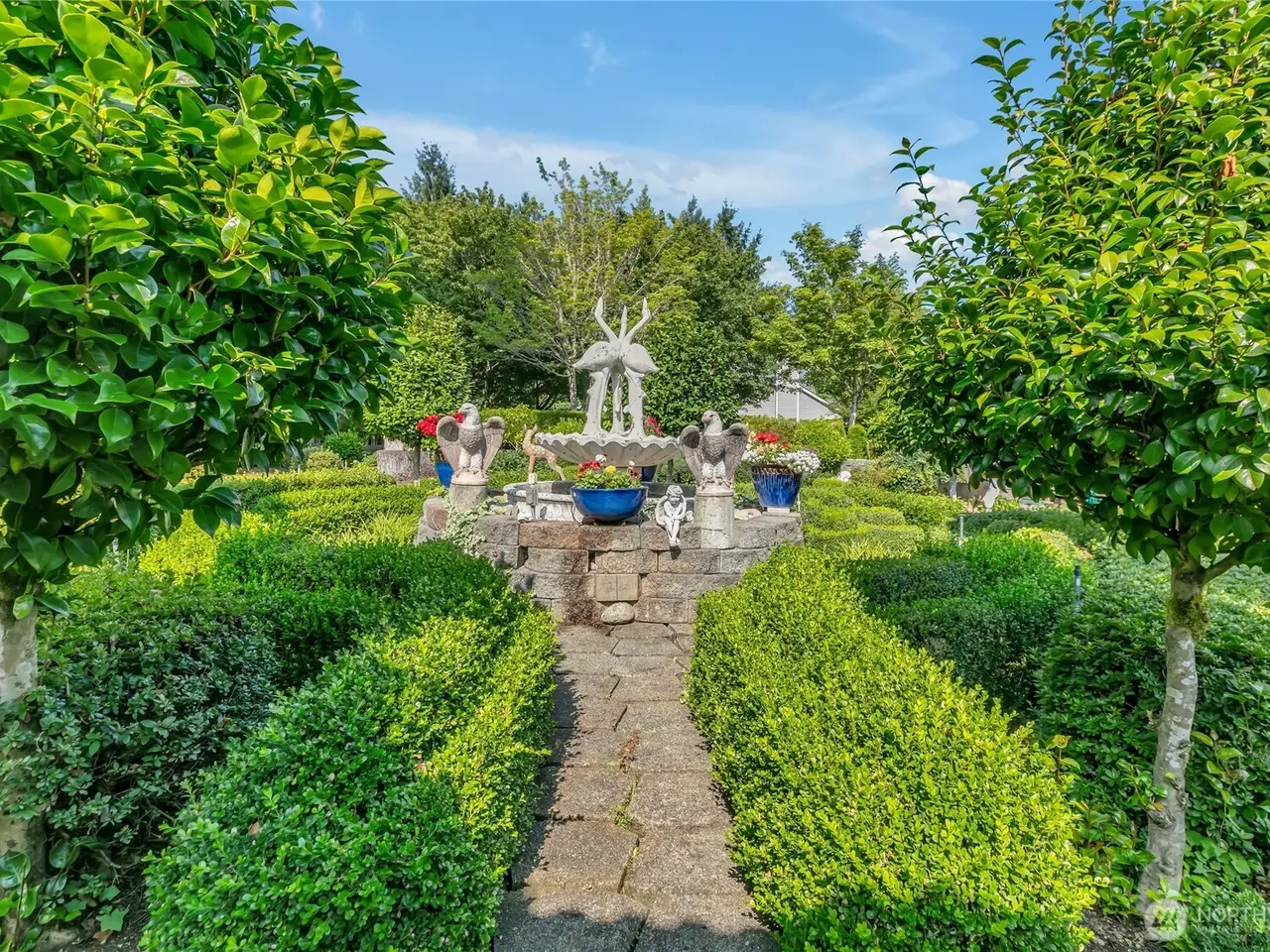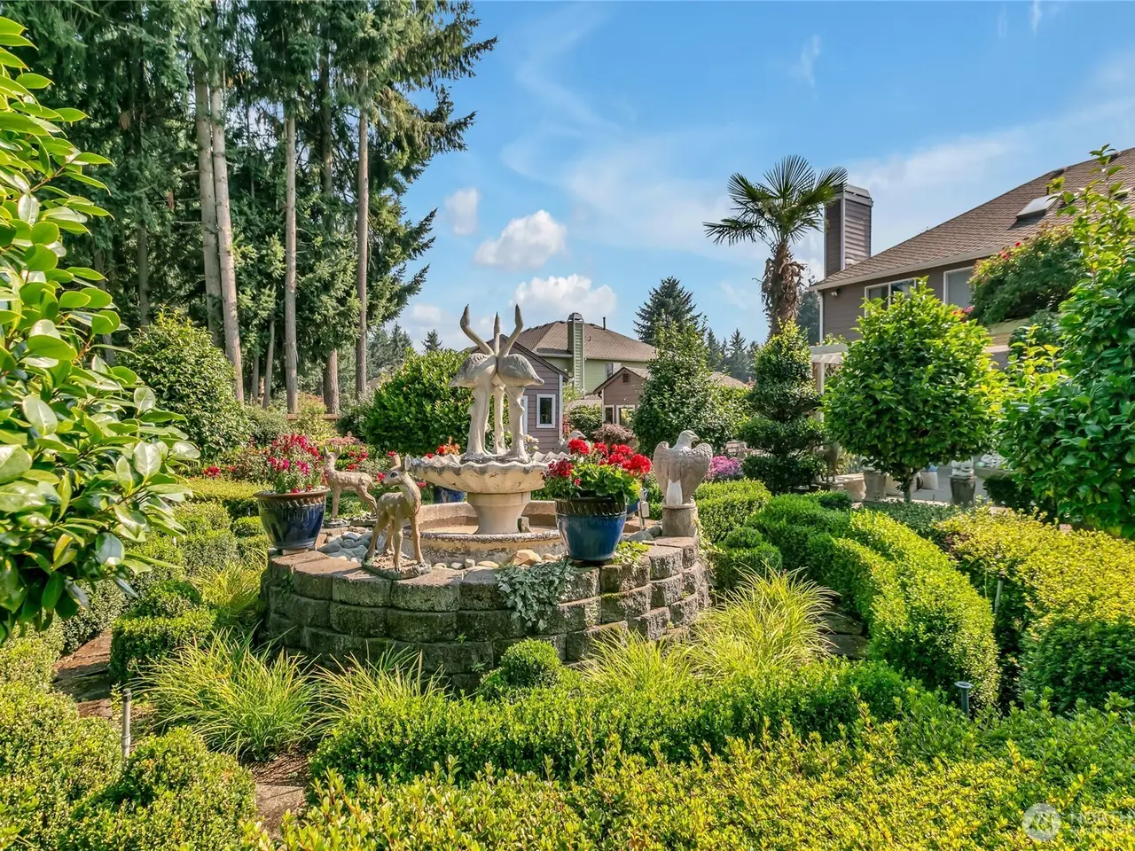 Discover a home where elegance meets lifestyle in this 4-bedroom residence with loft and bonus room. The inviting stone-accented exterior, arched entry, and covered porch with water feature welcome you inside to soaring ceilings, arched walls, & radiant Czech crystal chandeliers. The gourmet kitchen with island, gas cooktop, and double oven flows seamlessly to the dining area and family room with fireplace, perfect for gathering and entertaining in comfort. Retreat to the vaulted primary suite, unwind in the versatile living spaces, and enjoy year-round comfort with A/C. Outside, the private garden retreat enchants with stone paths, fountains, gazebo, pond, oversized patio, & relaxing hot tub. An entertainer's dream and gardener's paradise