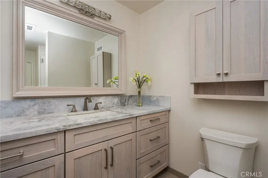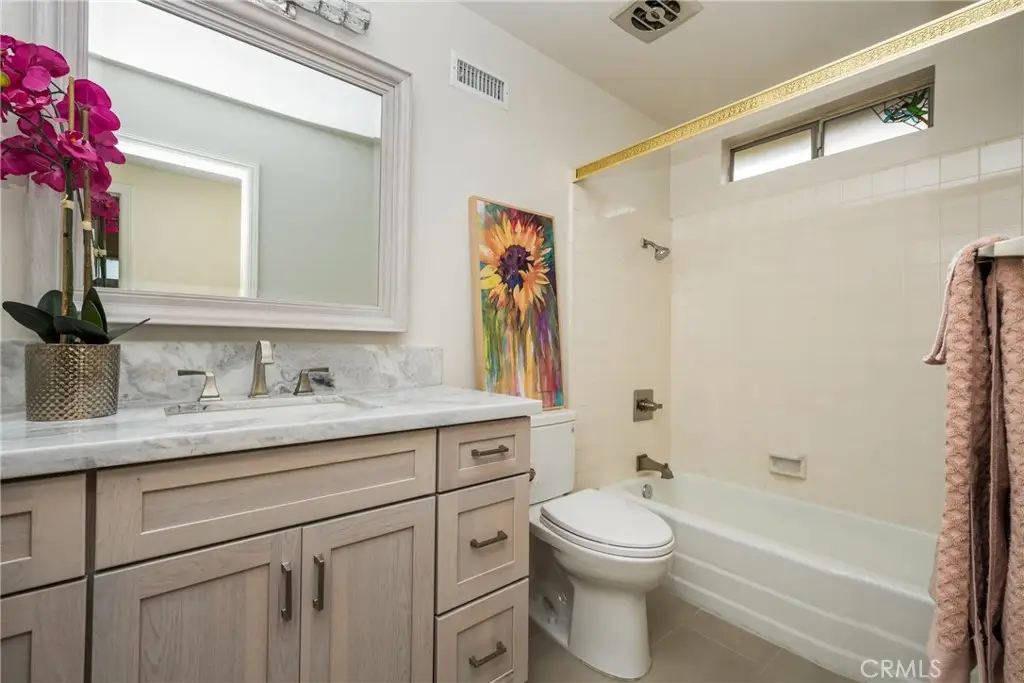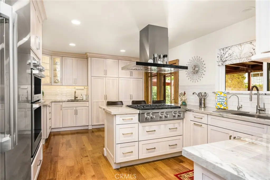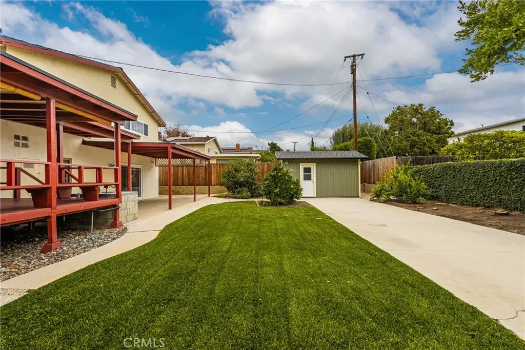 Welcome to this beautifully upgraded 4-bedroom, 3-bathroom home offering 2,121 sq ft of thoughtfully designed living space. With a downstairs bedroom and full bath, this layout is perfect for guests or multigenerational living. At the heart of the home is the Designer Chef's Kitchen, featuring premium appliances: Sub-Zero Dacor refrigerator, Dacor double oven with warming drawer, Wolf 6-burner cooktop, Bosch dishwasher, and Dacor convection microwave. Enjoy the gorgeous Quartzite countertops, vegetable prep sink, and custom pull-out shelving make this a dream kitchen for any culinary enthusiast. All bathrooms have been tastefully updated with elegant Kraft Maid birch wood cabinetry, adding warmth and sophistication throughout the home. The home boasts 3/4-inch Hickory wood floors, recessed lighting and ceiling fans perfect for those warm summer days. Outside, entertain in style under the custom - built covered patio, perfect for alfresco dining. The expansive backyard is a private oasis featuring mature Hass avocado, orange, lime, and kumquat trees, plus a convenient slab sink for barbequing. On opposite sides of the yard, you'll find two custom built 8x16 sheds complete with insulation, drywall, windows, and 3-amp wiring offers exceptional additional space. Additional highlights include RV parking with remote controlled gate access, Noritz tankless water heater, reverse Osmosis water system, a Vertex security system, with multiple cameras for added coverage, newer ductwork, and a 3-year-old composition shingle roof with 50-year warranty. A rare find that blends luxury finishes, thoughtful upgrades, and versatile outdoor space - this home is truly the total package!