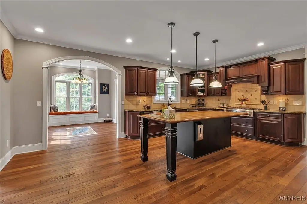 Exceptional Custom Home with Every Upgrade! Built in 2014, this stunning custom-designed residence offers an impressive blend of luxury and functionality. The spacious and welcoming foyer opens to a formal dining room and a versatile living room or office featuring a cozy fireplace. Throughout the main level, you'll find rich hickory hardwood floors, elegant curved archways, 9-foot ceilings, and detailed custom trim and moldings. The gourmet kitchen is a showstopper, boasting cherry cabinetry, granite countertops, a huge center island, high-end Thermador stainless appliances, 6 burner stove, a butler's pantry w/wine cooler, a walk-in pantry, and a charming morning room. The expansive Great Room features a second fireplace, built-in shelving and floor-to-ceiling windows overlooking the serene, wooded backyard. A side load garage with 2 Electric Car charging stations, leads to a thoughtfully designed mudroom with additional built-ins. Upstairs, you'll find four generously sized bedrooms, each with Custom Closets, and a convenient second-floor laundry room! The luxurious primary suite includes a tray ceiling, two walk-in closets, a spa-like bathroom with a walk-in shower and a Jacuzzi tub. The stunningly finished daylight basement adds even more living space, complete with egress window, a third fireplace with stone surround, built-in cabinetry and a full bathroom! The backyard offers both a covered (with lighting) and open porch for all your entertaining. Additional highlights include a whole-house generator (2018), 2nd furnace (2022), Central Air, Amish-built shed, central vacuum system, Leaf Filter gutter guards, wired for outdoor speaker system and a security system. This home truly has it all - every detail meticulously crafted. Don't miss the opportunity to make this exceptional property yours!