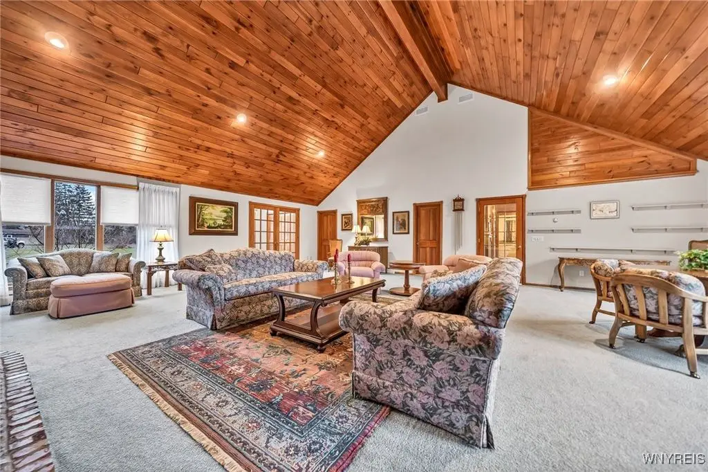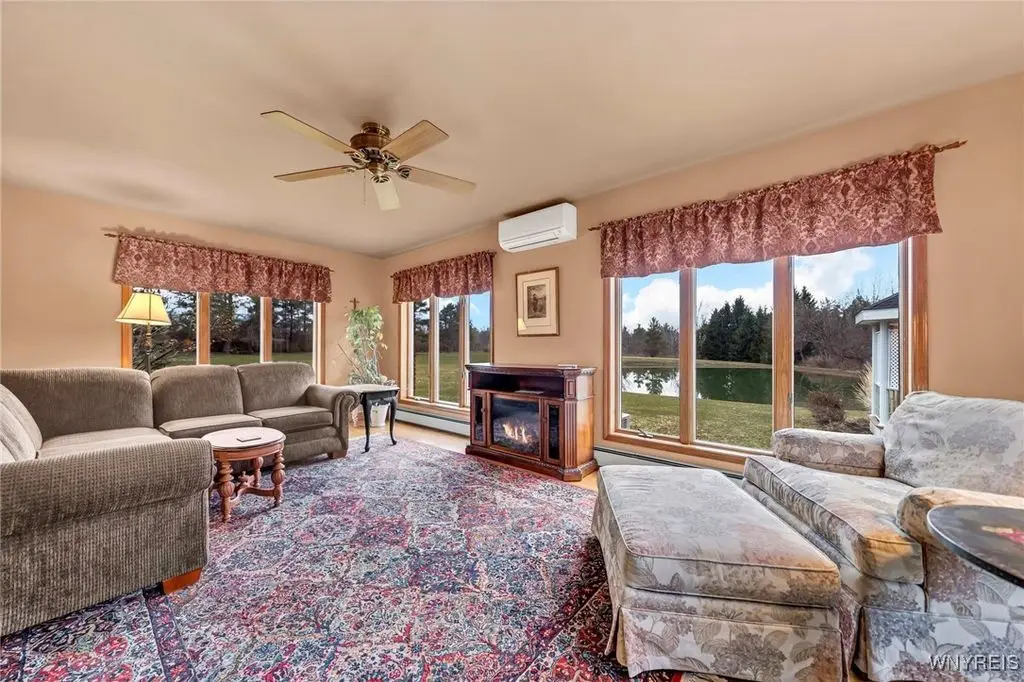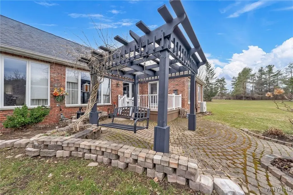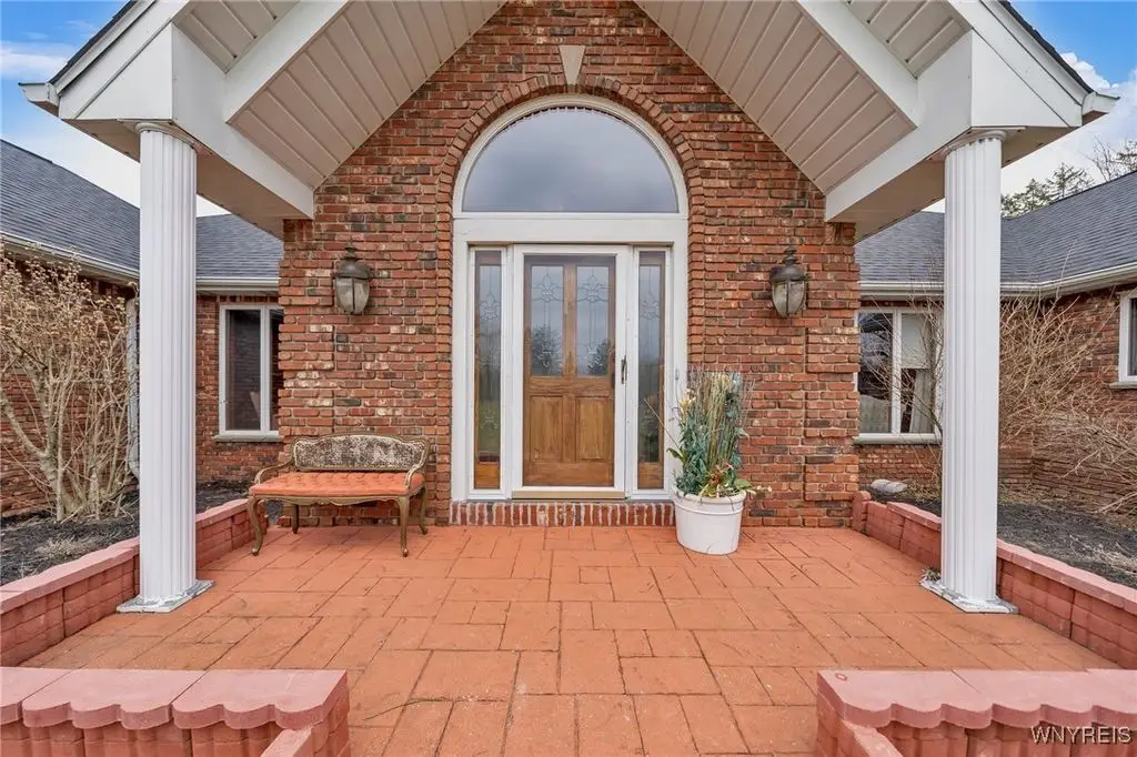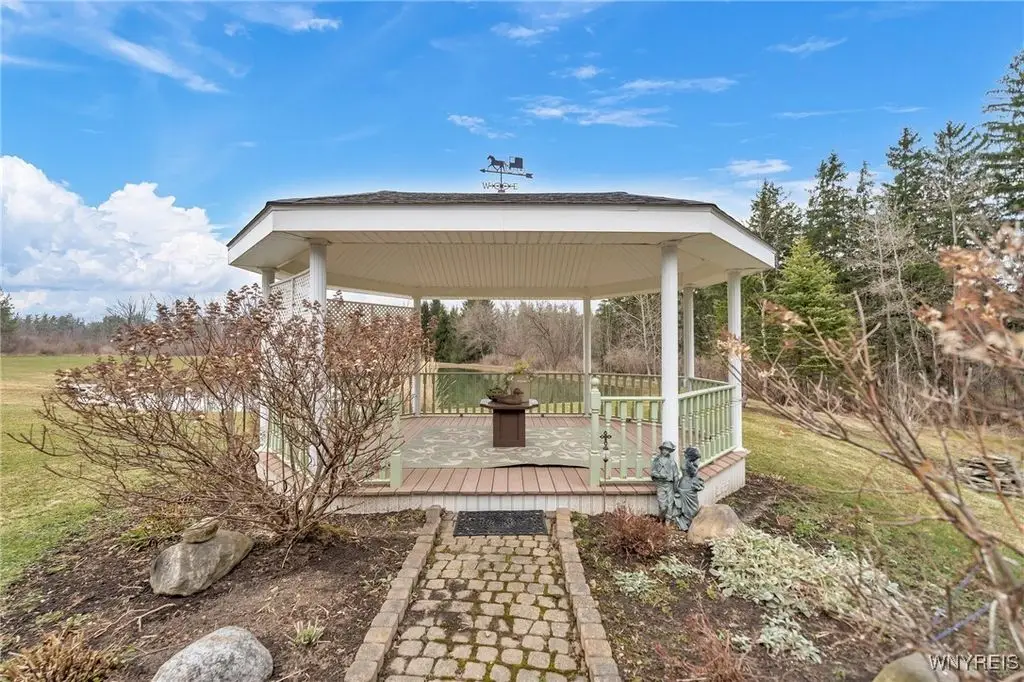 Exquisite all-brick, sprawling ranch nestled on 17 serene, partially wooded acres, complete with a tranquil pond, 3-car garage, in coveted Orchard Park. Enjoy the pond with dock, fountains, gazebo, pergola & wander the wooded trails, surrounded by nature's beauty. Stunning cathedral-ceiling foyer beckons you through double French doors into a majestic Great Room, where soaring wood-lined ceilings & a monumental gas fireplace w/built-ins & a raised hearth set the stage for elegant living. Oak bar, with leaded glass cabinetry, creates the perfect ambiance for hosting unforgettable gatherings. The chef-inspired eat-in kitchen, featuring wood-lined cathedral ceilings, hardwood floors, Cambria quartz island counter & leaded glass doors. This flows into Family Room w/an electric fireplace & Formal Dining area, both of which open through French doors onto a roomy deck. The outdoor space is an entertainer's dream, a pergola, swing, gazebo, fountain, sweeping views of the pond & lush yard. The private primary suite boasts a tray ceiling, walk-in closet, glamour bath bathed in natural light from an abundance of windows with a hint of romance. Guest suite offers cathedral ceilings, its own walk-in closet & private ensuite bath. A convenient 1st-floor laundry room includes modern appliances. The library/den provides a versatile space that could serve as a 3rd bedroom. The lower level is an entertainer's paradise or ideal in-law suite, featuring a vast finished area with a bedroom, spacious walk-in closet, full kitchen w/stove & refrigerator space, a dining area, & a living room with a gas-burning stove. Ceramic-tiled exit from lower-level leads to yard & 3rd garage. Recently updated with a brand-new on-demand HWT '24 & full tear-off roof '24, offering comfort & luxury with its central vacuum system & mini split A/C system. The attached 2.5-car garage is outfitted w/cabinets, sink & is designed for indoor entertainment. A truly a once-in-a-lifetime special opportunity! Offers reviewed as they come in & seller reserves the right to set a deadline for offers. Sq ft was measured by architect - 1st flr = 3162 sq ft. Finished lower-level areas = 1785. Total sq ft is 4947.