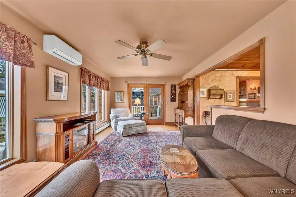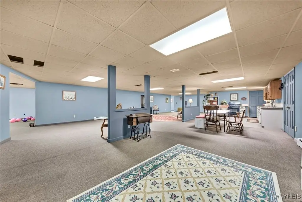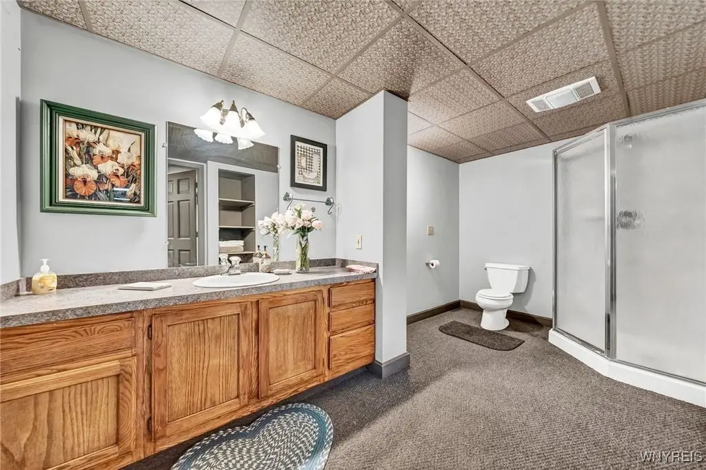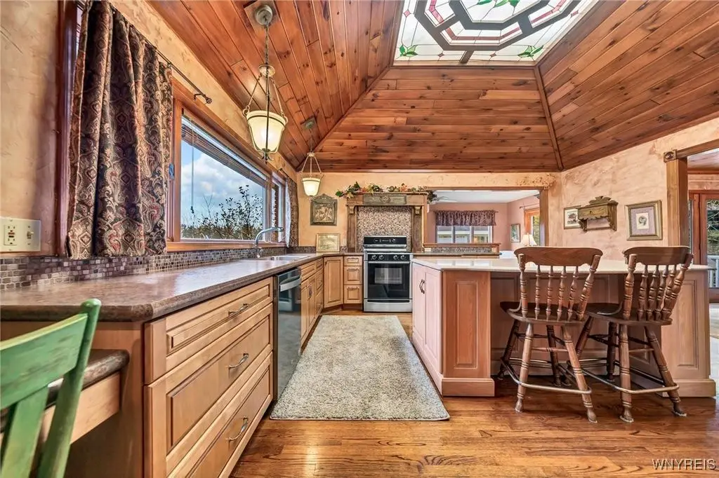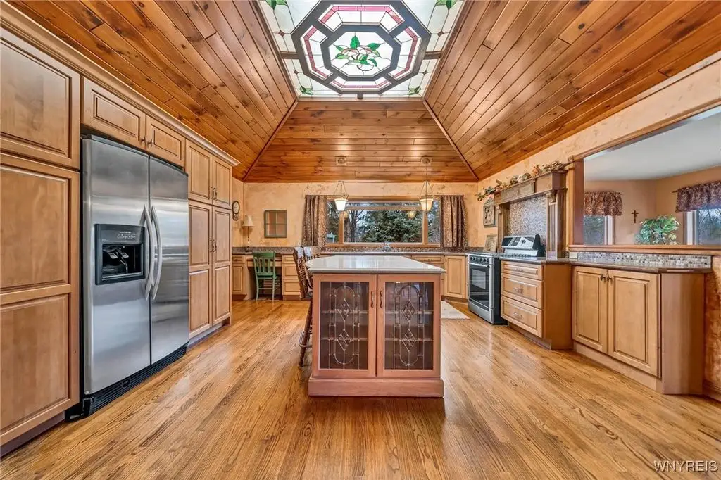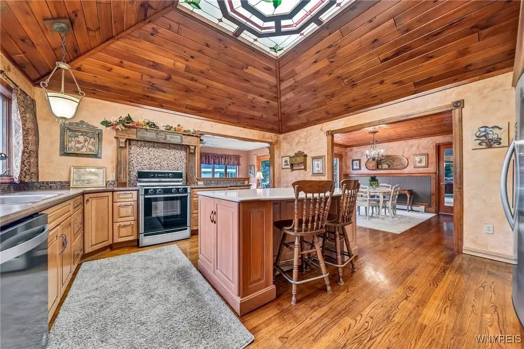 Exquisite all-brick, sprawling ranch nestled on 17 serene, partially wooded acres, complete with a tranquil pond, 3-car garage, in coveted Orchard Park. Enjoy the pond with dock, fountains, gazebo, pergola & wander the wooded trails, surrounded by nature's beauty. Stunning cathedral-ceiling foyer beckons you through double French doors into a majestic Great Room, where soaring wood-lined ceilings & a monumental gas fireplace w/built-ins & a raised hearth set the stage for elegant living. Oak bar, with leaded glass cabinetry, creates the perfect ambiance for hosting unforgettable gatherings. The chef-inspired eat-in kitchen, featuring wood-lined cathedral ceilings, hardwood floors, Cambria quartz island counter & leaded glass doors. This flows into Family Room w/an electric fireplace & Formal Dining area, both of which open through French doors onto a roomy deck. The outdoor space is an entertainer's dream, a pergola, swing, gazebo, fountain, sweeping views of the pond & lush yard. The private primary suite boasts a tray ceiling, walk-in closet, glamour bath bathed in natural light from an abundance of windows with a hint of romance. Guest suite offers cathedral ceilings, its own walk-in closet & private ensuite bath. A convenient 1st-floor laundry room includes modern appliances. The library/den provides a versatile space that could serve as a 3rd bedroom. The lower level is an entertainer's paradise or ideal in-law suite, featuring a vast finished area with a bedroom, spacious walk-in closet, full kitchen w/stove & refrigerator space, a dining area, & a living room with a gas-burning stove. Ceramic-tiled exit from lower-level leads to yard & 3rd garage. Recently updated with a brand-new on-demand HWT '24 & full tear-off roof '24, offering comfort & luxury with its central vacuum system & mini split A/C system. The attached 2.5-car garage is outfitted w/cabinets, sink & is designed for indoor entertainment. A truly a once-in-a-lifetime special opportunity! Offers reviewed as they come in & seller reserves the right to set a deadline for offers. Sq ft was measured by architect - 1st flr = 3162 sq ft. Finished lower-level areas = 1785. Total sq ft is 4947.