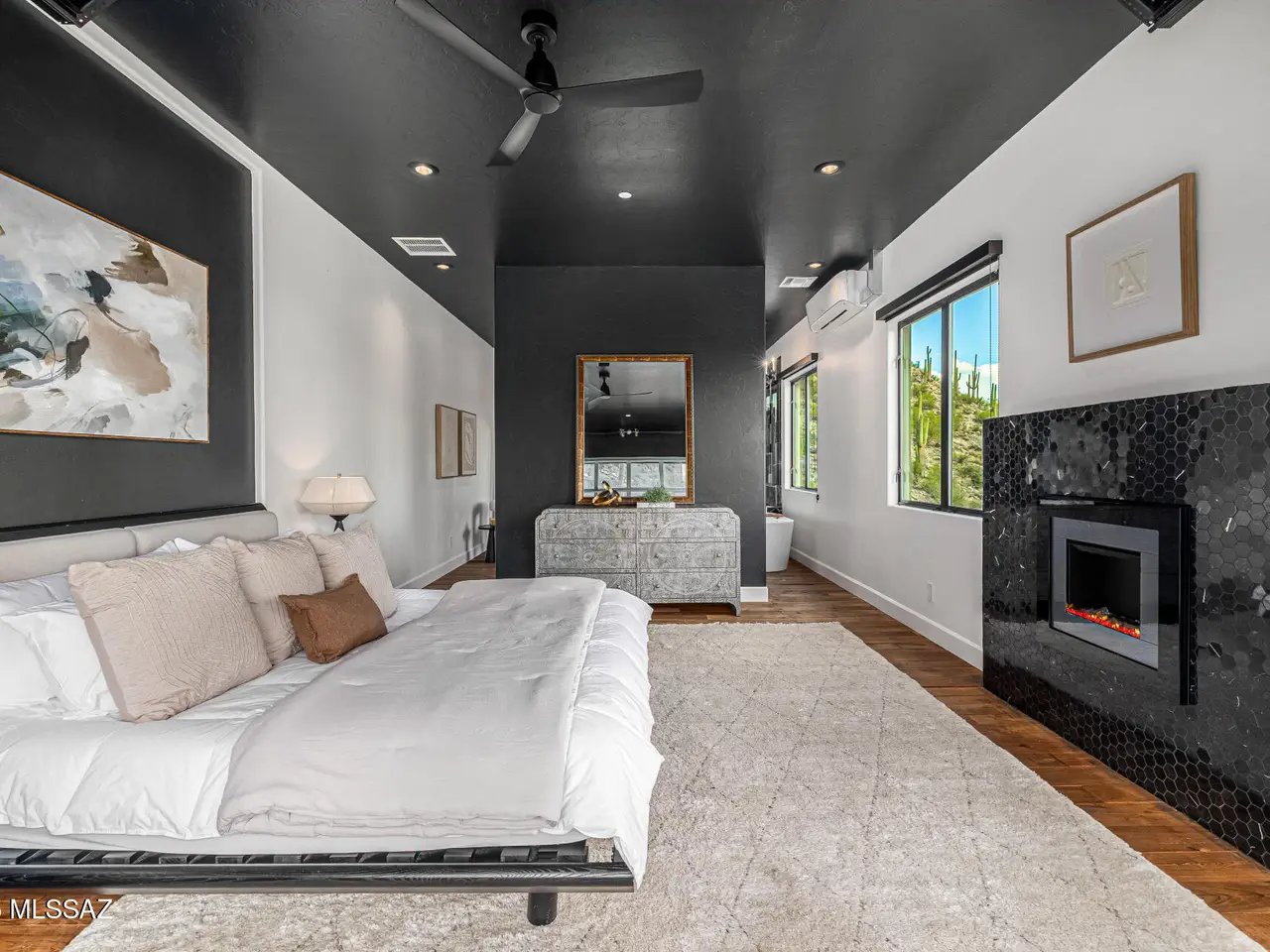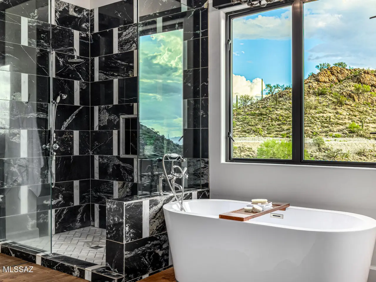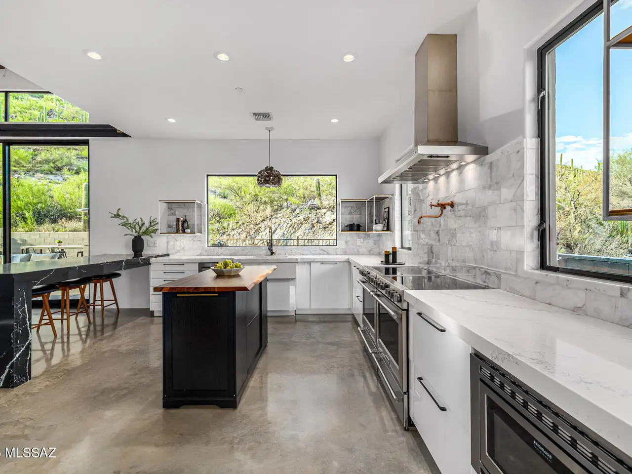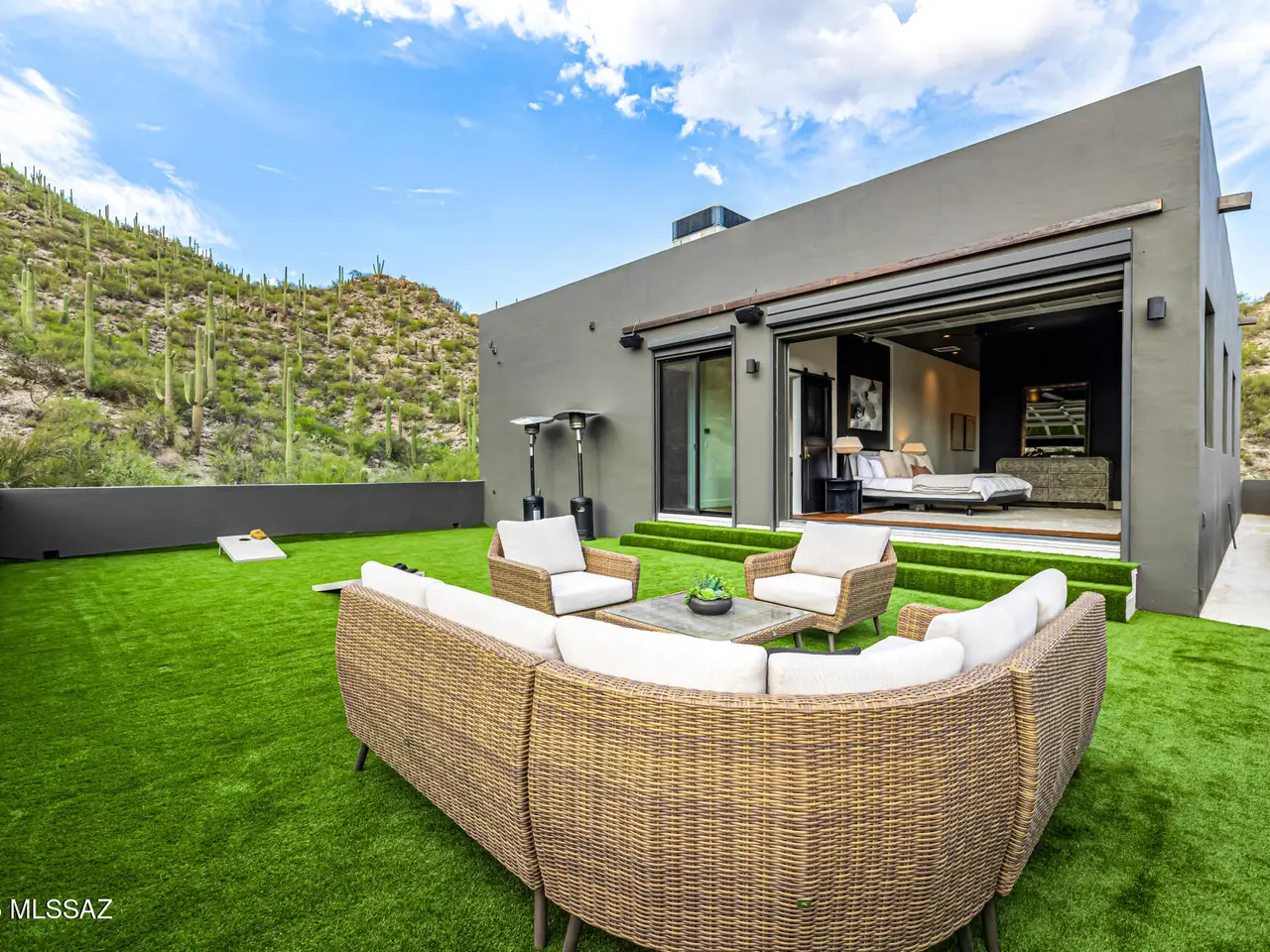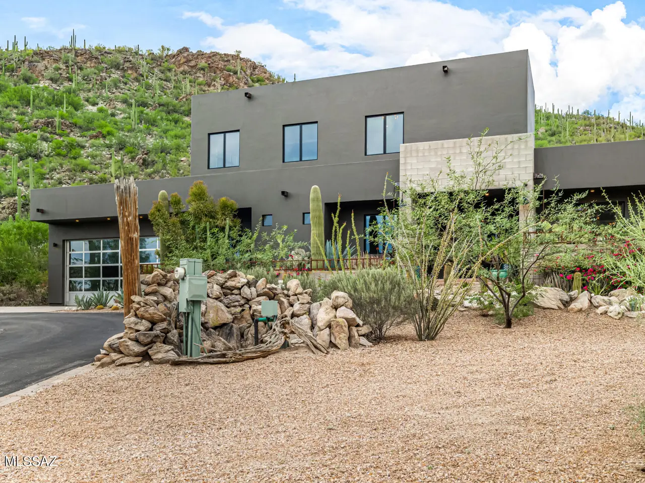 Nestled deep in the scenic Tortolita Mountains, this fully custom-built 2018 estate combines refined design with extensive upgrades inside and out. The property welcomes you with an asphalt driveway, elegant paver accents, and professionally landscaped grounds featuring outdoor lighting, solar lamps, a decorative fountain, and a custom-finished front entry. All the doors used in the home were from the historic Hotel Hidalgo! The roof has been resealed and the exteriors freshly repainted. Enjoy resort-style outdoor living with a sparkling pool (new heater), a mesquite-mantle fireplace with a custom screen, propane starter, built-in barbecue mechanics, and decorative fencing. Set against a backdrop of untouched desert beauty, the estate offers breathtaking 360-degree panoramic views of Tortolita Mountains. Expansive windows and outdoor living spaces capture glowing sunrises, dramatic sunsets, and sparkling city lights after dark. Natural desert wildlife surrounds the property, creating a private sanctuary with a front-row seat to the beauty of the Sonoran Desert. Inside, the upgrades continue with quartz kitchen countertops, a waterfall island, refinished cabinetry and hutch, and updated hardware and lighting. The great room showcases a propane fireplace setup with custom logs, while electrical dimmers and halogen bulbs create ambiance throughout. Additional features include refinished teak entry doors with glass panels, repainted interior doors and ceilings, ceiling fans in all bedrooms, a staircase runner, and polished concrete floors. Comfort is maximized with mini-splits in the master and first-floor bedrooms, as well as Tucson rolling shutter blinds in every bedroom plus electronic rolling shutter for the master suite's large glass doors and the second-floor landing. Perfectly designed for entertaining, the home is wired for interior and exterior sound, blending luxury, function, and style at every turn. This is a true desert sanctuary, offering both sophistication and serenity.