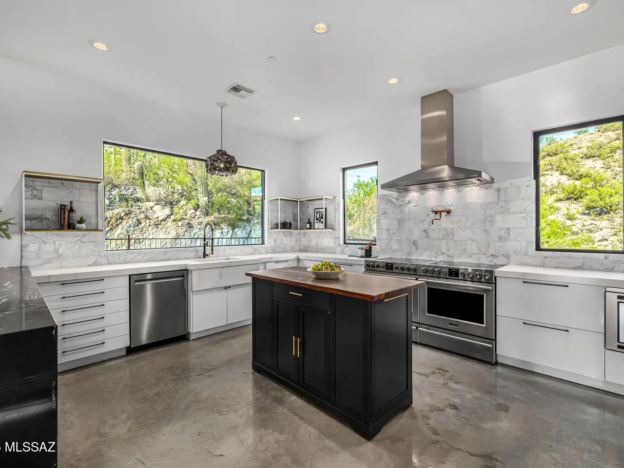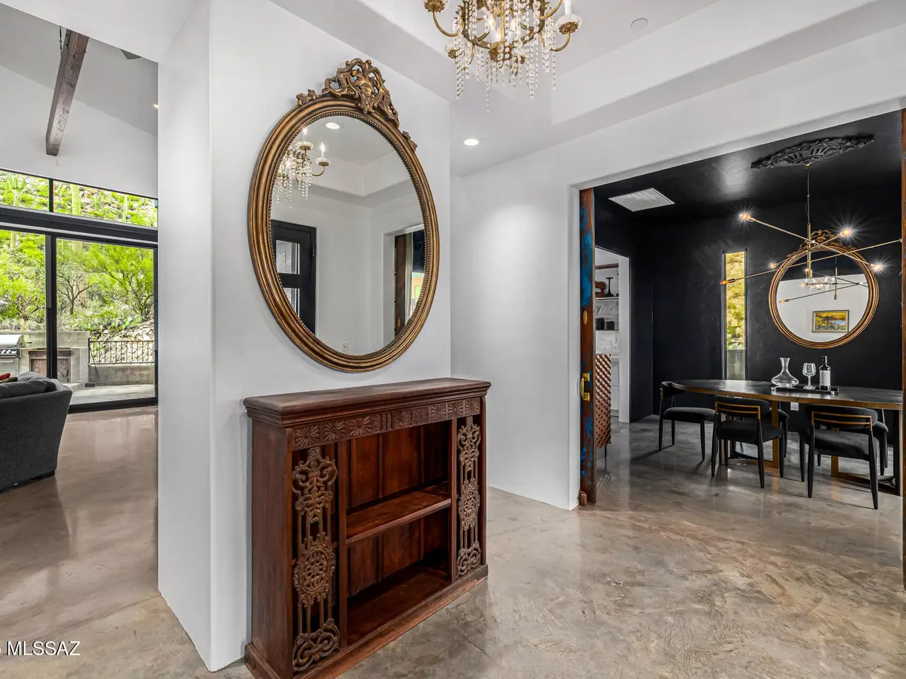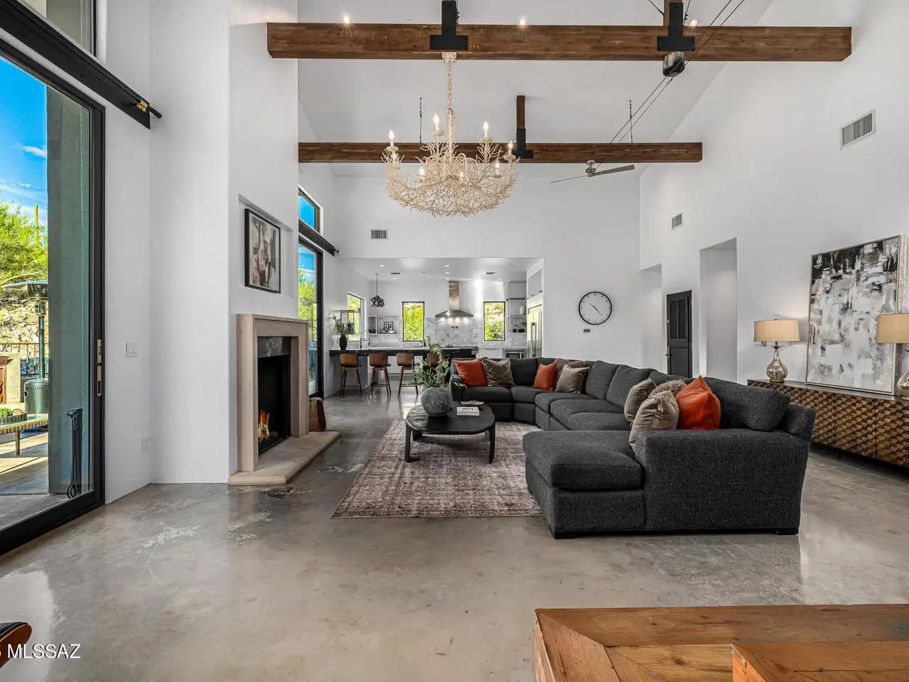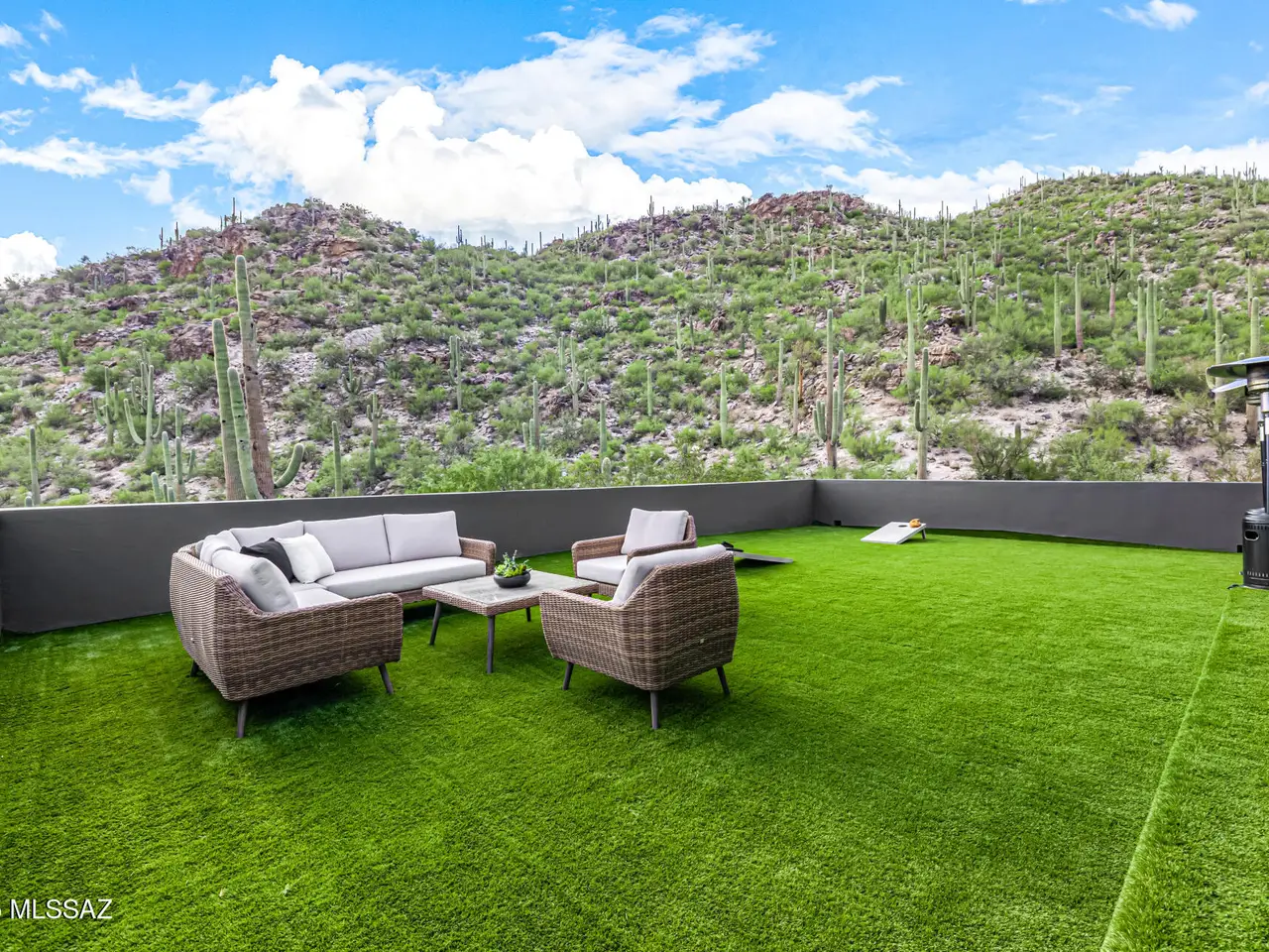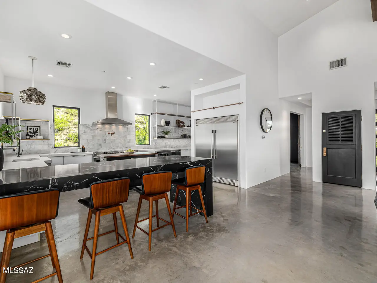 Nestled deep in the scenic Tortolita Mountains, this fully custom-built 2018 estate combines refined design with extensive upgrades inside and out. The property welcomes you with an asphalt driveway, elegant paver accents, and professionally landscaped grounds featuring outdoor lighting, solar lamps, a decorative fountain, and a custom-finished front entry. All the doors used in the home were from the historic Hotel Hidalgo! The roof has been resealed and the exteriors freshly repainted. Enjoy resort-style outdoor living with a sparkling pool (new heater), a mesquite-mantle fireplace with a custom screen, propane starter, built-in barbecue mechanics, and decorative fencing. Set against a backdrop of untouched desert beauty, the estate offers breathtaking 360-degree panoramic views of Tortolita Mountains. Expansive windows and outdoor living spaces capture glowing sunrises, dramatic sunsets, and sparkling city lights after dark. Natural desert wildlife surrounds the property, creating a private sanctuary with a front-row seat to the beauty of the Sonoran Desert. Inside, the upgrades continue with quartz kitchen countertops, a waterfall island, refinished cabinetry and hutch, and updated hardware and lighting. The great room showcases a propane fireplace setup with custom logs, while electrical dimmers and halogen bulbs create ambiance throughout. Additional features include refinished teak entry doors with glass panels, repainted interior doors and ceilings, ceiling fans in all bedrooms, a staircase runner, and polished concrete floors. Comfort is maximized with mini-splits in the master and first-floor bedrooms, as well as Tucson rolling shutter blinds in every bedroom plus electronic rolling shutter for the master suite's large glass doors and the second-floor landing. Perfectly designed for entertaining, the home is wired for interior and exterior sound, blending luxury, function, and style at every turn. This is a true desert sanctuary, offering both sophistication and serenity.