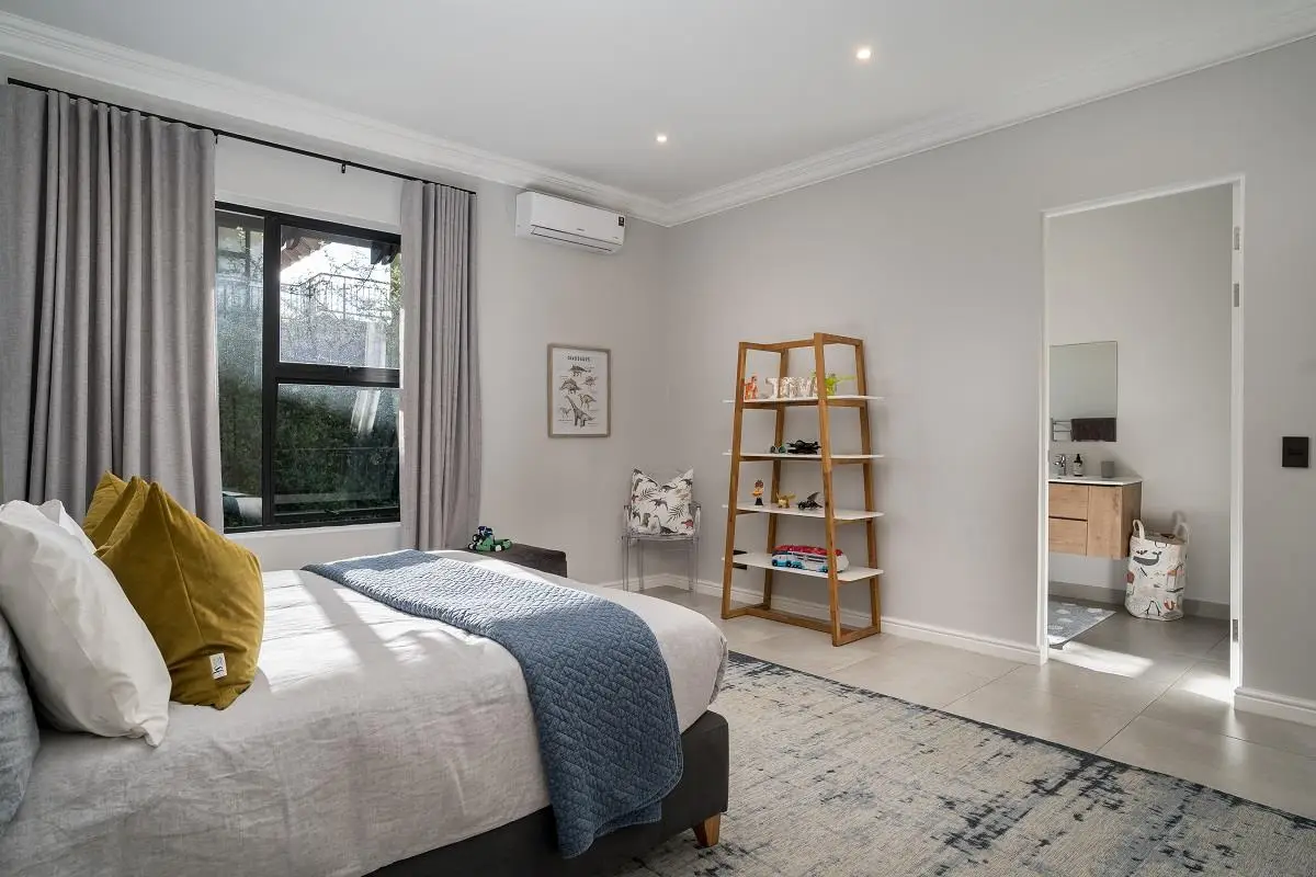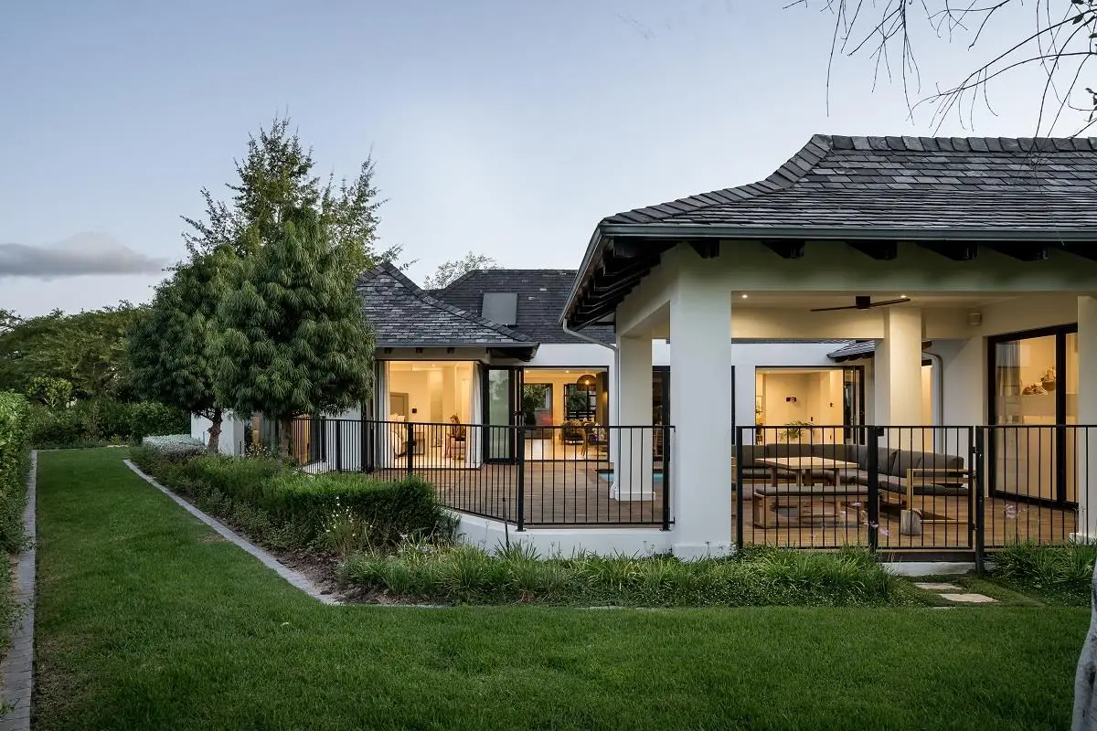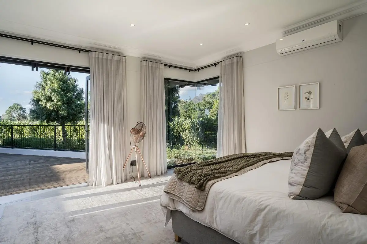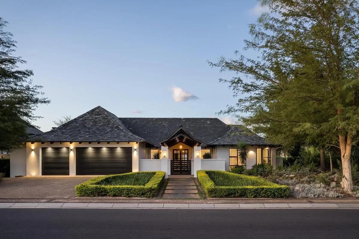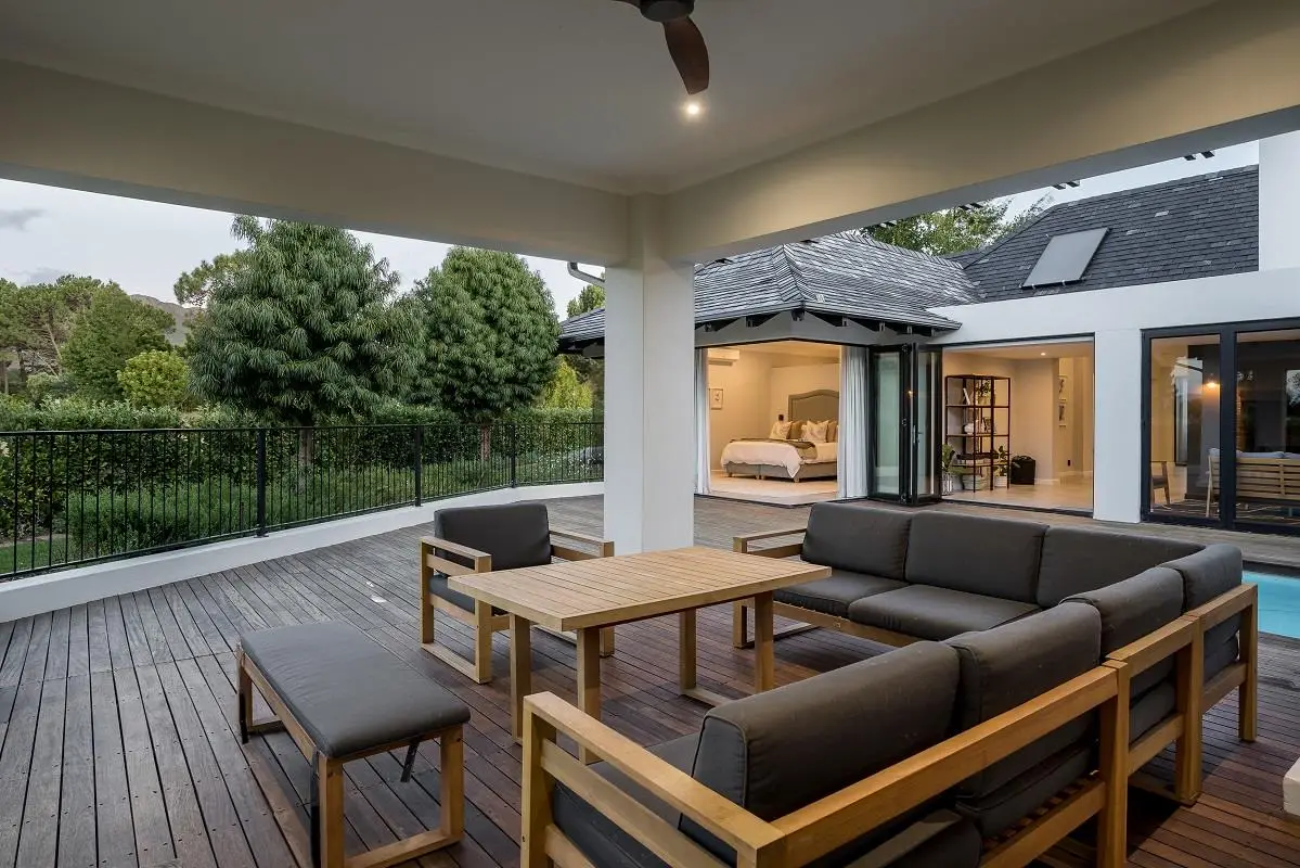 THIS BEAUTIFUL MODERN PROPERTY EPITOMISES WHAT ONE WOULD CALL A FAMILY HOME Stylishly renovated, this single level North facing home is well positioned on a corner stand with privacy and beautiful views towards the open green spaces of fairways and the members driving range. A welcoming entrance of a canopied lush garden leads to the front door. On entering the home the openness, lightness, modern clean lines and finishes give a fresh appeal and a feeling of space. The living space is designed for entertaining with a seamless flow from the well designed kitchen, the dining and lounge areas to glass stacking doors which open to a wooden deck and pool. An indoor braai, perfect for summer and winter use, completes this space and a covered area on the wooden deck adds an additional seating area with all flowing so well together to make the perfect spaces for family living and for entertaining. This beautiful home offers 4 well sized bedrooms all with ensuites, a large audio visual room, a study, a guest cloakroom, spacious open plan living areas and kitchen, utility room, triple garage, staff accommodation, invertor system, solar geyser and a well established garden. A rare opportunity to own a fully renovated and well positioned family home within the exclusive Pearl Valley Golf Estate.