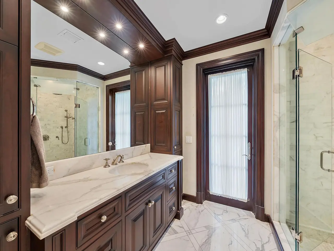 Discover this exquisite West Indies-style home, built and finished by Leeds Custom Design, and nestled on a picturesque 1/3-acre lot. An inviting open great room welcomes you, featuring a dual-sided fireplace that elegantly connects to the dining area. The kitchen is a culinary dream, showcasing a state-of-the-art Wentworth kitchen with Wolf, Sub-Zero, and Miele appliances, along with a large island and cozy breakfast area. The family room, complete with a home theater, is adjacent to a relaxing covert loggia with a beautiful wall fountain. Retreat to the primary suite, which exudes elegance with two ensuite bathrooms. All other bedrooms, each with an ensuite bath, are located on the second floor for added privacy.