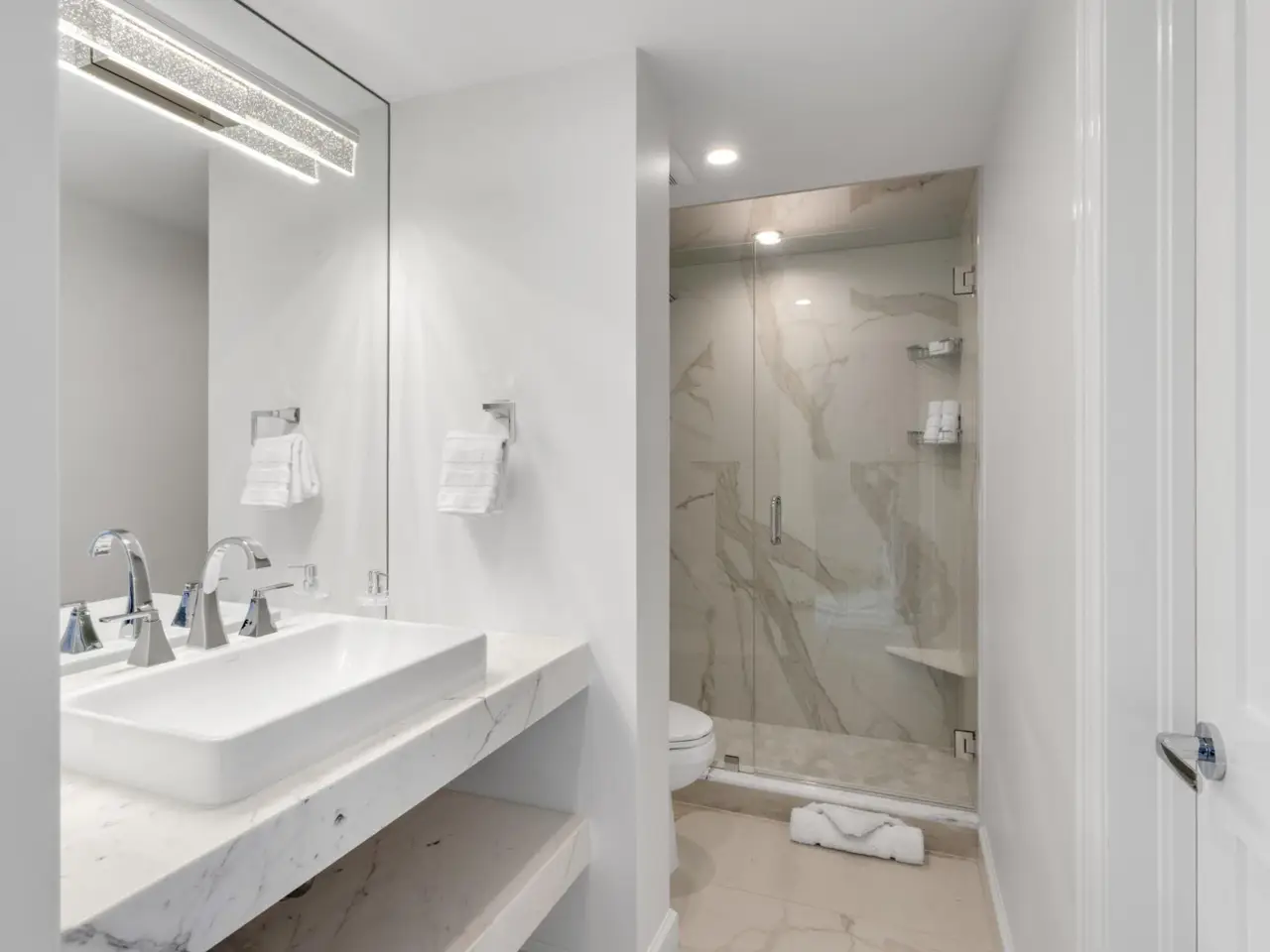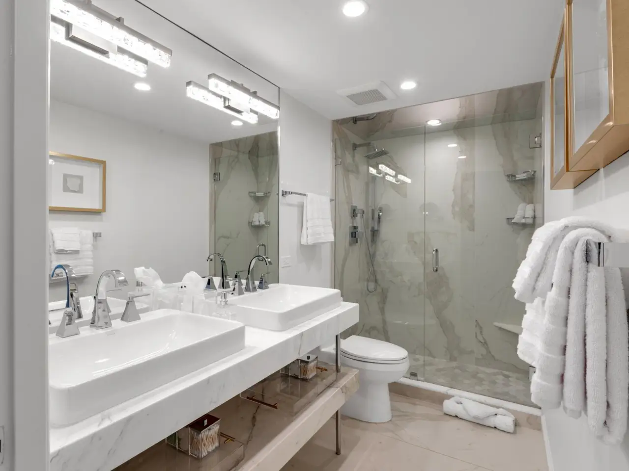 Marble bathrooms with custom floating vanities
