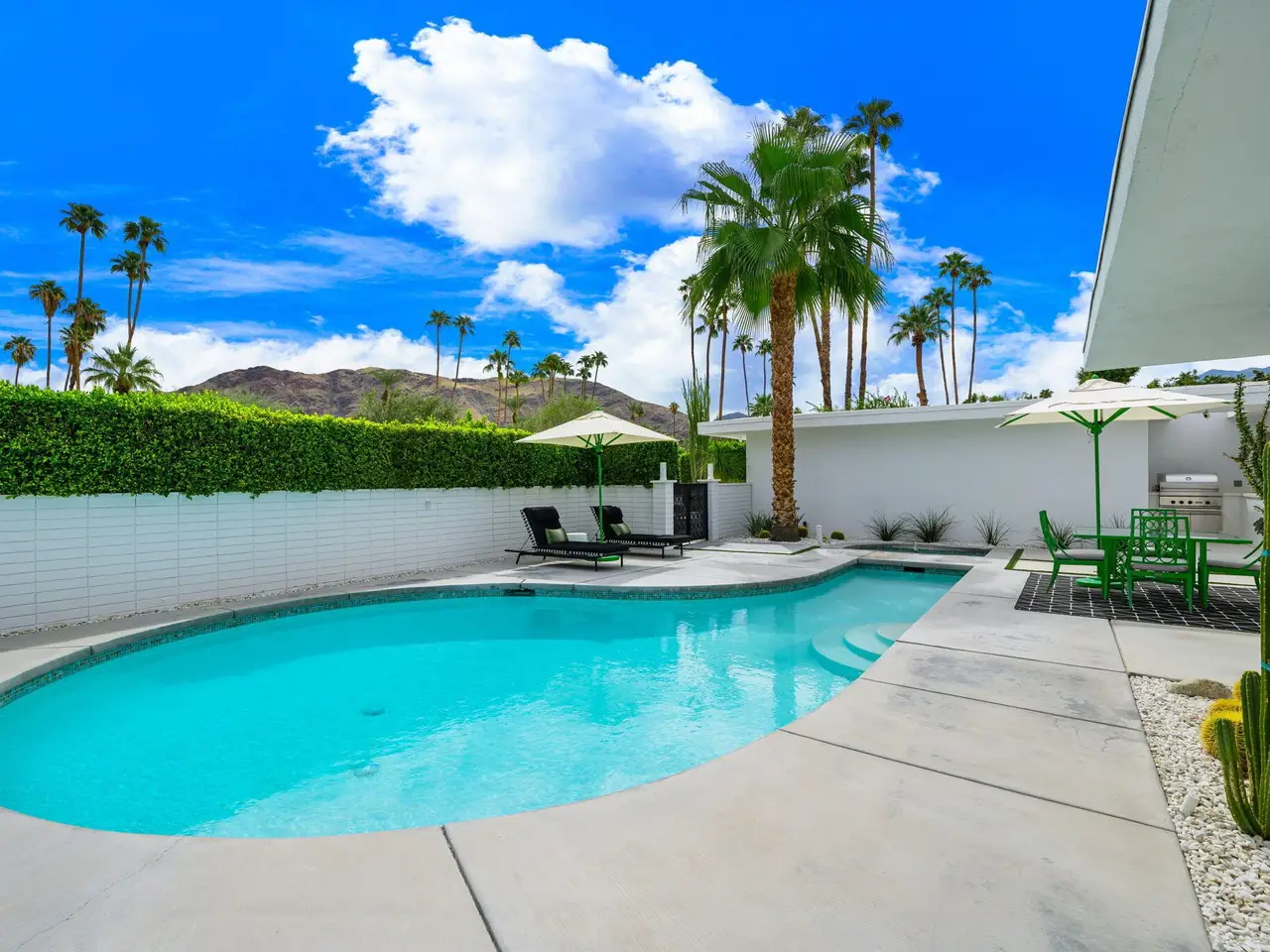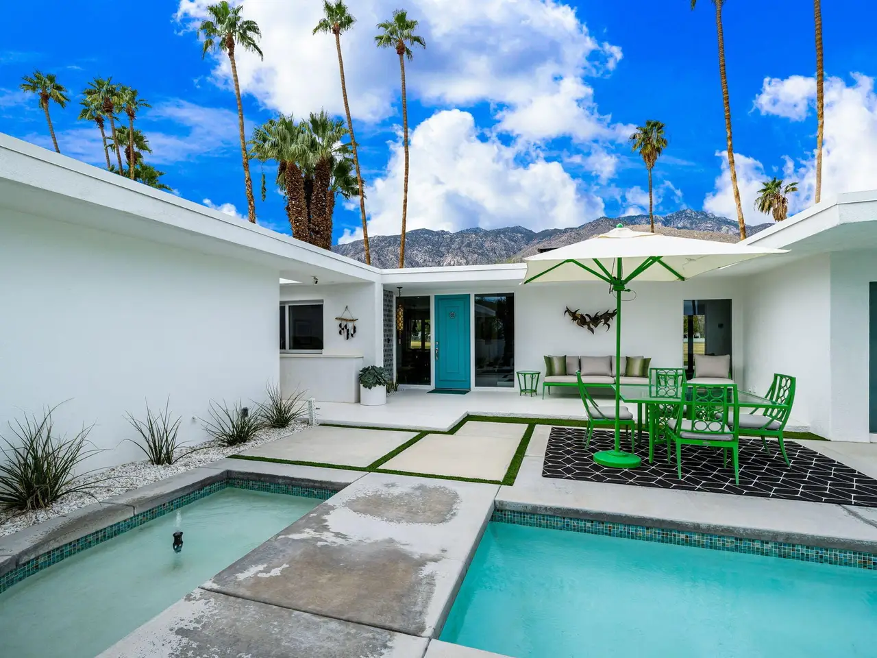This exceptional midcentury residence is located on the 17th fairway of the Indian Canyons golf course in South Palm Springs, offering 360-degree mountain views. Meticulously remodeled by renowned Palm Springs designer Christopher Kennedy and previously showcased as the Modernism Week Showhouse, this home seamlessly integrates stunning La Cantina folding and pocketing glass doors to frame the spectacular fairway and mountain vistas. The property features multiple elegantly appointed outdoor living areas, including a convenient pass-through window from the kitchen for effortless entertaining. Upgrades include new front gates, a dedicated catering kitchen adjacent to the main social kitchen equipped with Wolf and Sub-Zero appliances, two dishwashers, and premium plumbing fixtures from Dornbracht, Brizio, and Duravit. Additional highlights include designer wall treatments, custom window coverings, bespoke cabinetry in the fully finished garage, a 35-panel owned solar system, automated blinds, and oversized porcelain slabs throughout the exterior spaces. Situated in one of Palm Springs' most desirable neighborhoods, this home exemplifies sophisticated, high-end design.