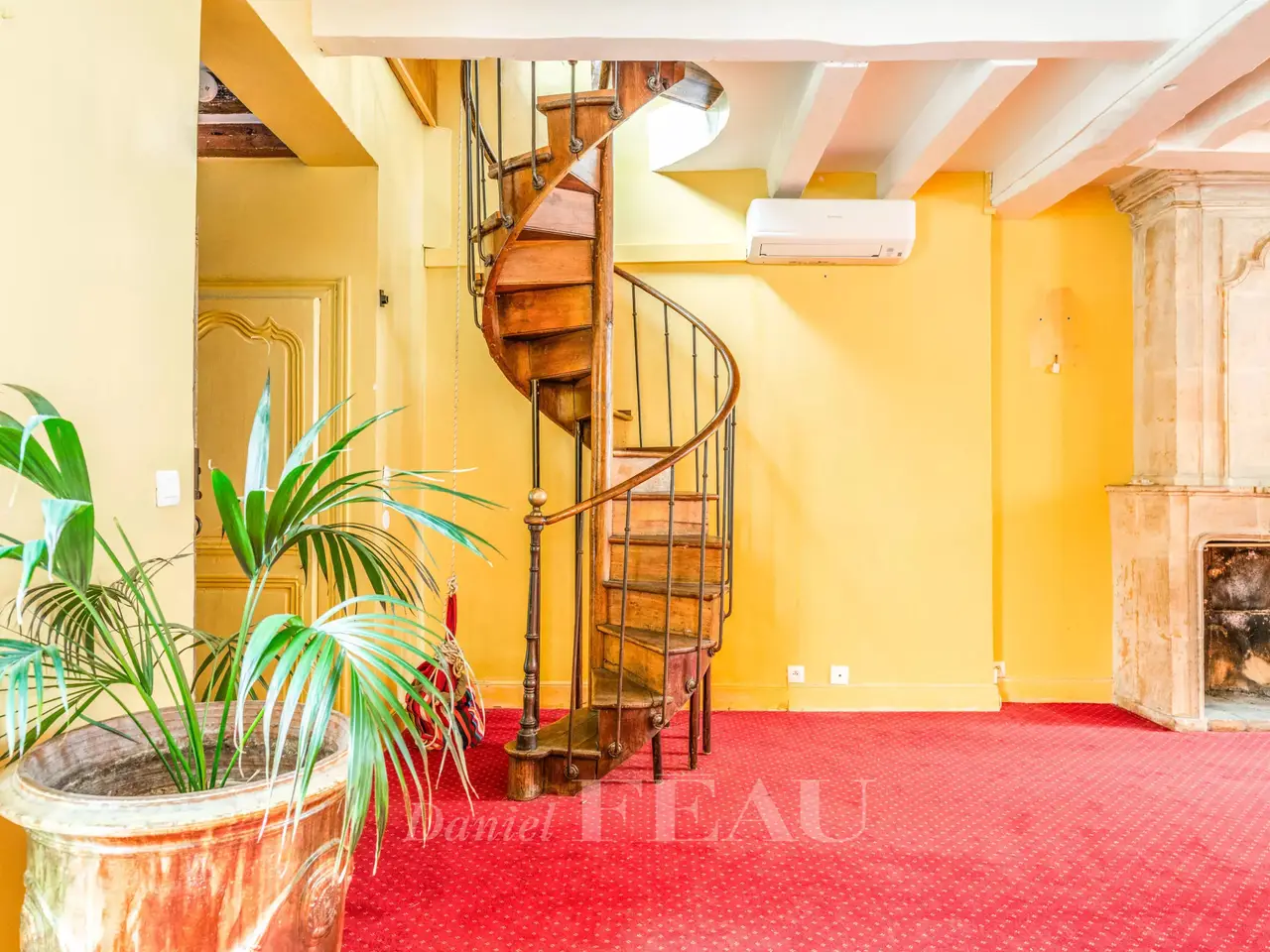 Between Notre Dame Cathedral and the Panthéon. This atypical apartment offering 118 sqm of bright and peaceful floor space and 108 sqm of living space as defined by the Carrez Law is on the 4th and top floor of a late 19th century building with a lift. Enjoying an open view over the rooftops, it includes a spacious living/reception room, a kitchen with dining facilities, a bedroom with a shower room, and a separate wc. Upstairs are two rooms including a master suite with a bathroom, both of which open onto a sunny terrace. A roof terrace commanding a panoramic view of the capital’s iconic landmarks is on the top floor. Henri IV catchment area.