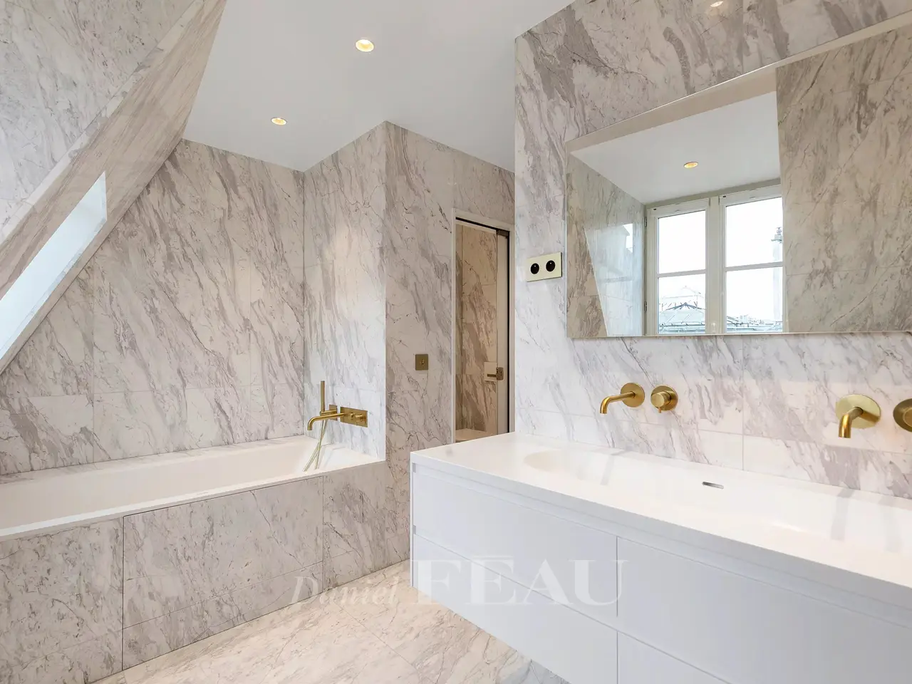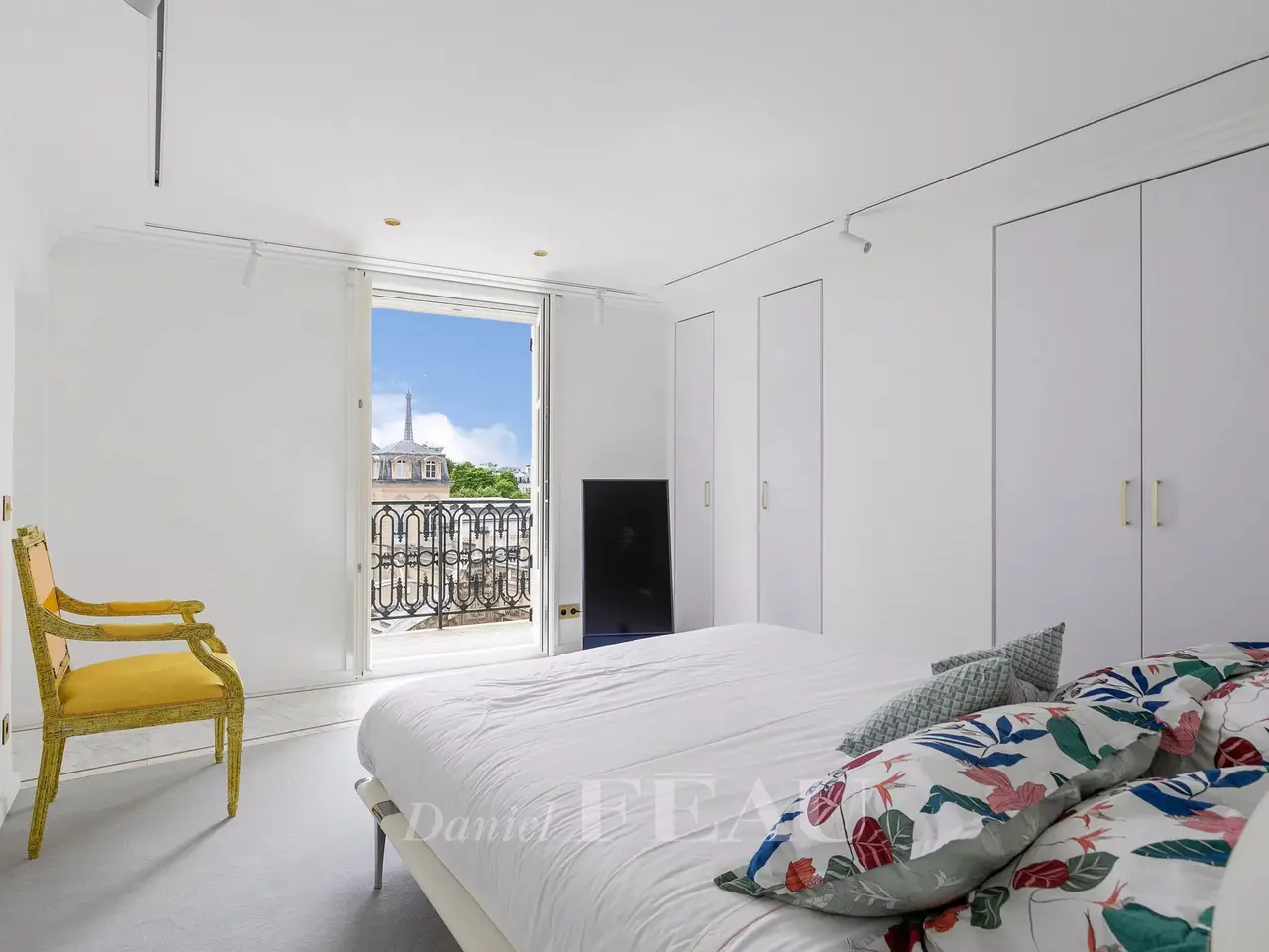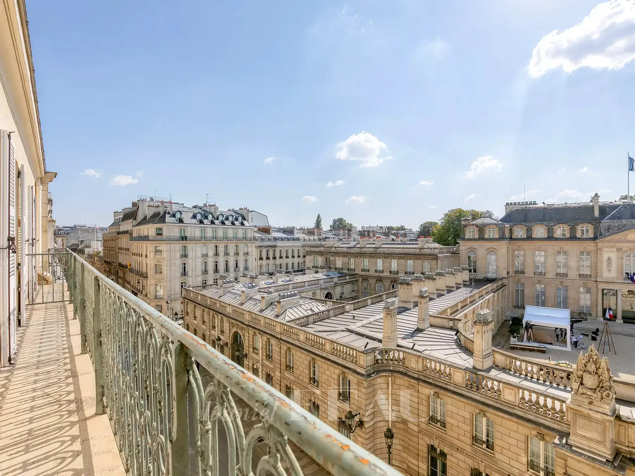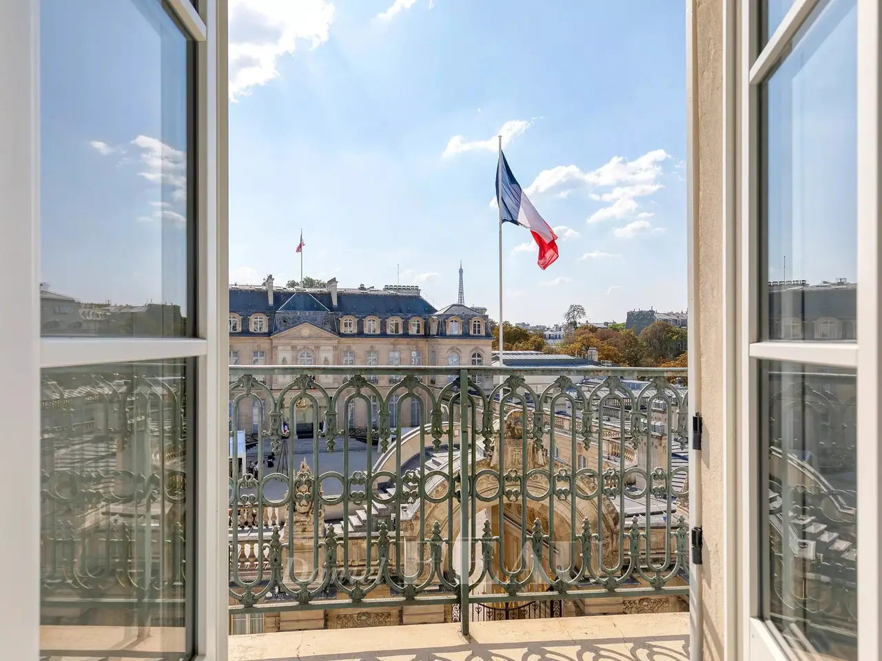 This south-west facing apartment on the top two floors of a secure 19th century building commands a stunning view of the Elysée Palace and the Eiffel Tower. 225 sqm of air-conditioned floor space and 206 sqm of living space as defined by the Carrez Law includes a double living/reception room opening onto a balcony, an open-plan kitchen, three suites with a bathroom/wc, a study with a skylight, a dressing room, a guest wc and a utility room. The apartment has been renovated in a tasteful contemporary style. With two cellars.